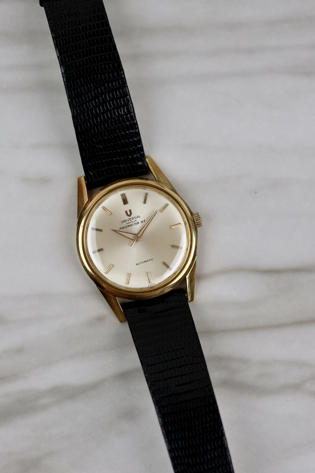 This particular piece comes in warm 18k yellow gold, with a silver sunburst dial that catches light just right. The applied hour markers and dauphine hands give it a crisp, mid-century feel, and the subtle “U” logo at twelve o’clock is pure Universal Genève charm. Inside, you’ll likely find one of their early micro-rotor movements — an engineering trick that let them keep things thin while still fully automatic.