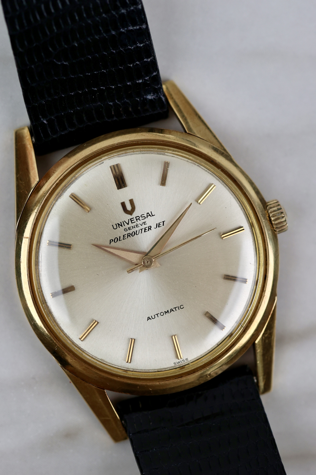 Here’s a little piece of golden jet-age charm — the Universal Genève Polerouter Jet, reference 10379/2, in solid 18k gold. Born in the late 1950s, this refined version of the original Polerouter was made for those who liked their watches just a bit sleeker. The Jet line trimmed things down with a slimmer case profile and more elongated lugs, while keeping all the good looks that made the Polerouter famous.