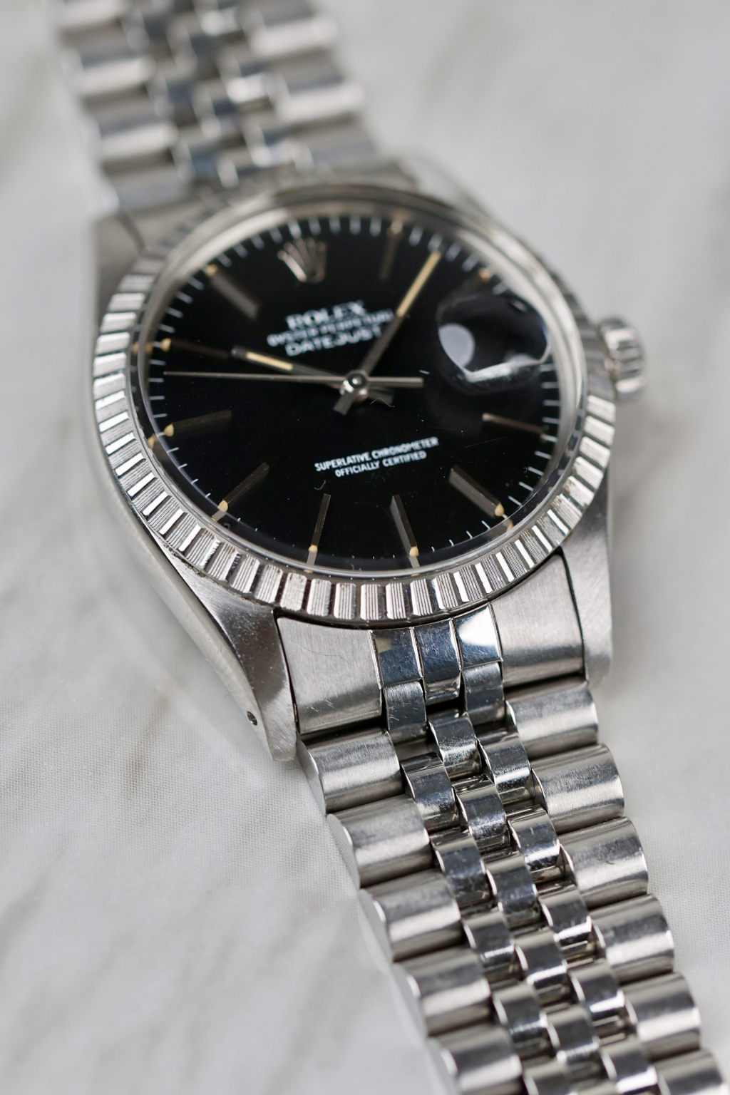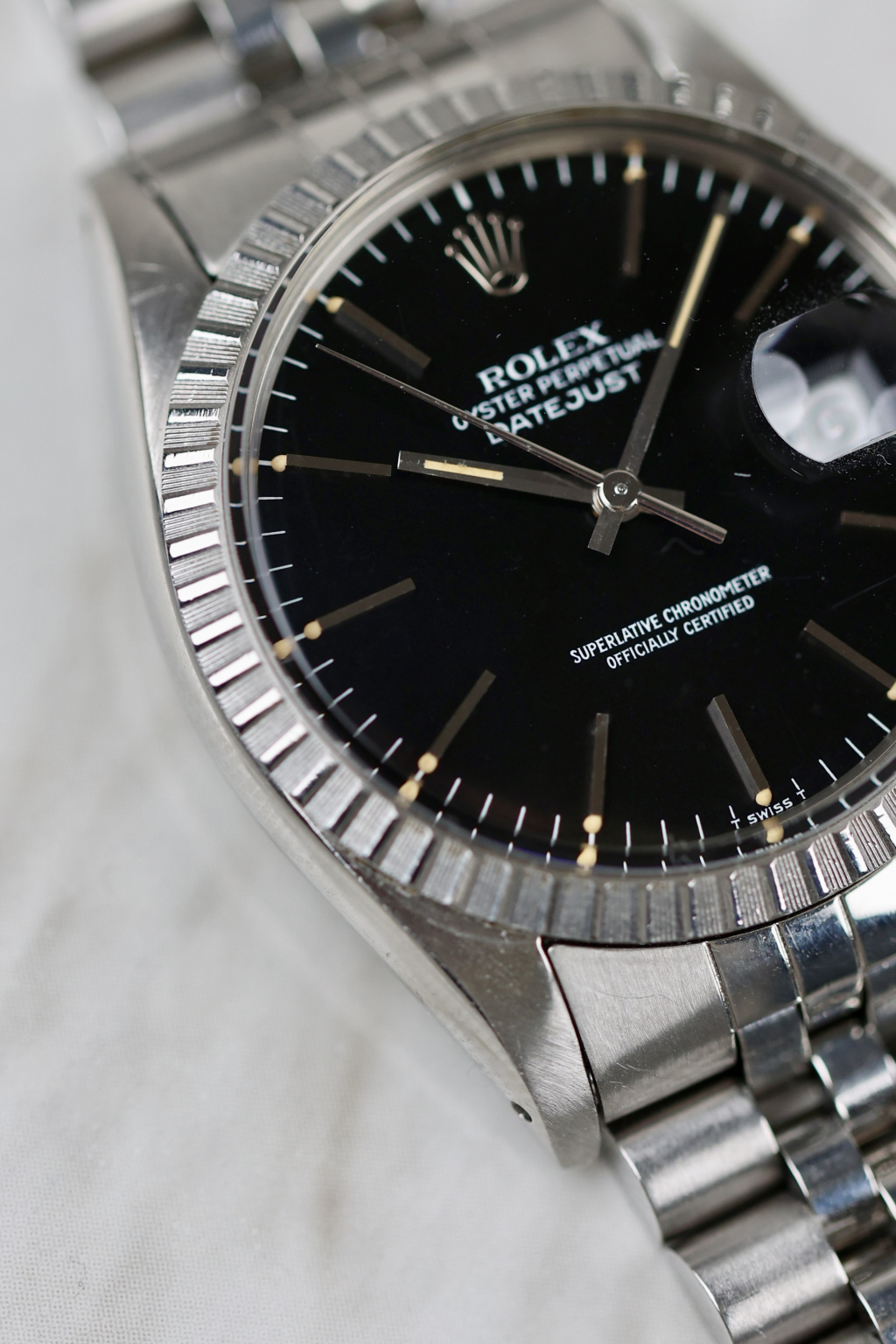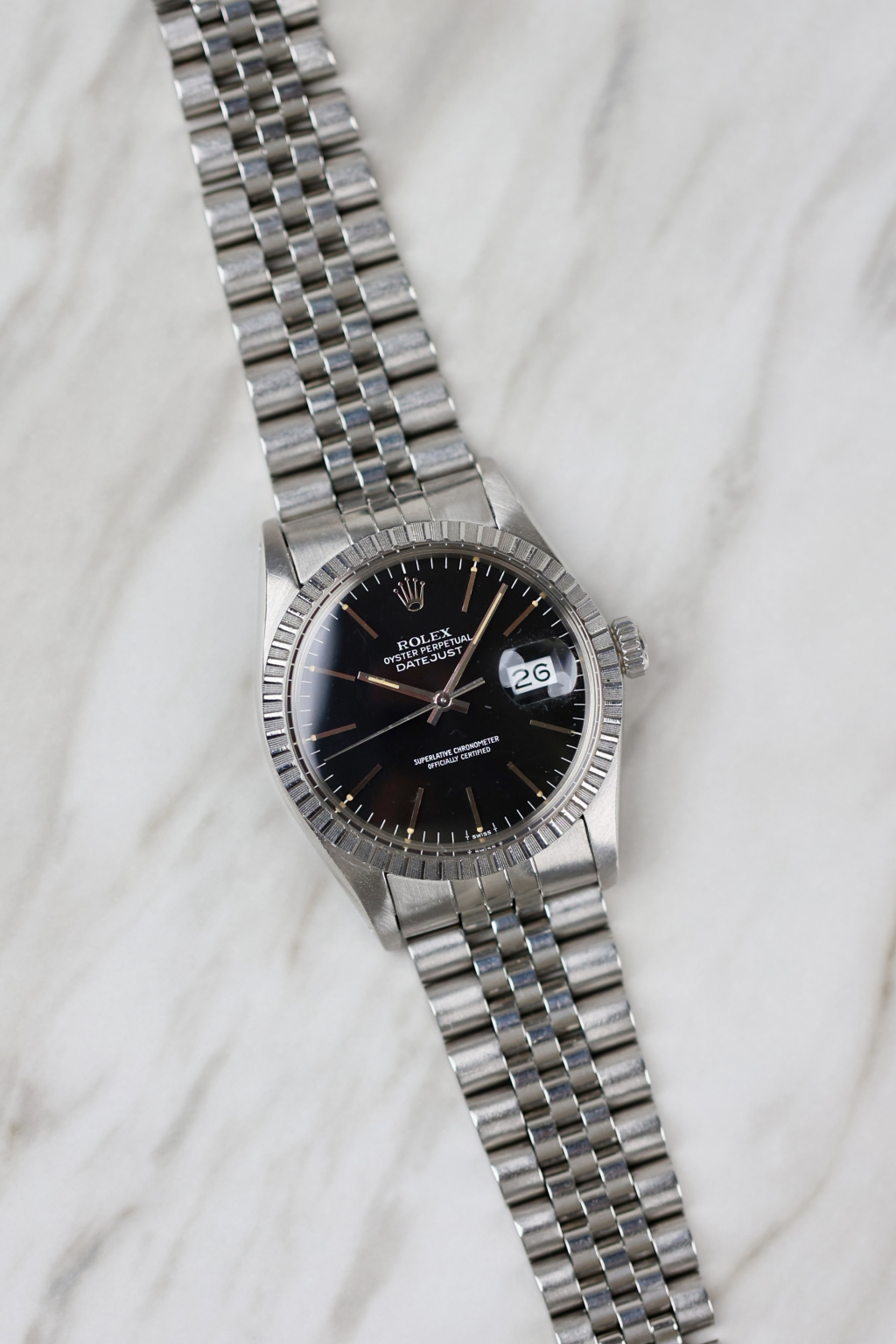 This striking Rolex Datejust Ref. 16030 stands out with its uncommon black metallic dial. A rare and captivating variation that plays beautifully with the light. Produced in the early 1980s, it features all the hallmarks of the classic 16030: a 36 mm stainless steel Oyster case, engine-turned bezel, quickset date, and the robust automatic movement 3035. The lume plots have aged perfectly, showing a warm, even patina that matches the tone of the original hands. Fitted with a 62510H Jubilee bracelet and a “G”-stamped clasp (1982), this configuration is period-correct for a Datejust produced around 1984, when Rolex commonly used pre-produced bracelet parts in later assemblies.