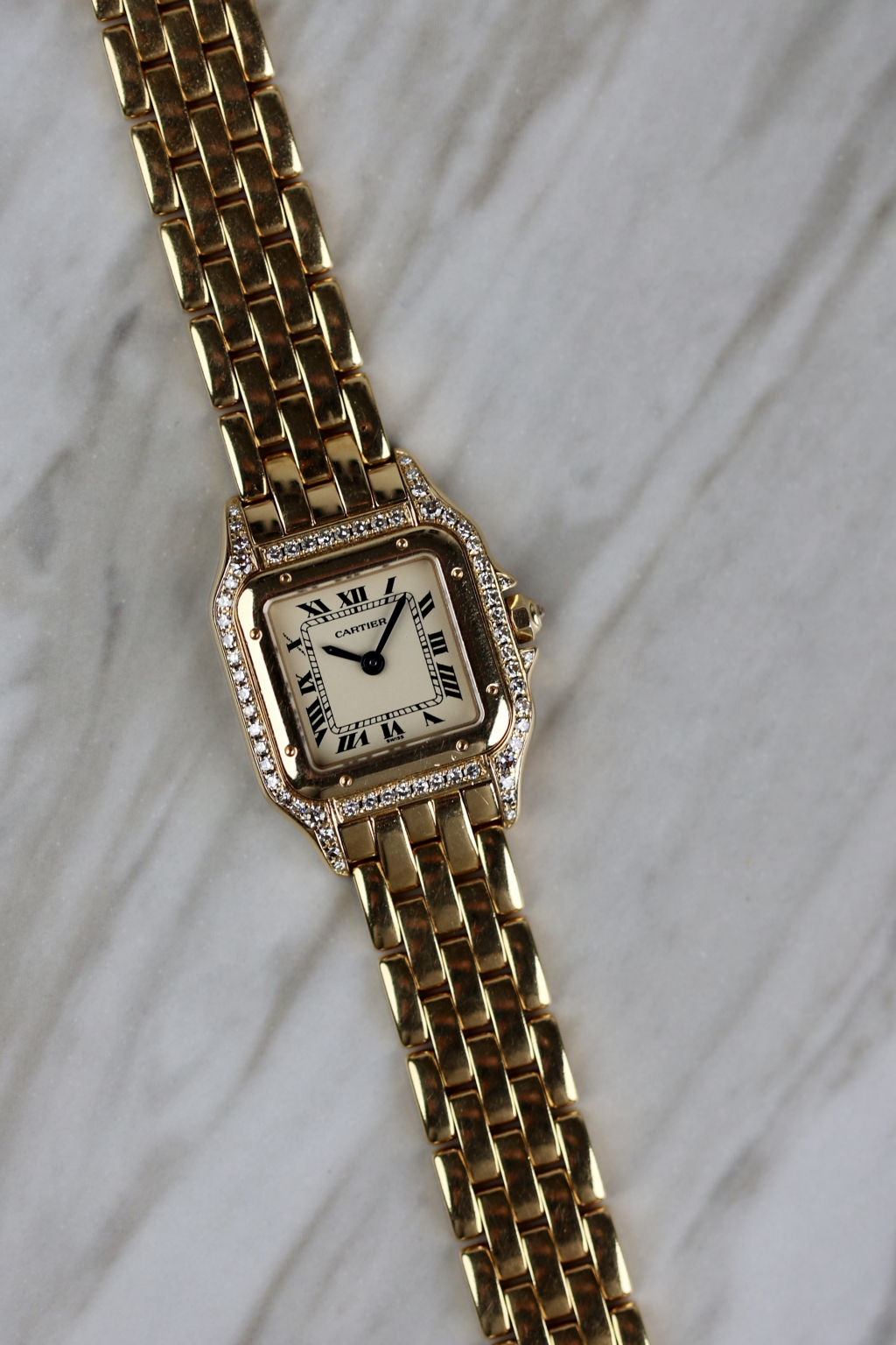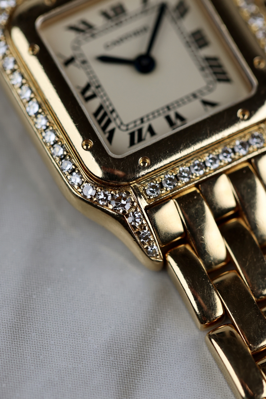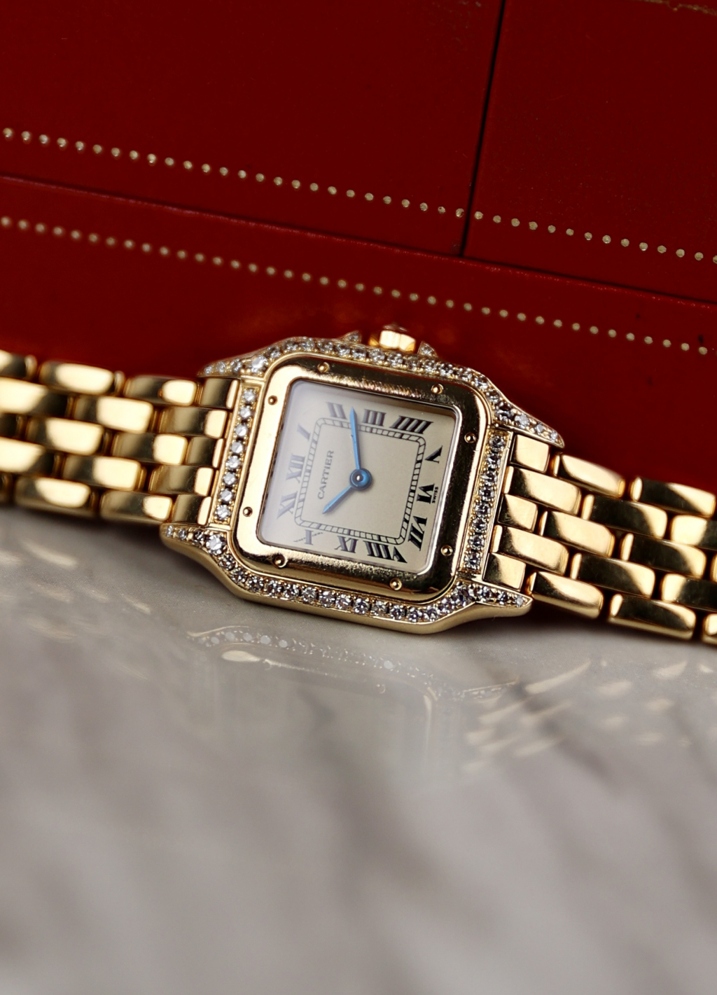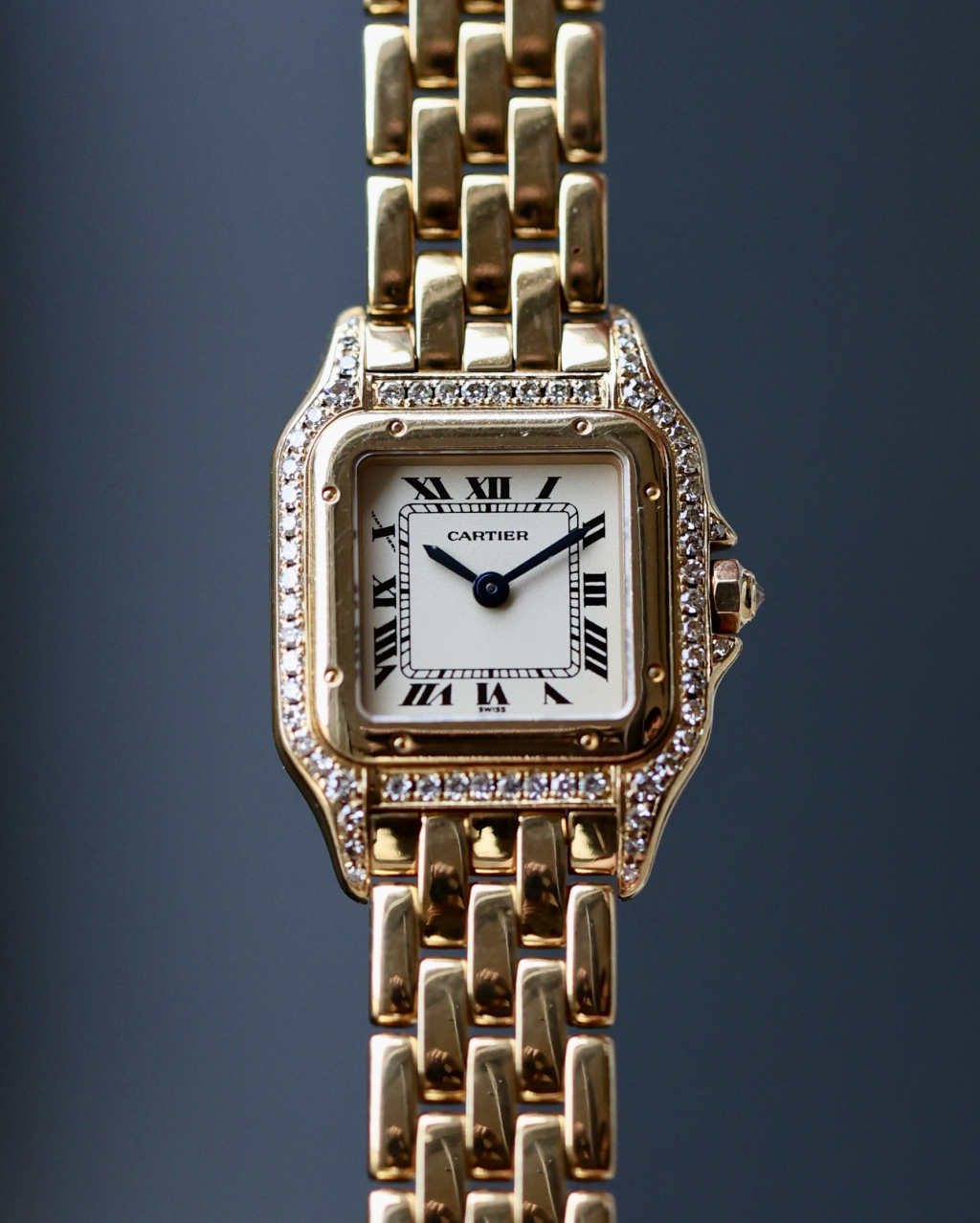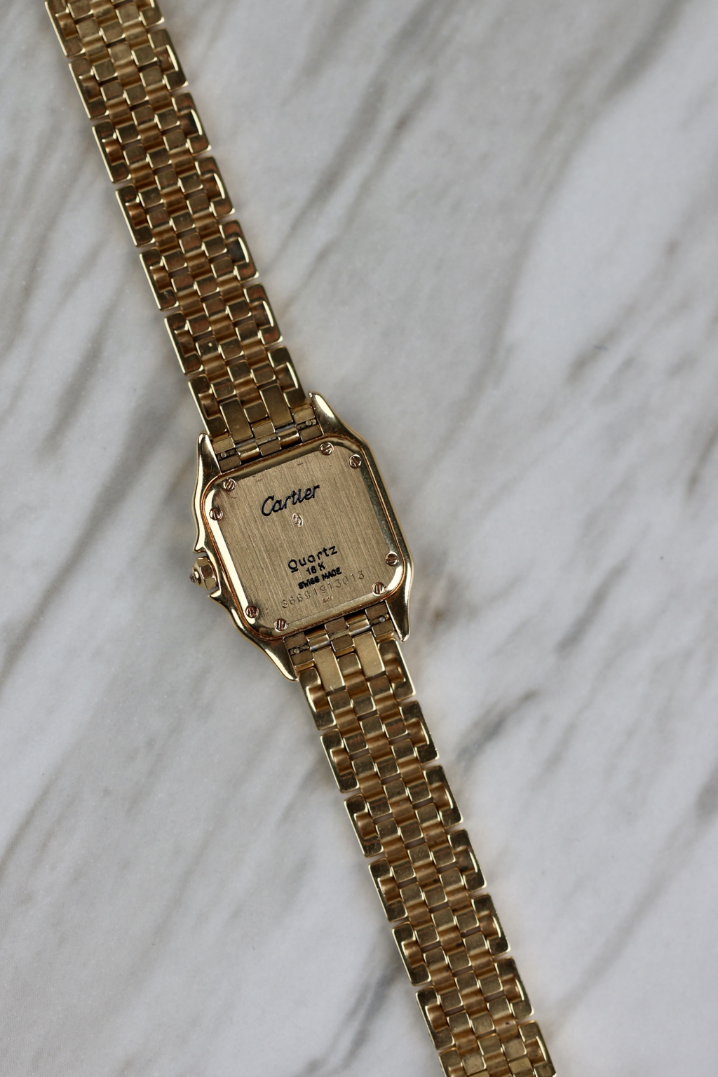 Cartier Panthère in solid 18k yellow gold, a classic that defined luxury in the 1980s and still turns heads today. This model captures the spirit of an era when watches were as much about style as timekeeping. With its fluid five-link bracelet and elegant square case, it wears like a piece of fine jewelry.