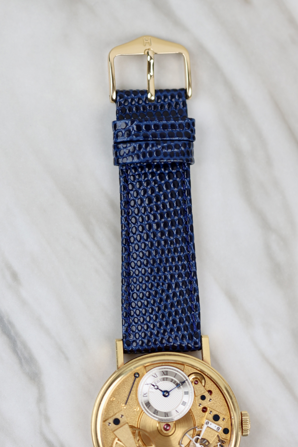 The Breguet Tradition 7027 is a beautiful and special watch – it's a window into the history of horology. Introduced in 2005, this model draws direct inspiration from the 1796 Souscription watches designed by Abraham-Louis Breguet. Housed in an 18kt yellow gold case, the 7027 displays its manual-winding movement (Cal. 507DR) prominently on the dial side, offering a rare and symmetrical view of the mechanical architecture. The movement features a 50-hour power reserve, inverted inline lever escapement, and Breguet overcoil balance spring. A power reserve indicator sits at 12 o'clock, while the time is read from an off-center dial beautifully decorated with hand-guilloché. Measuring 37 mm, this watch wears comfortably and strikes a rare balance between vintage charm and technical depth. Offered as a full set with its original box, papers, this piece is in excellent condition and ready to join a new collection.