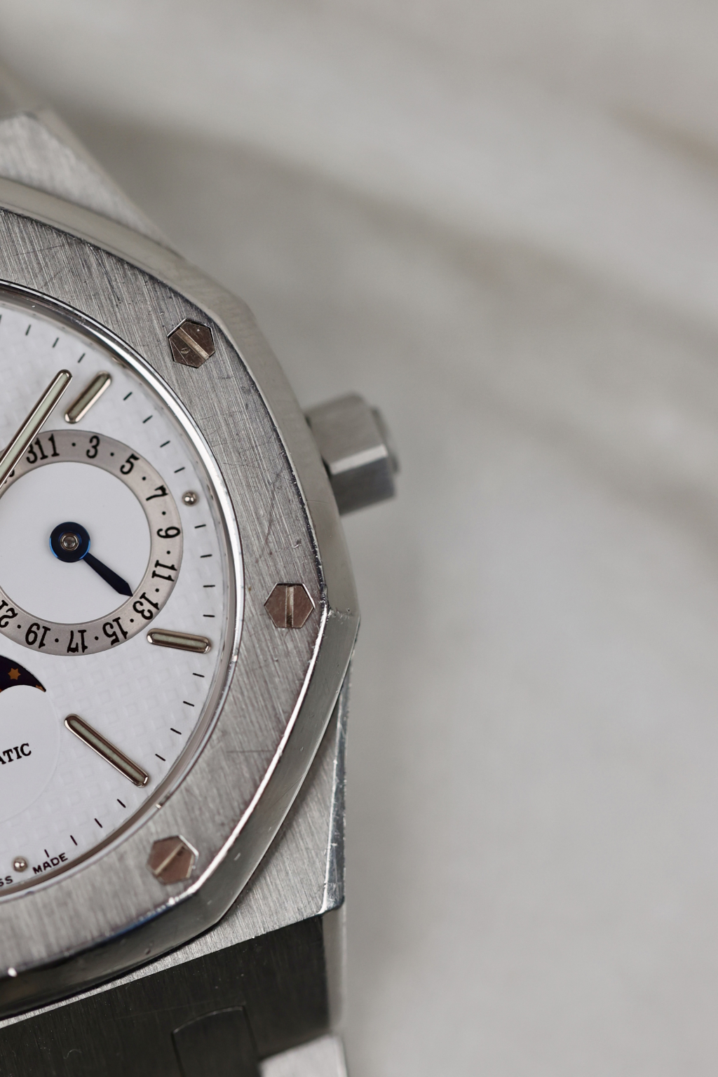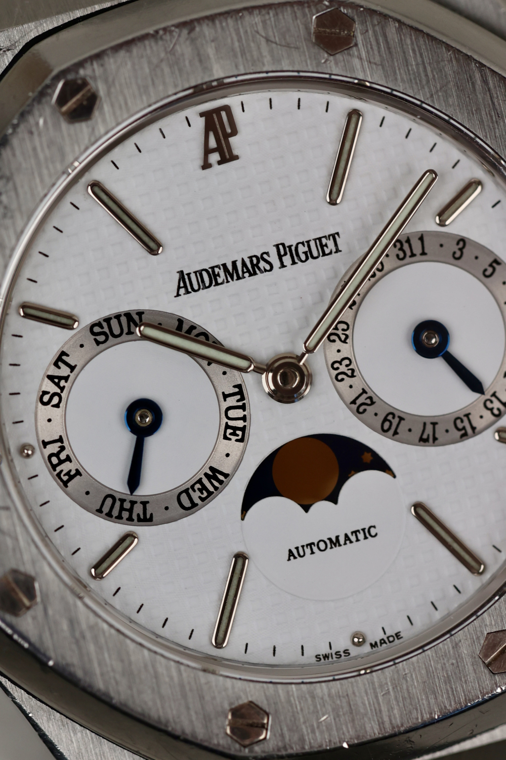The Royal Oak reference 25594 is a direct descendant of the iconic Royal Oak Day Date 5572, which was originally introduced in 1983. Though developed simultaneously, Model 25594 was unveiled a year later with an added moon-phase aperture, enhancing its dial with exceptional aesthetic balance.