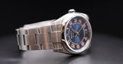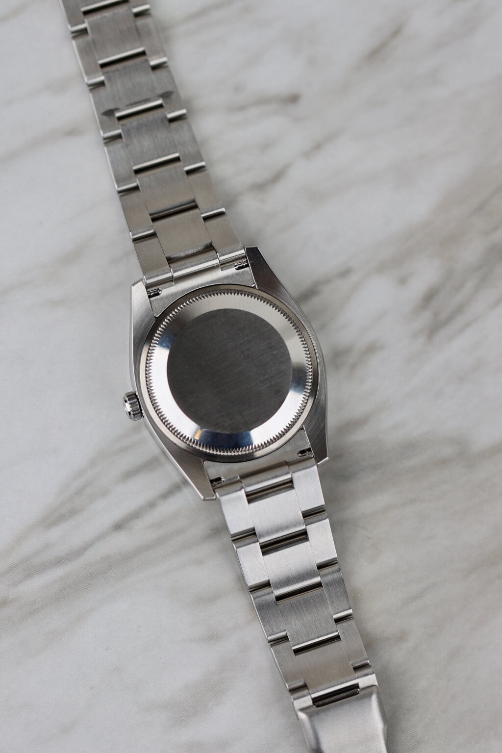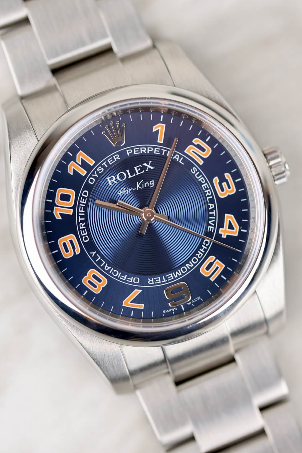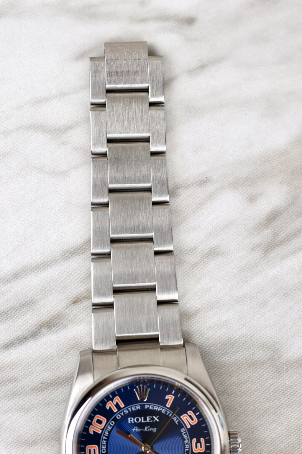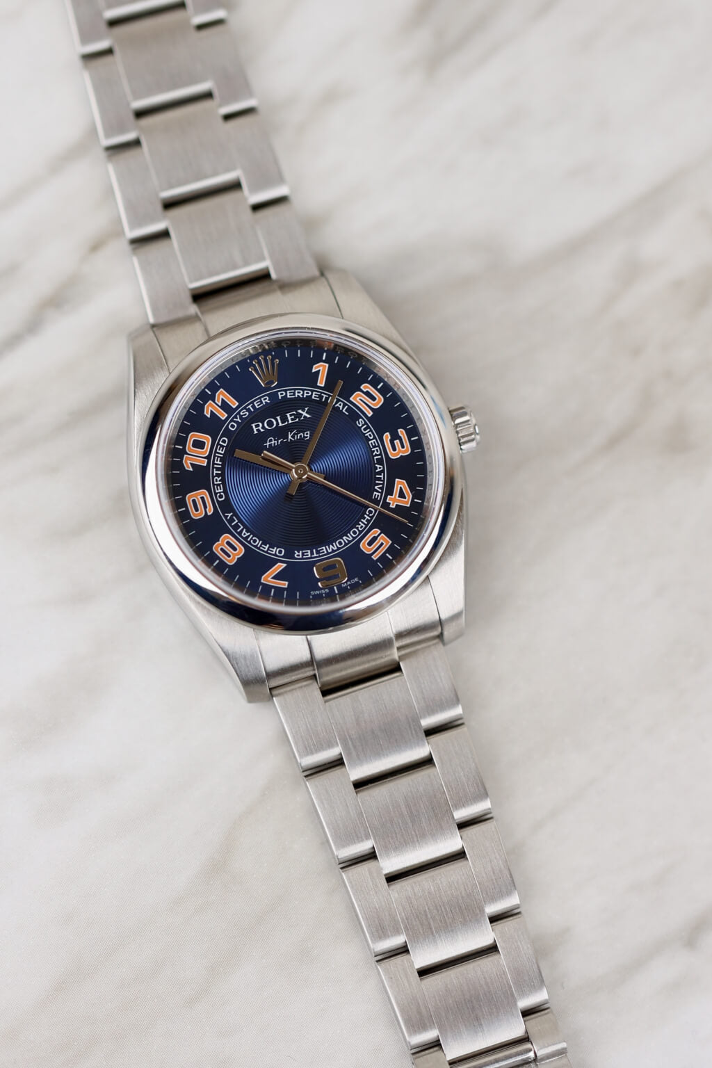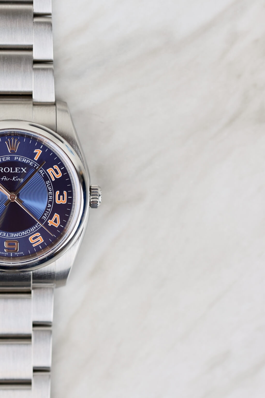 Die Rolex Air-King 14000M mit silbernem Zifferblatt ist ein klassisches Modell aus der Rolex Oyster Perpetual Kollektion. Mit ihrem 34-mm-Edelstahlgehäuse und dem schlicht-eleganten Design wirkt sie sportlich und zeitlos zugleich. Das silberne Zifferblatt wird durch klare, gut lesbare Stundenmarkierungen und die ikonischen Mercedes-Zeiger ergänzt. Angetrieben vom automatischen Kaliber 3130 sorgt die Uhr für präzise Zeitmessung und bietet eine Gangreserve von ca. 48 Stunden. Mit ihrem robusten Oyster-Armband und einer Wasserdichtigkeit von bis zu 100 Metern ist die Air-King 14000M ein zuverlässiger Begleiter für den Alltag.