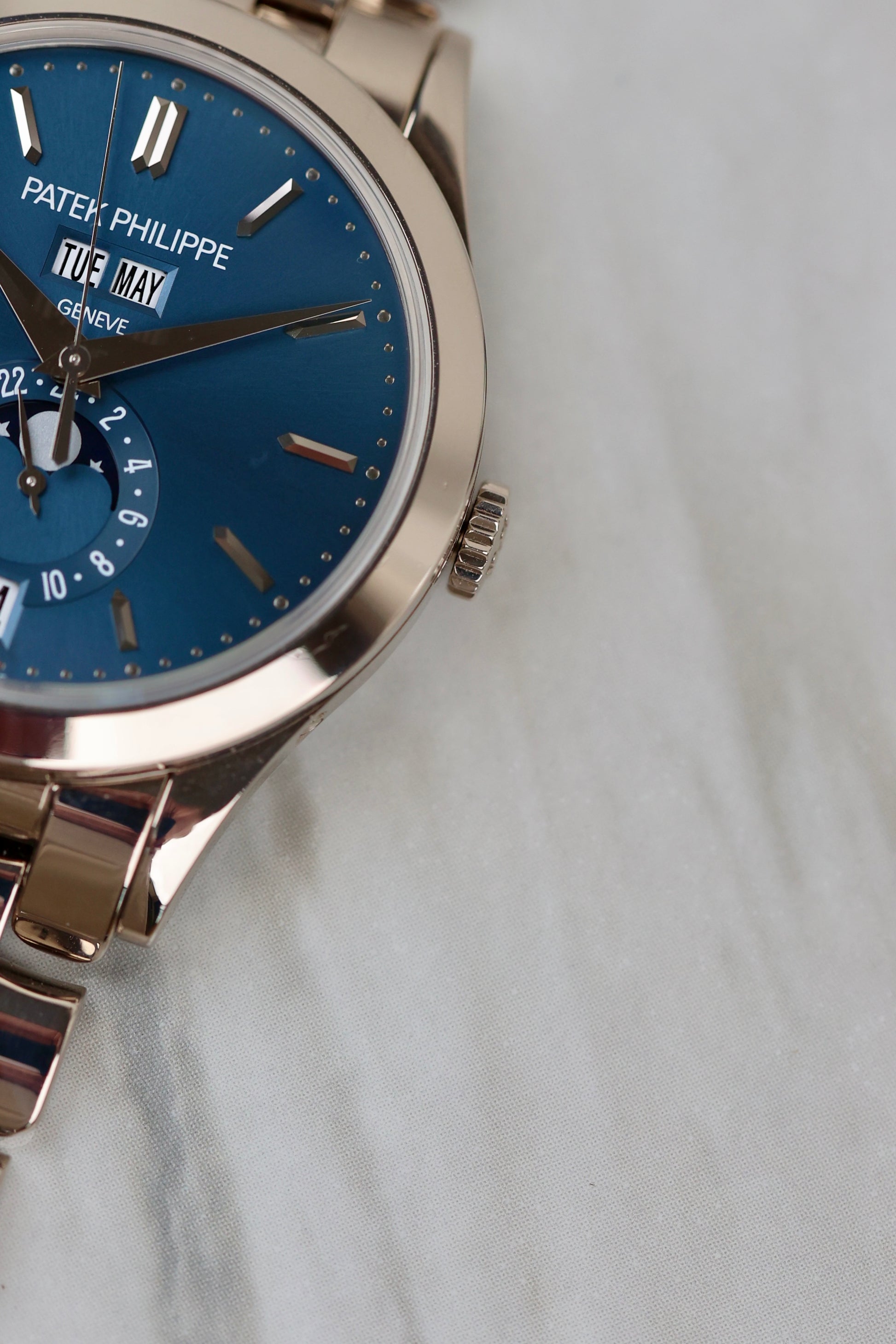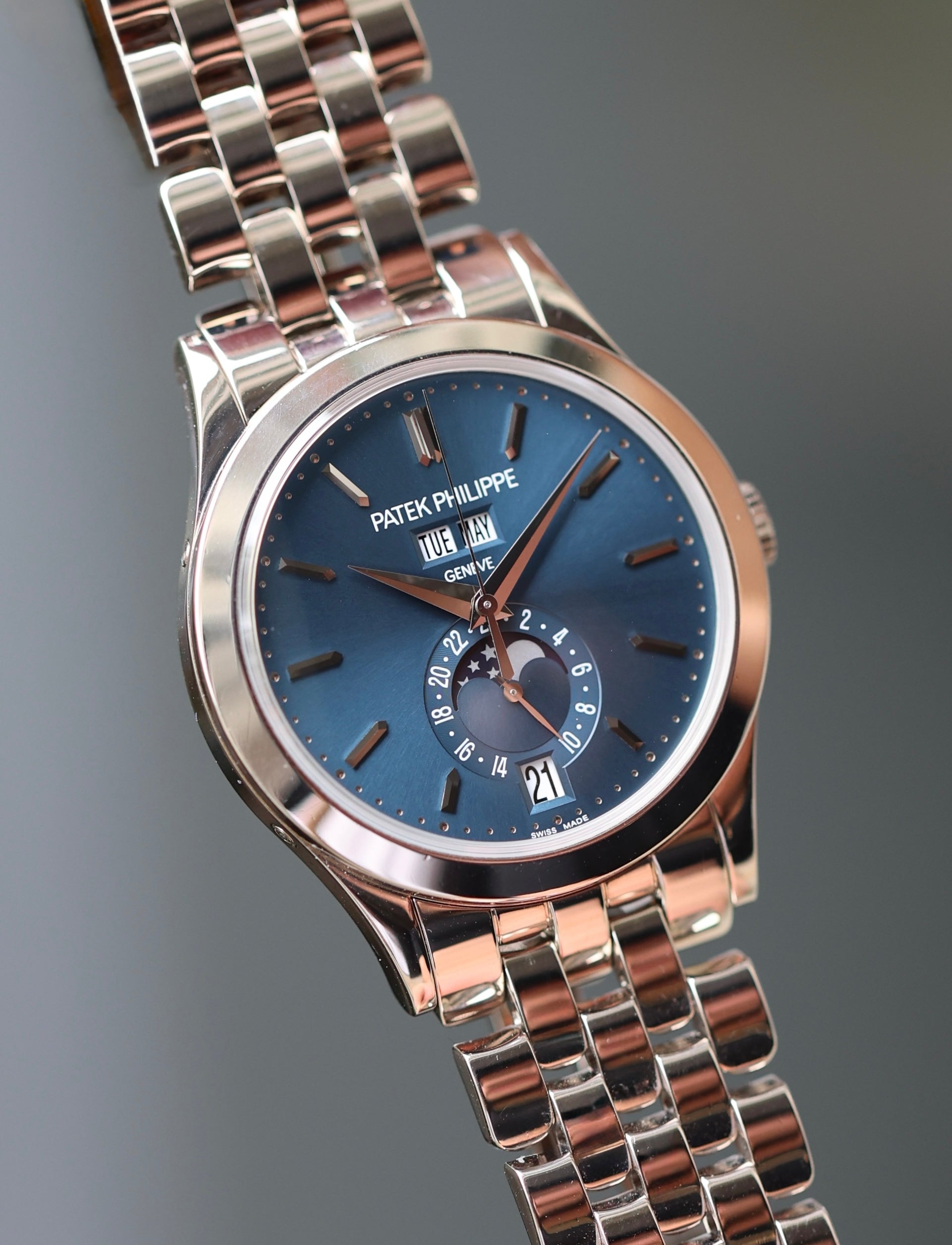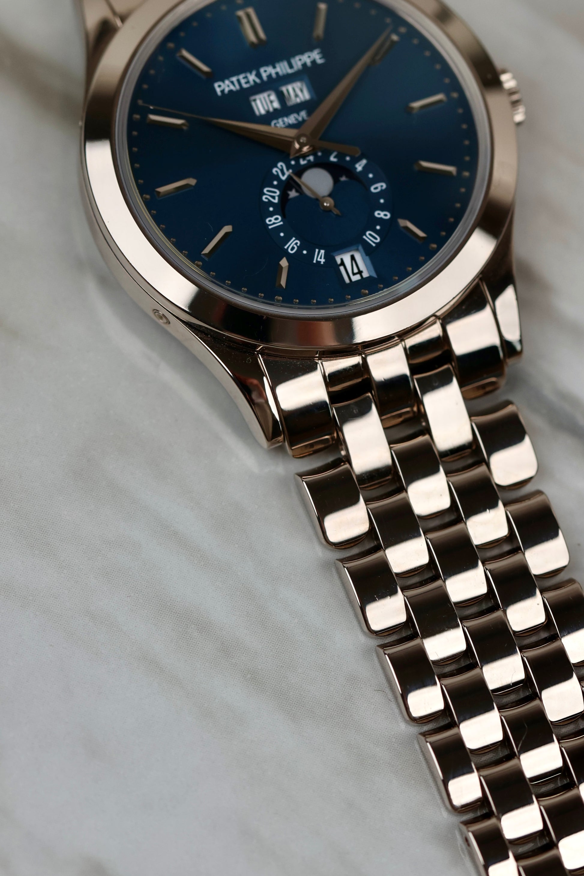 This Patek doesn’t shout—it nods. The 5396/1G-001 is dressed head-to-toe in 18k white gold, with a rich blue sunburst dial that says, “I read complicated books... and also know what day it is.” The calendar layout is perfectly balanced: day and month up top, moonphase and date below, all powered by Patek’s clever Caliber 324 that only needs correcting once a year (lazy, but in a genius kind of way).