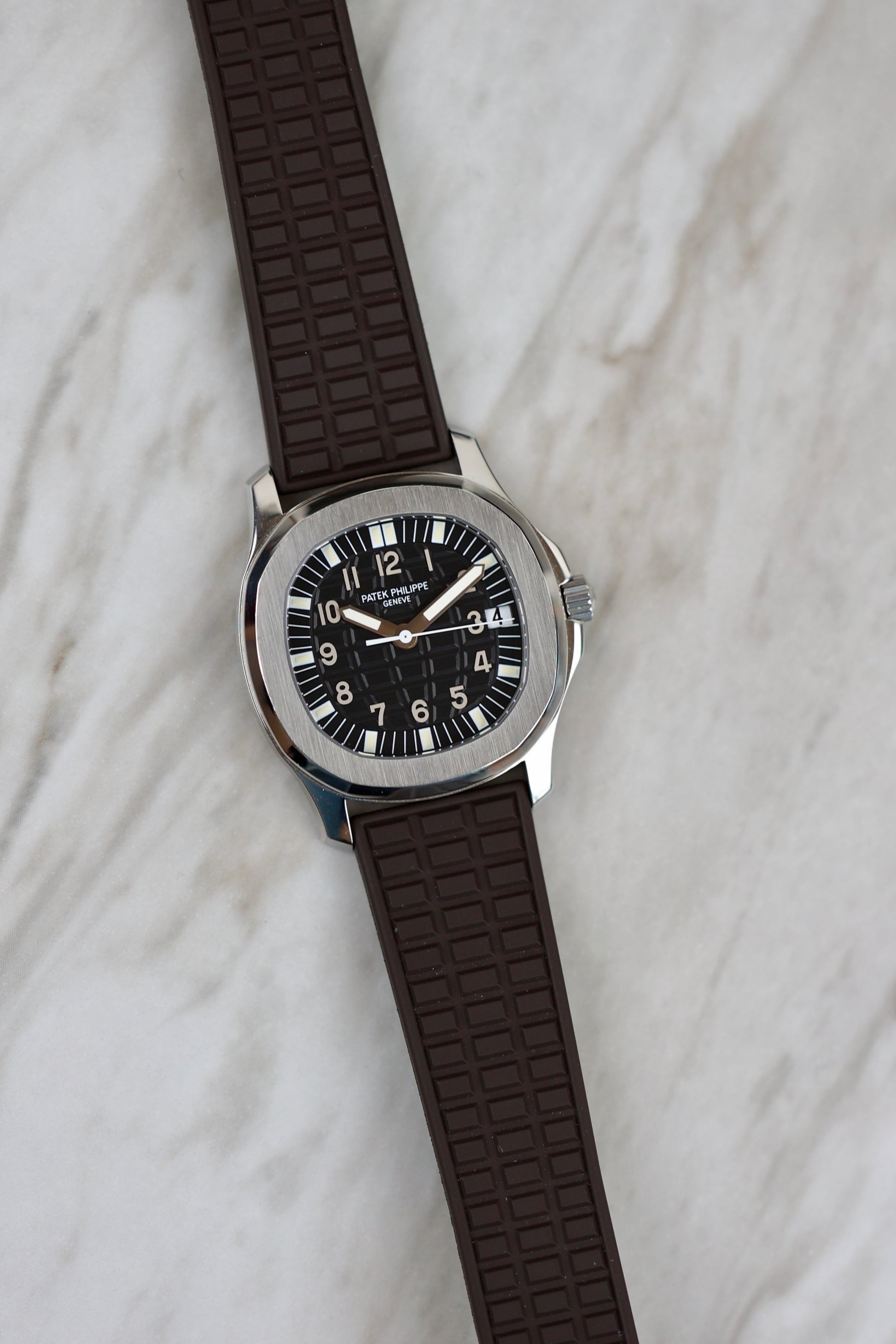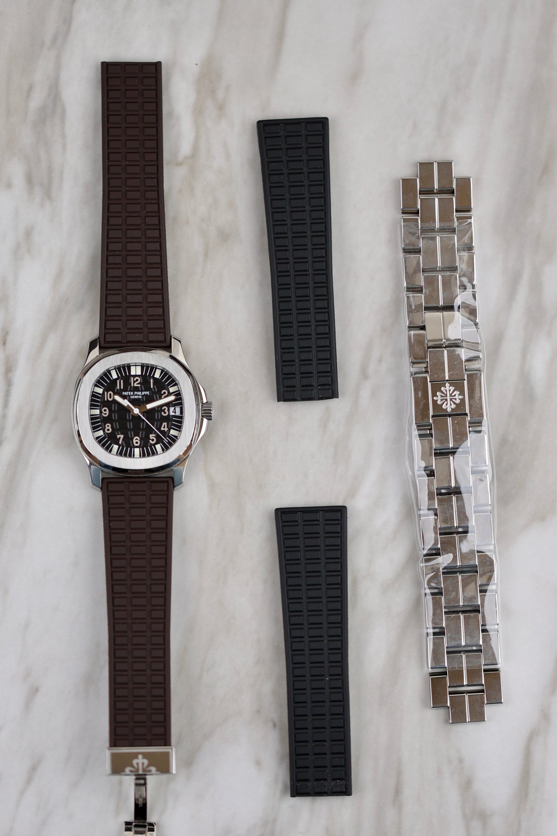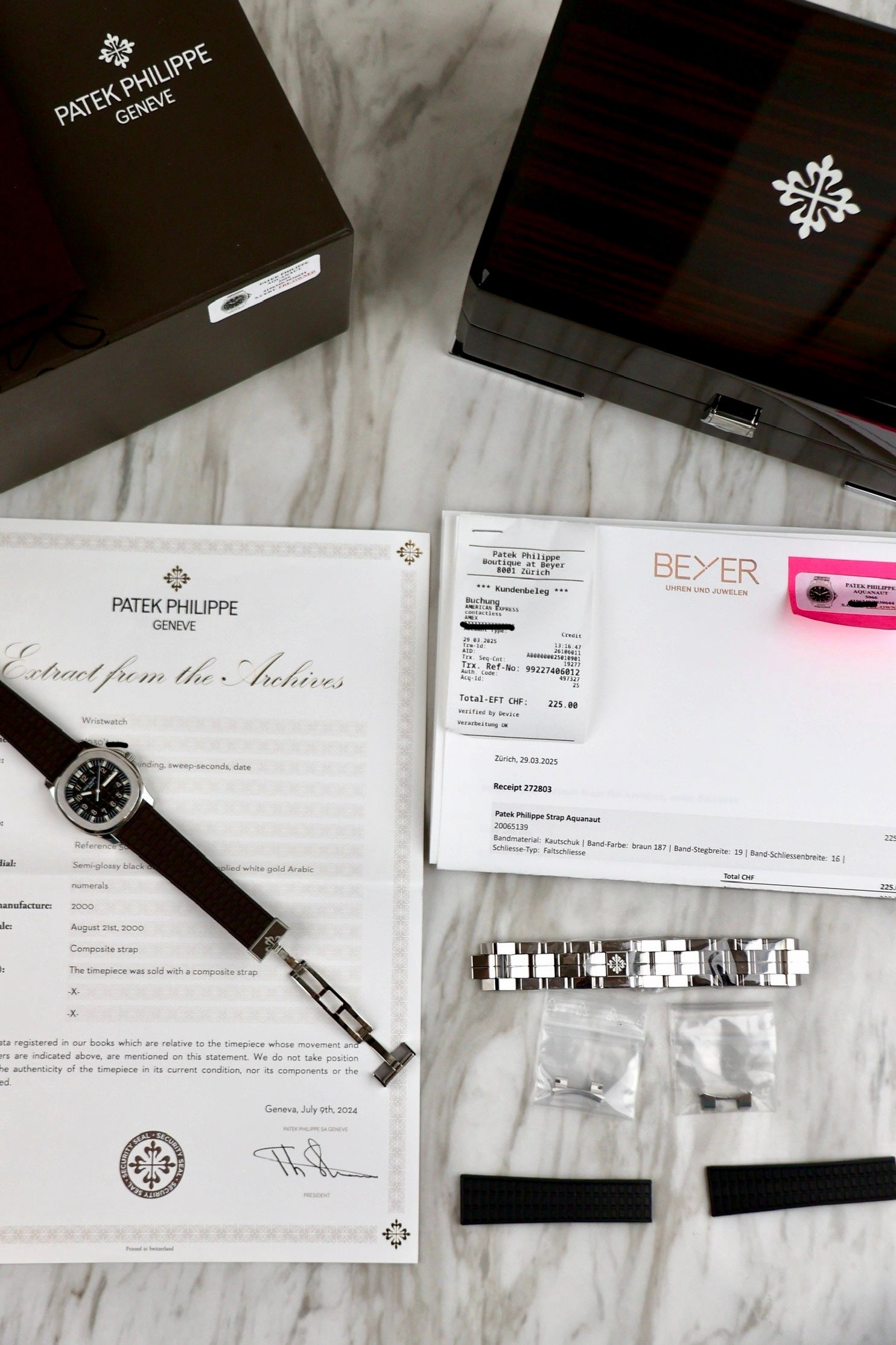The Patek Philippe Aquanaut Ref. 5066, introduced in 1998, features a 36mm stainless steel case with a black embossed dial. This model is known for its distinct 18k white gold Arabic numerals and painted hour markers, which give the dial a sleek, elegant appearance. The date window is placed at the edge of the dial at 3 o'clock, a unique design choice for the Aquanaut series. Paired with a straight-end rubber strap, this timepiece combines luxury with a sporty edge, offering versatility for both casual and formal occasions. This reference helped define the evolution of the Aquanaut collection, blending high-end craftsmanship with an active lifestyle. The watch comes with an extract of archives from 2024,has two Patek rubber straps, brown and black. In addition to that, the watch comes also with the original steel bracelet, which is still unworn.