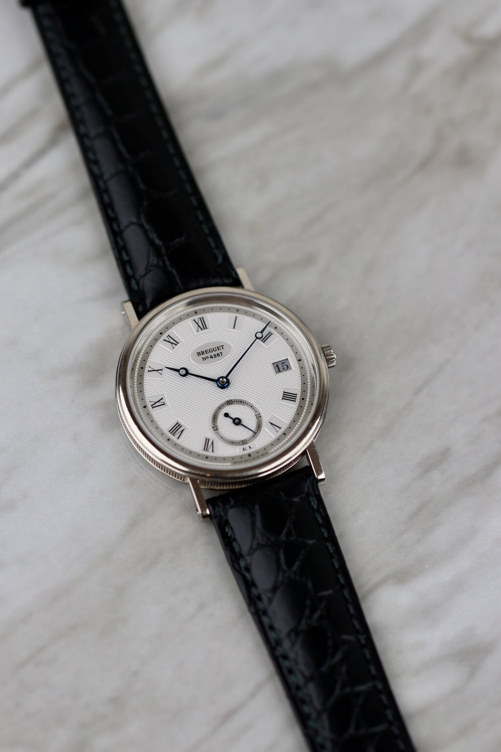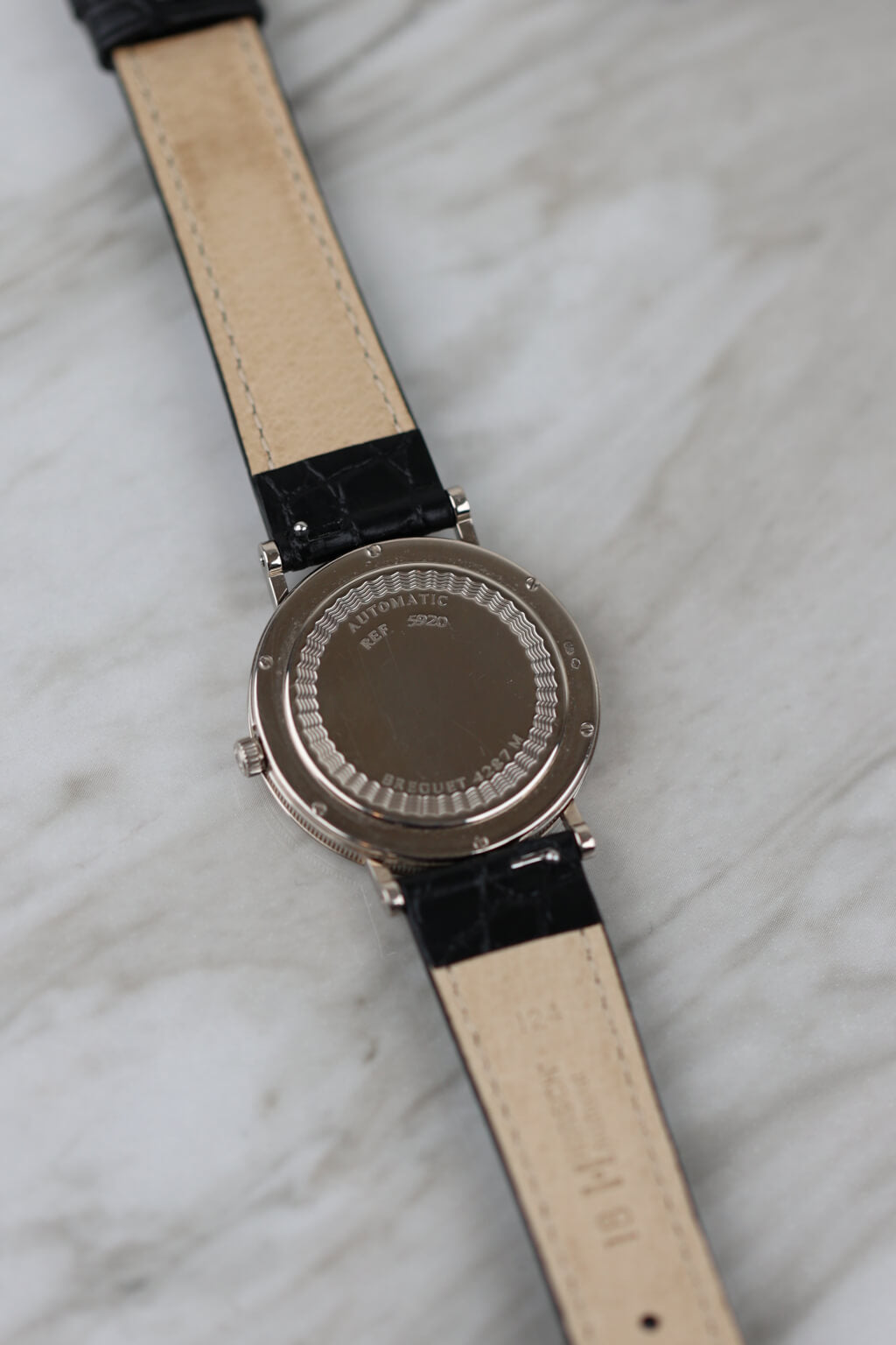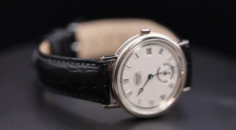 Die Breguet Classique Referenz 5920 in 18 Karat Weißgold besticht durch ihr elegantes Design und fein gearbeitete Details. Das silberfarbene Zifferblatt ist mit handguillochierten Verzierungen verziert und wird durch römische Ziffern und gebläute Breguet-Zeiger ergänzt. Mit einem Durchmesser von 34,6 mm liegt die Uhr angenehm am Handgelenk. Das automatische Kaliber 516/1 bietet eine Gangreserve von 72 Stunden. Ein Lederarmband rundet den eleganten Gesamteindruck ab.