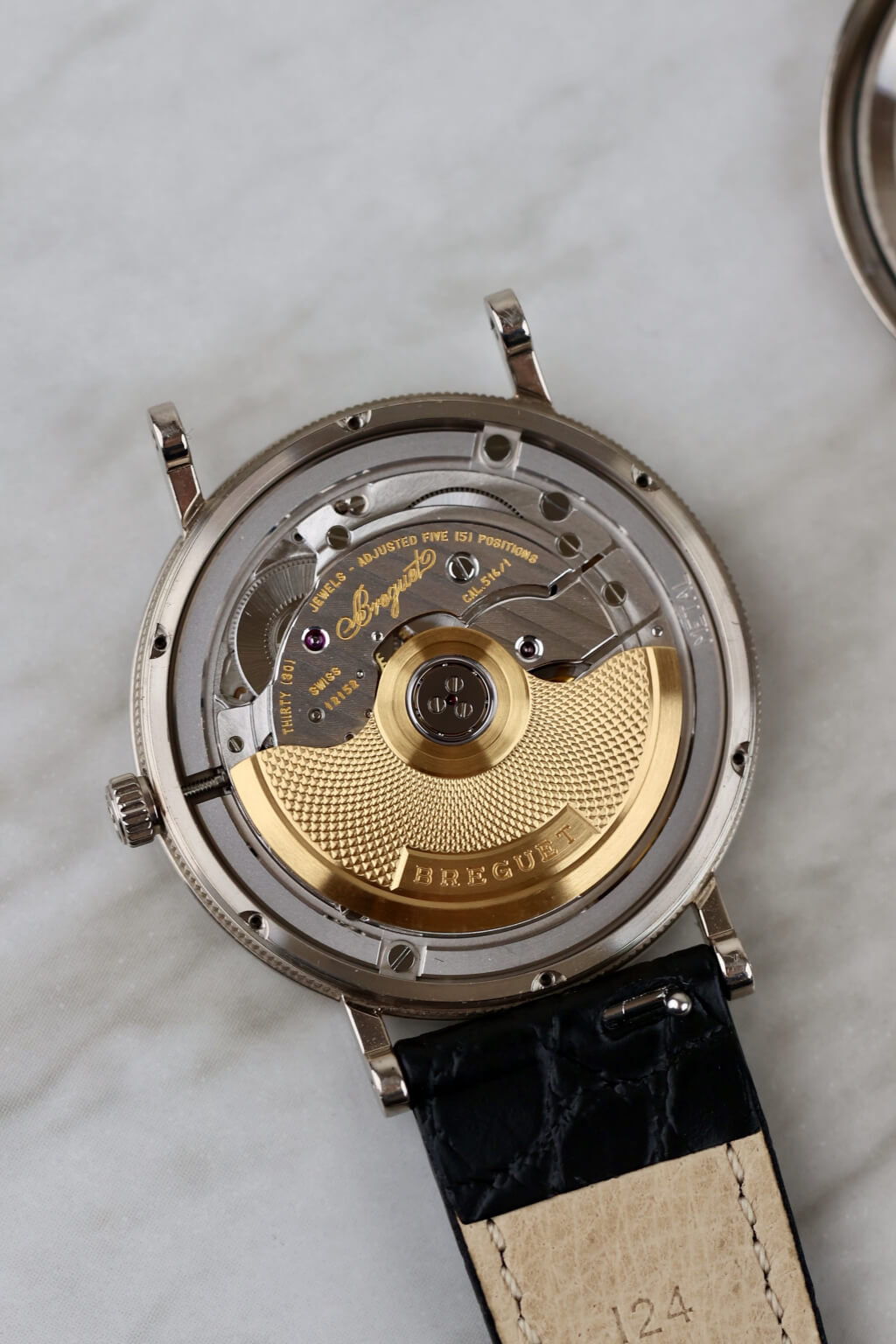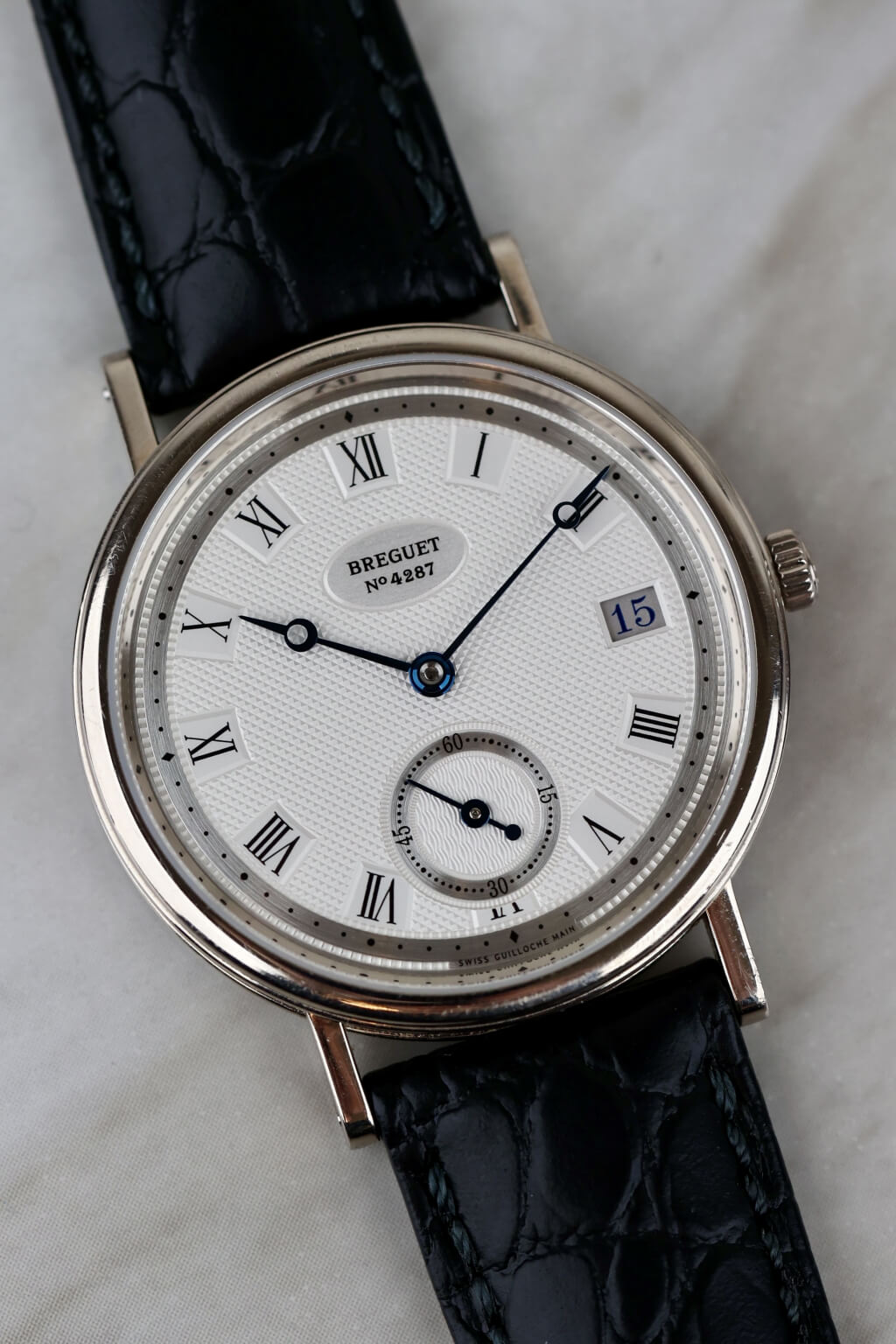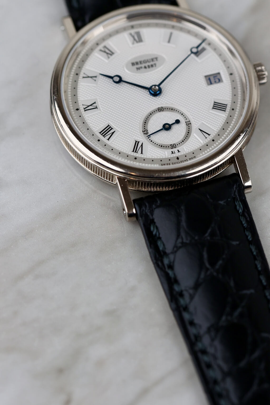Die Breguet Classique Referenz 5920 in 18 Karat Weißgold besticht durch ihr elegantes Design und fein gearbeitete Details. Das silberfarbene Zifferblatt ist mit handguillochierten Verzierungen verziert und wird durch römische Ziffern und gebläute Breguet-Zeiger ergänzt. Mit einem Durchmesser von 34,6 mm liegt die Uhr angenehm am Handgelenk. Das automatische Kaliber 516/1 bietet eine Gangreserve von 72 Stunden. Ein Lederarmband rundet den eleganten Gesamteindruck ab.