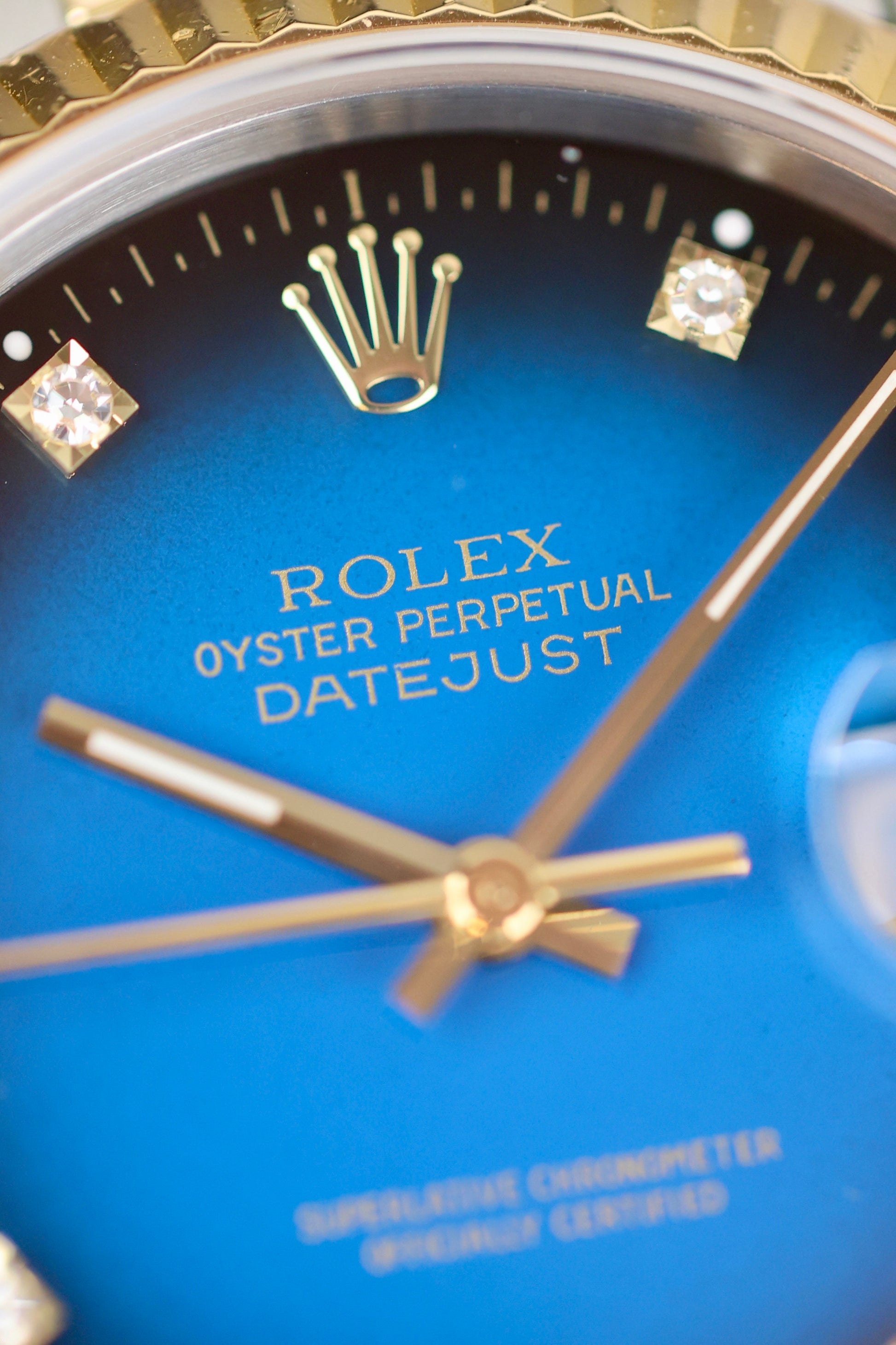 What makes this watch really special is the blue vignette dial. It has a bright blue color in the middle that slowly gets darker toward the edge. These dials are much harder to find.