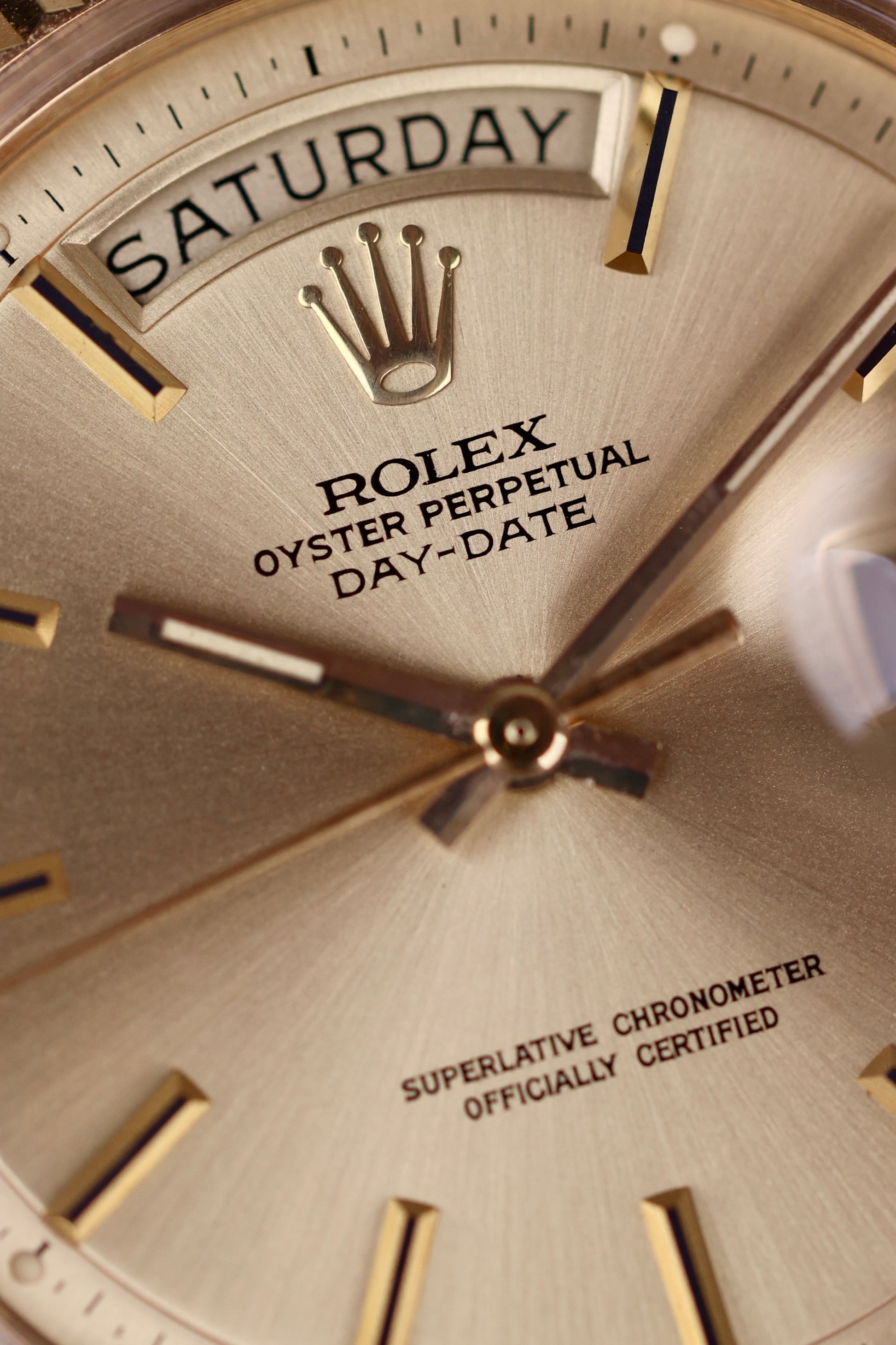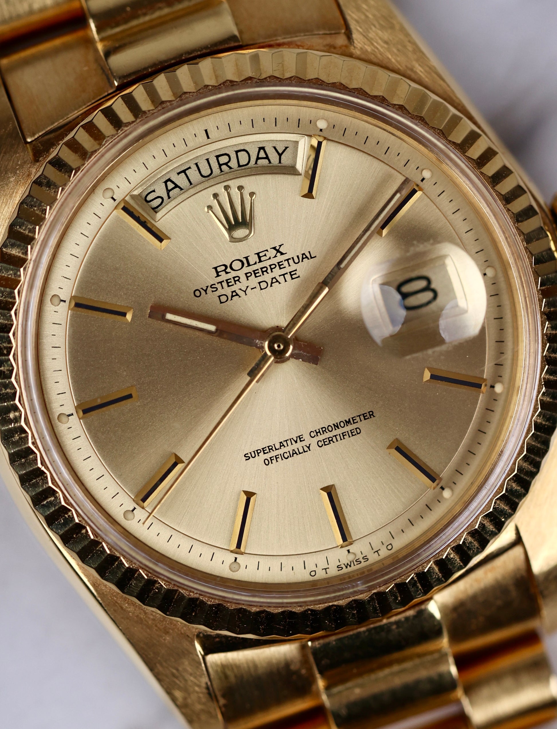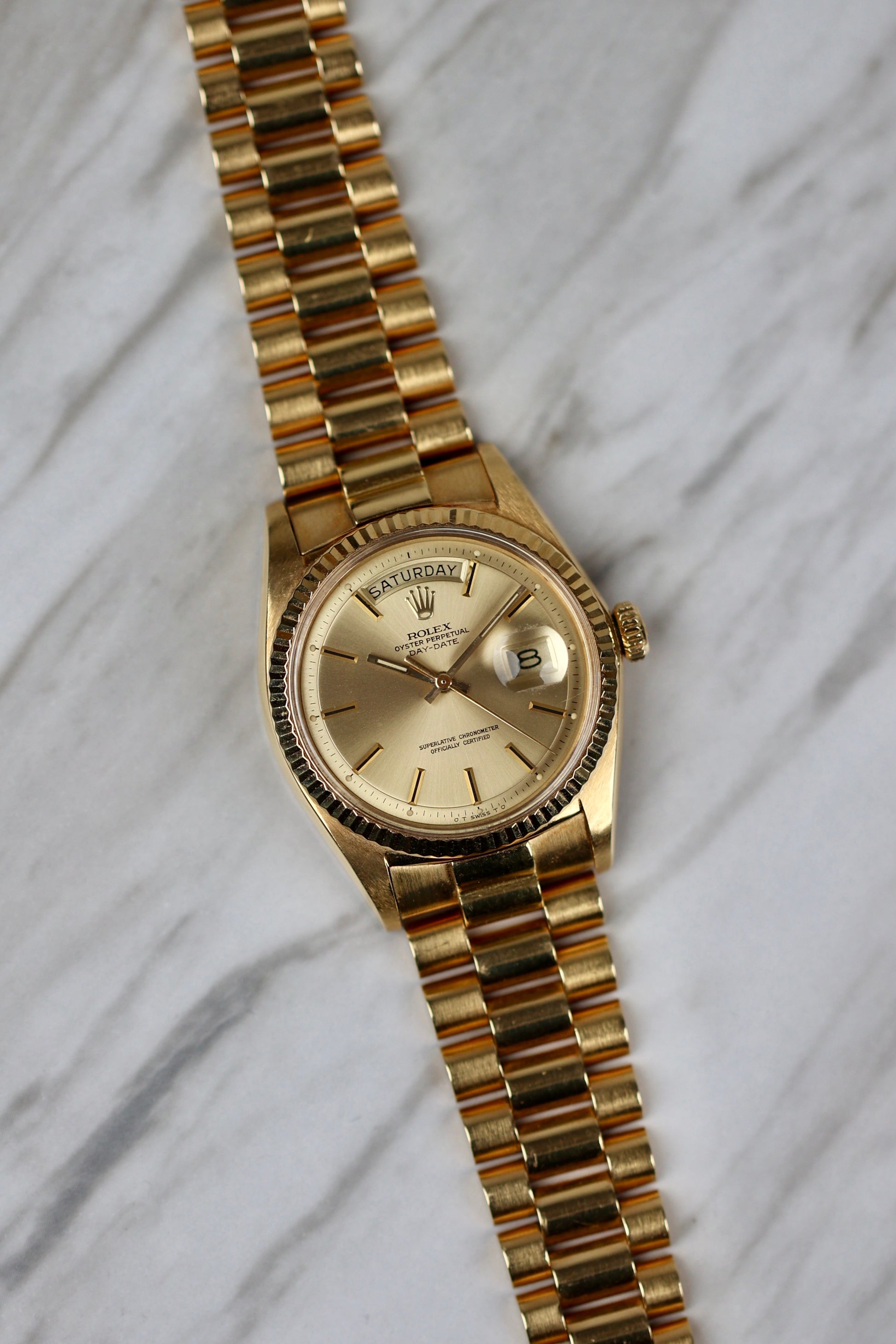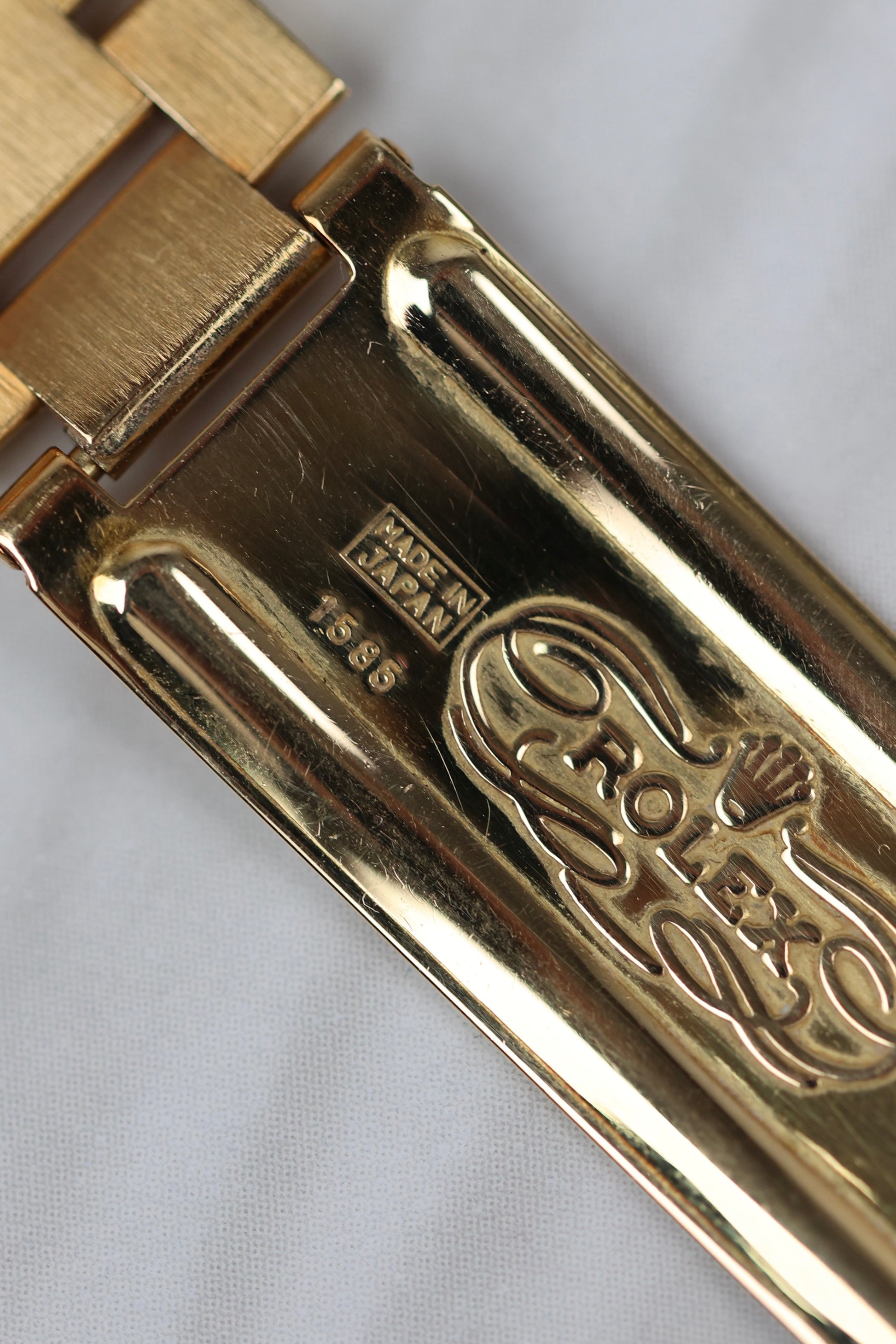 At first glance, this might look like your classic 1803. Fluted bezel, sharp pie-pan dial, and that unmistakable Day-Date presence. But look closer, and you’ll spot something that makes collectors lean in: a “Made in Japan” President bracelet. Back in the day, Japan slapped heavy import taxes on fully assembled Swiss watches. Rolex, never one to lose a sale, pulled a clever move—ship the heads only, and have the bracelets made locally. The result? A small batch of Day-Dates fitted with Japanese-made President bracelets. Identical in style, but stamped with a different origin story. The rounded dial on this one keeps things soft and elegant, pairing beautifully with the warm tone of the vintage gold case. Inside ticks the trusty automatic Caliber 1556—no quickset, but all soul. This isn’t just a Day-Date. It’s a quiet piece of Rolex history disguised as a wristwatch. And unless someone knows what they’re looking at, they’ll never guess why it’s so rare.