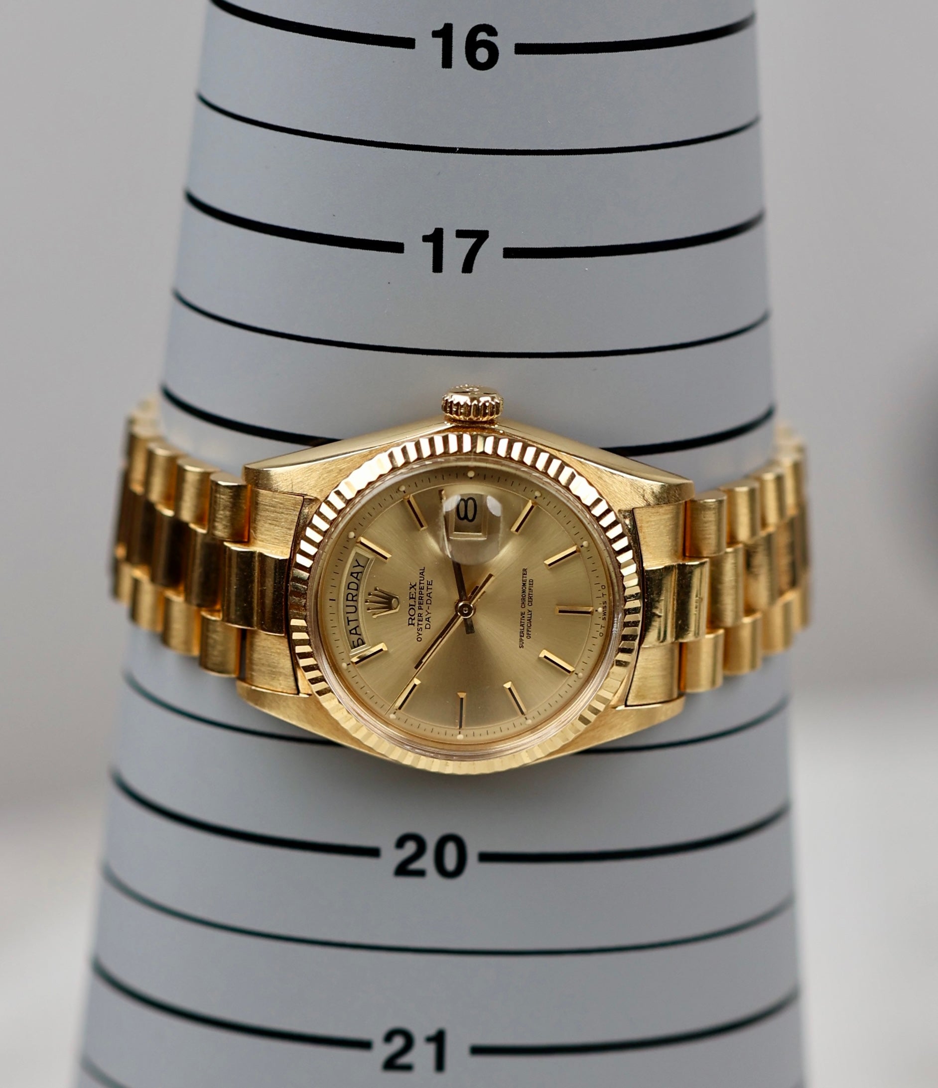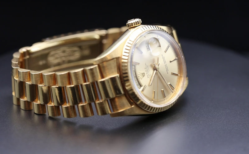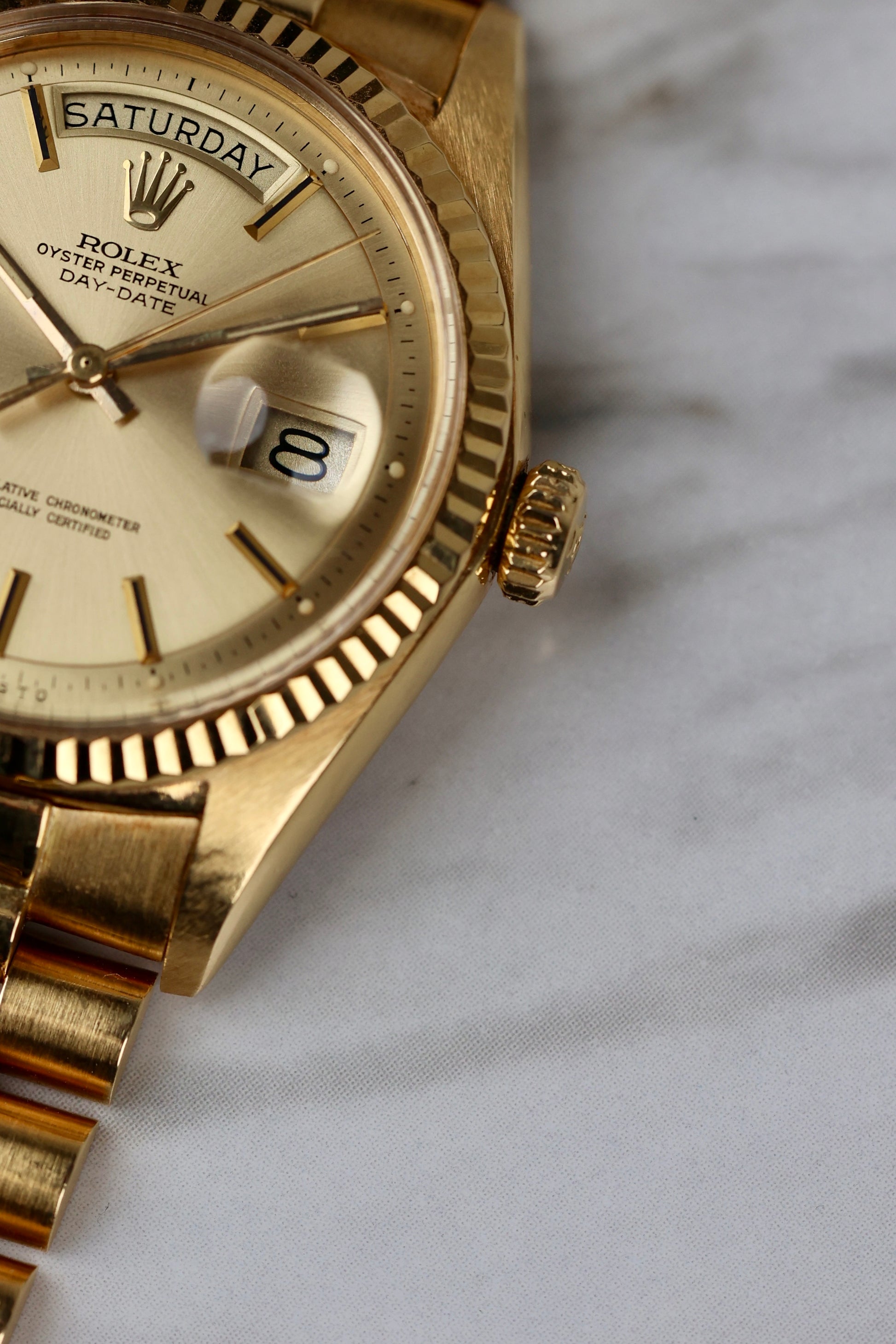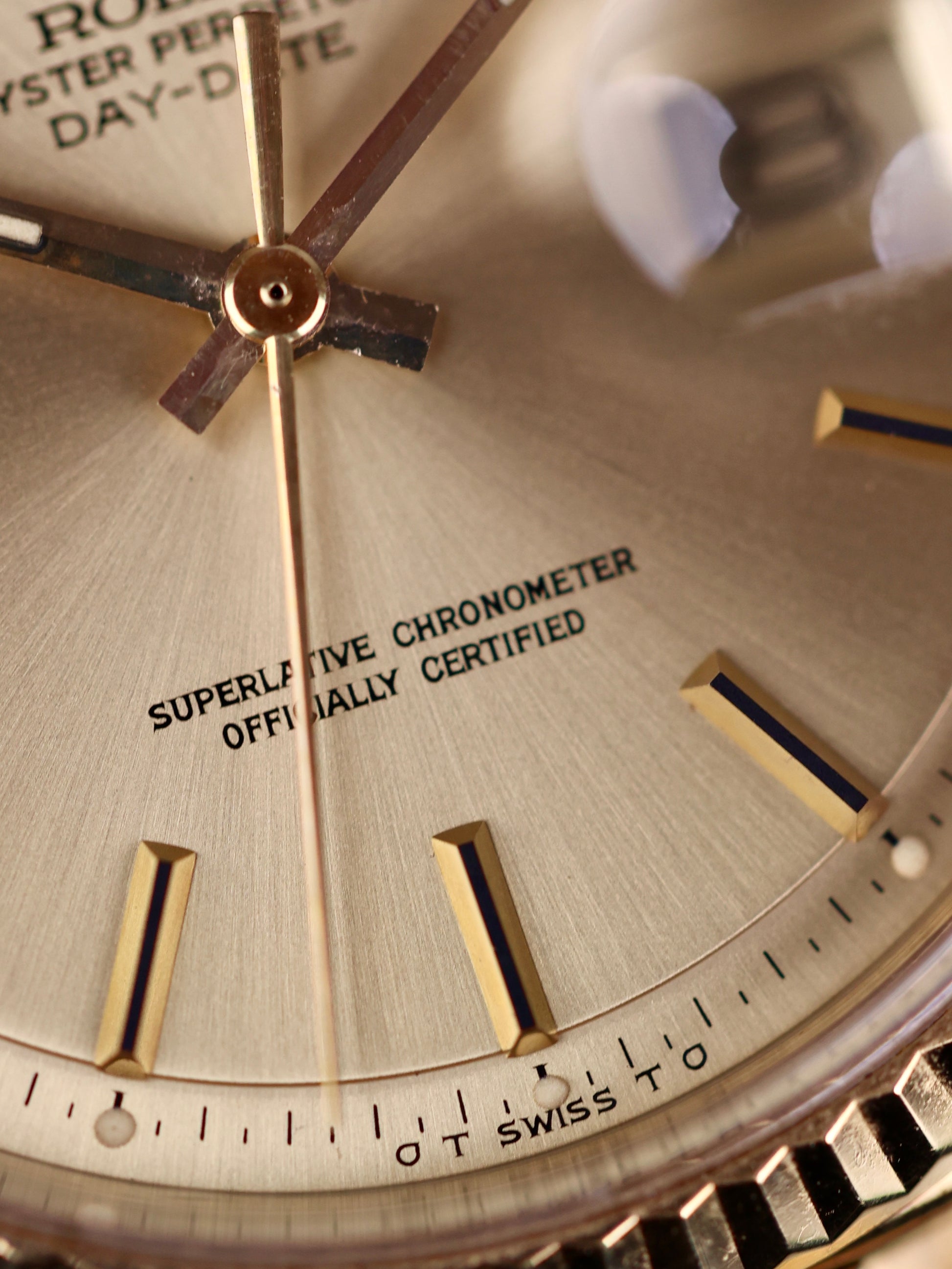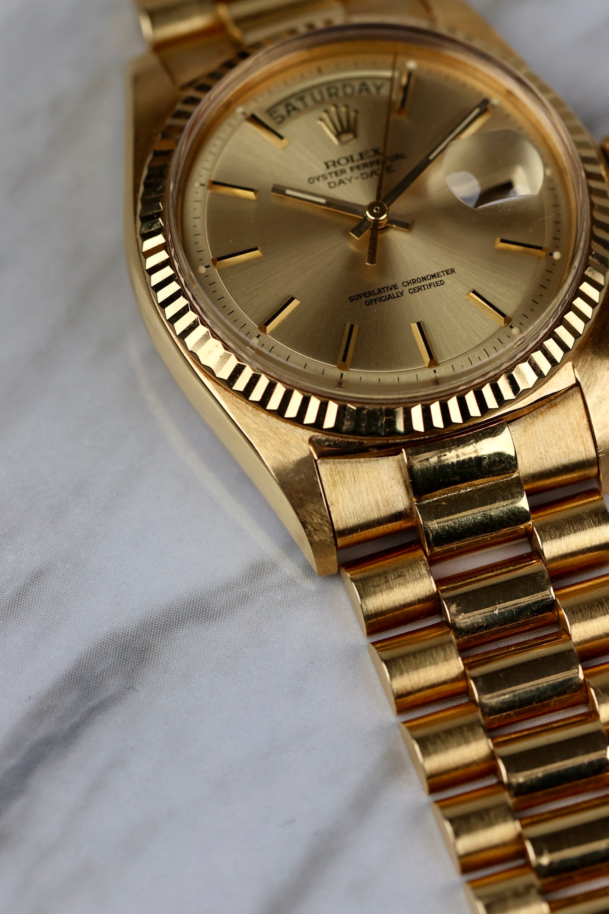 At first glance, this might look like your classic 1803. Fluted bezel, sharp pie-pan dial, and that unmistakable Day-Date presence. But look closer, and you’ll spot something that makes collectors lean in: a “Made in Japan” President bracelet. Back in the day, Japan slapped heavy import taxes on fully assembled Swiss watches. Rolex, never one to lose a sale, pulled a clever move—ship the heads only, and have the bracelets made locally. The result? A small batch of Day-Dates fitted with Japanese-made President bracelets. Identical in style, but stamped with a different origin story. The rounded dial on this one keeps things soft and elegant, pairing beautifully with the warm tone of the vintage gold case. Inside ticks the trusty automatic Caliber 1556—no quickset, but all soul. This isn’t just a Day-Date. It’s a quiet piece of Rolex history disguised as a wristwatch. And unless someone knows what they’re looking at, they’ll never guess why it’s so rare.