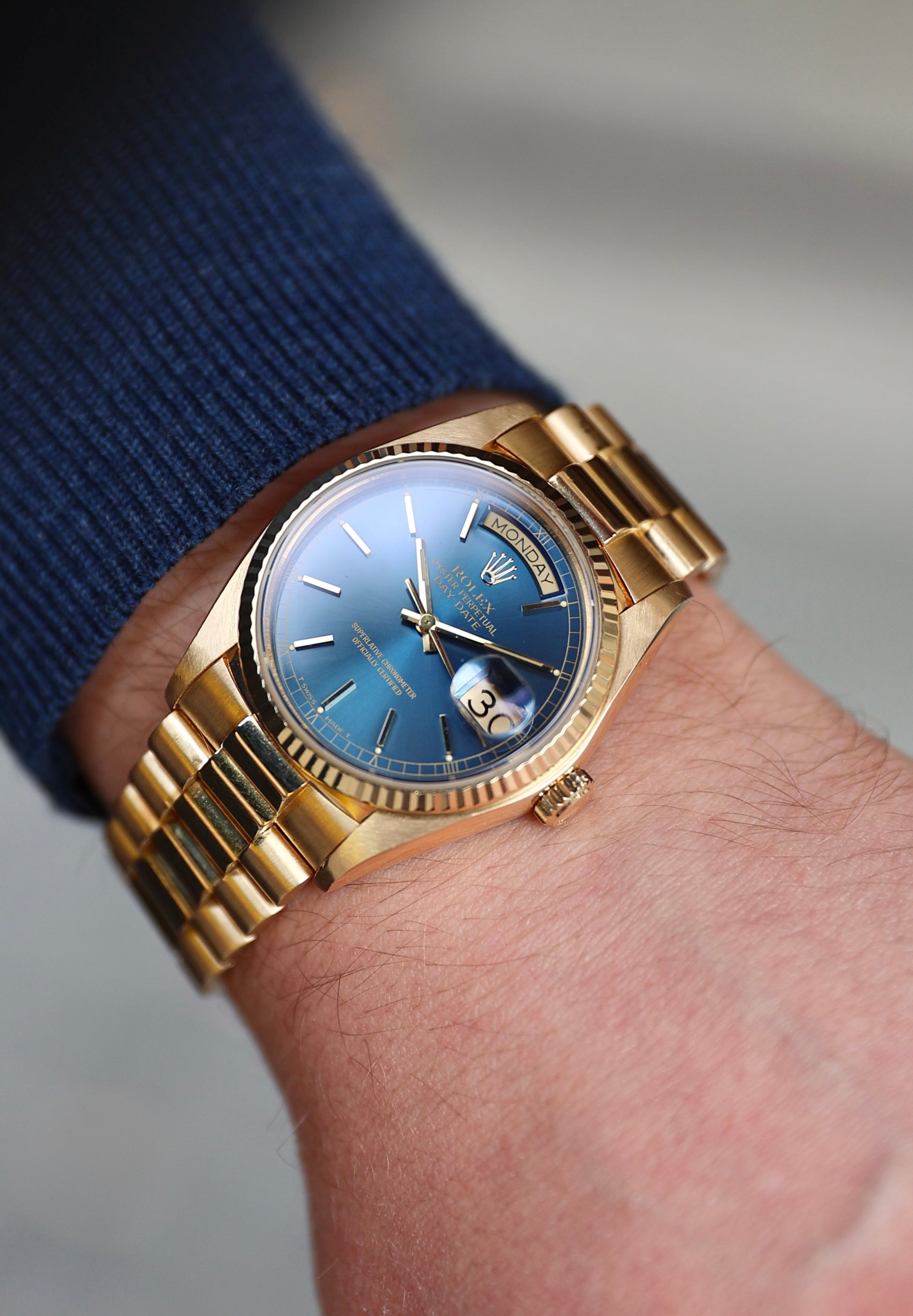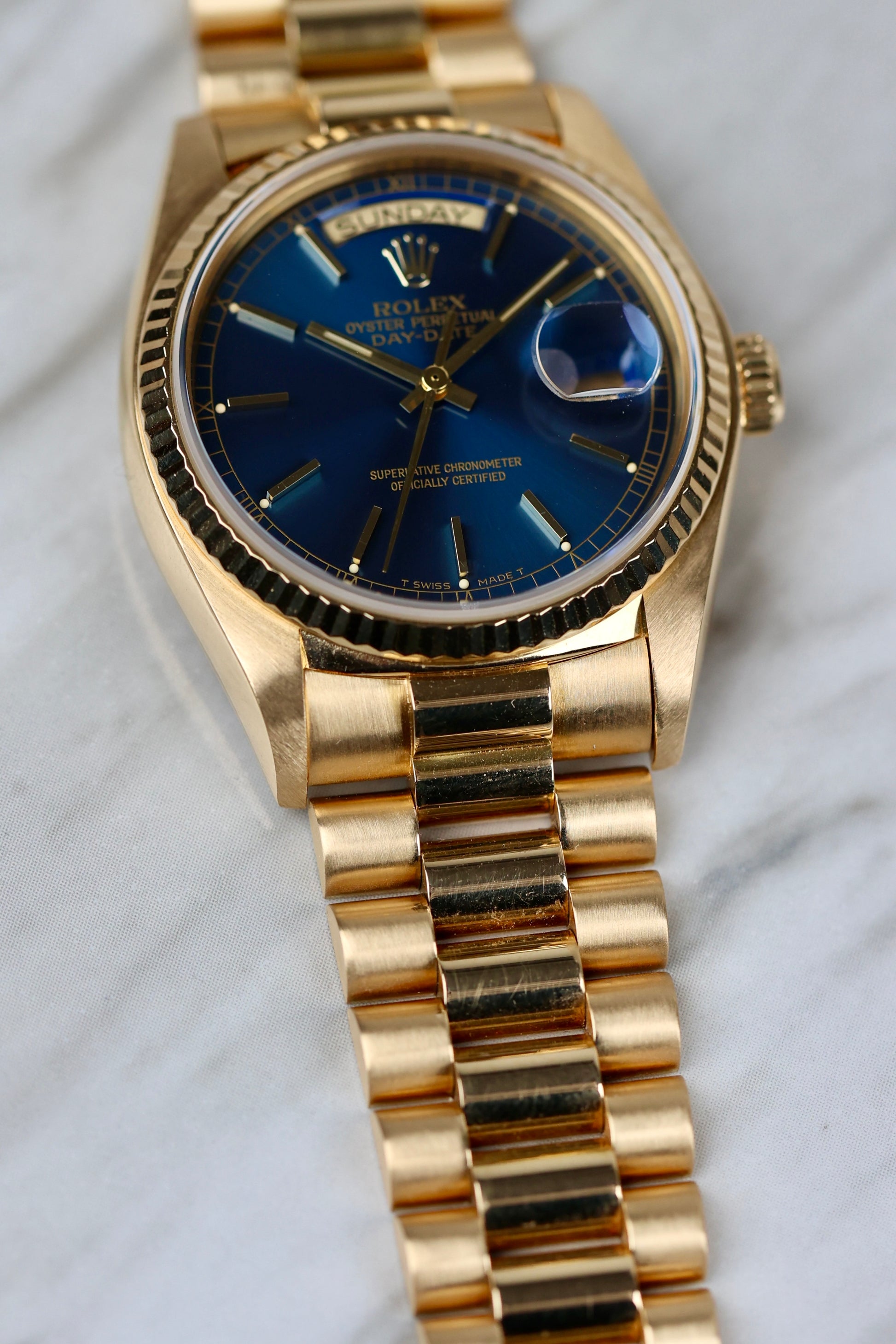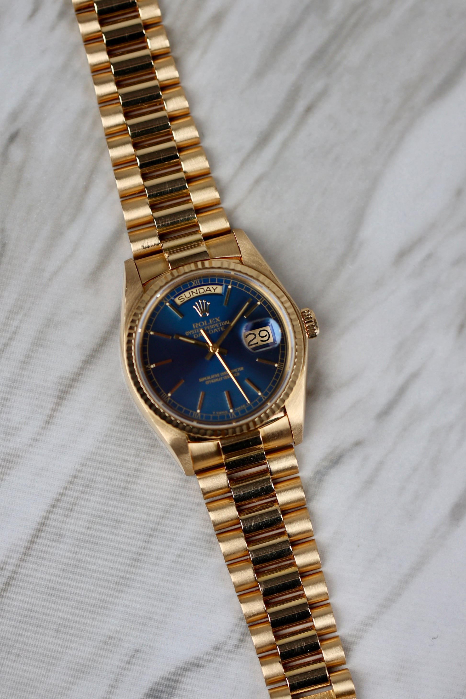 Housed in an 18k yellow gold case with a fluted bezel that catches light like it’s trying to make a point. The automatic Caliber 3055 ticks away inside. The bracelet? Solid President. The vibe? Quiet luxury, but louder than it looks. These blue dials barely pop up, and when they do, collectors usually don’t blink. A sharp case, rare dial, and just enough patina to prove it's lived.