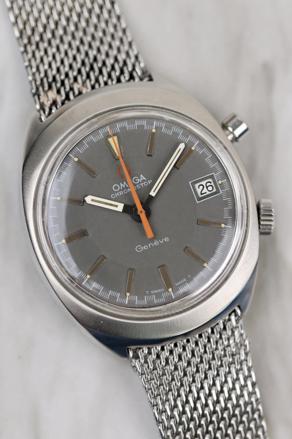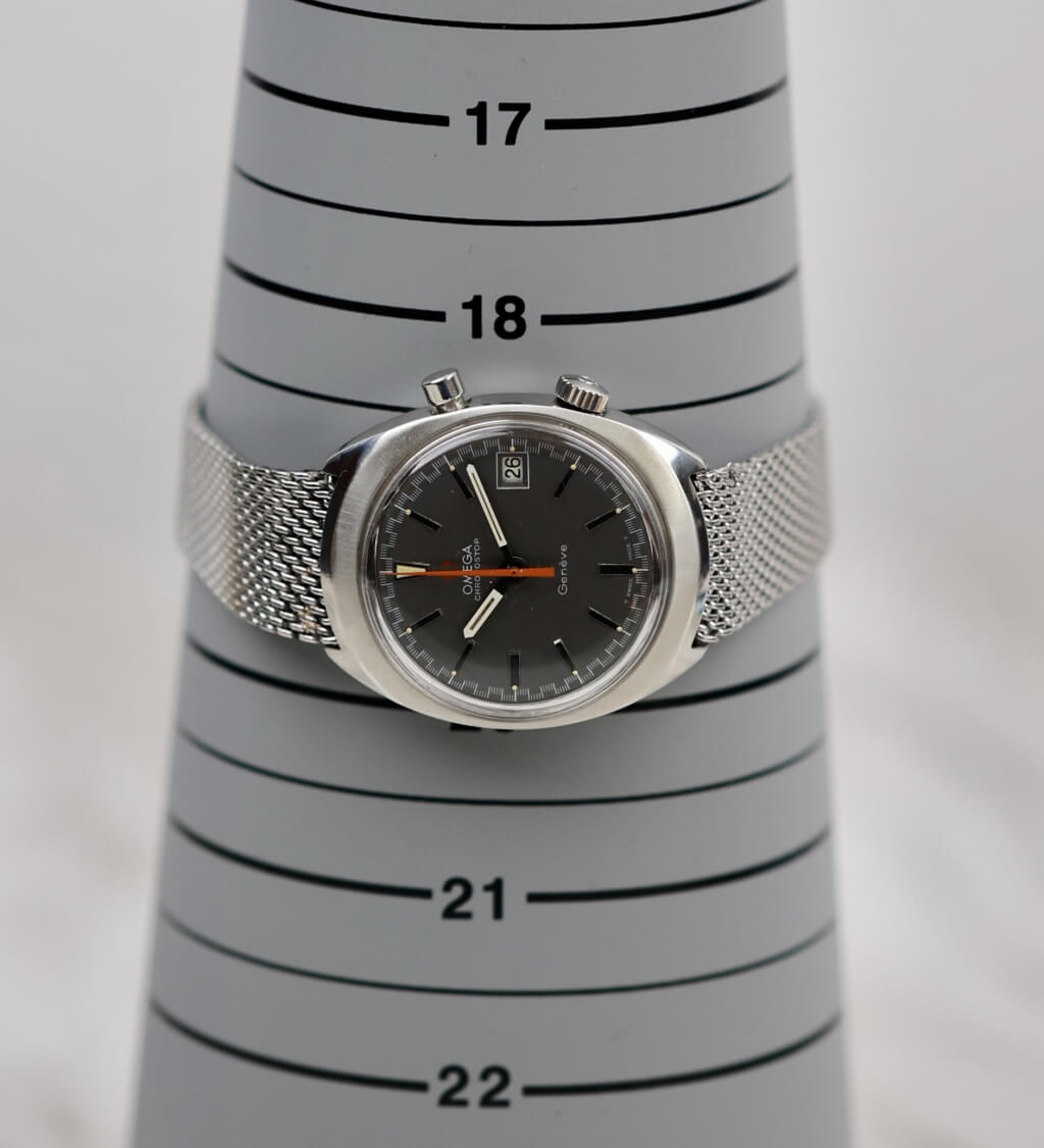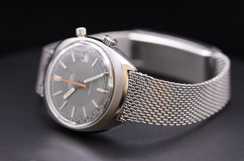 Die Omega Chronostop Ref. 146.009 ist ein markantes Modell aus den späten 1960er Jahren und verkörpert den Experimentiergeist, der Omega in dieser Zeit auszeichnete. Sie verfügt über einen einzigartigen Ein-Drücker-Chronographenmechanismus, angetrieben vom zuverlässigen Kaliber 920. Anders als herkömmliche Chronographen wird die Chronostop mit einem einzigen Drücker bedient: Einmal drücken, um die Zeitmessung zu starten, erneut drücken – und statt anzuhalten, springt sie auf Null zurück. Diese eigenwillige „stopplose“ Rückstellfunktion ist ebenso genial wie unterhaltsam und spiegelt Omegas spielerischen und zugleich technischen Ansatz der damaligen Zeit wider.