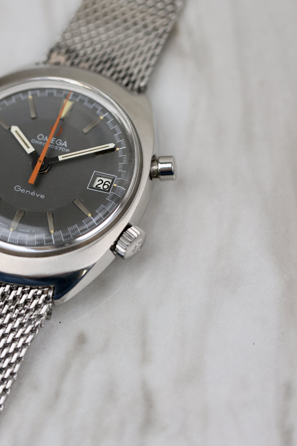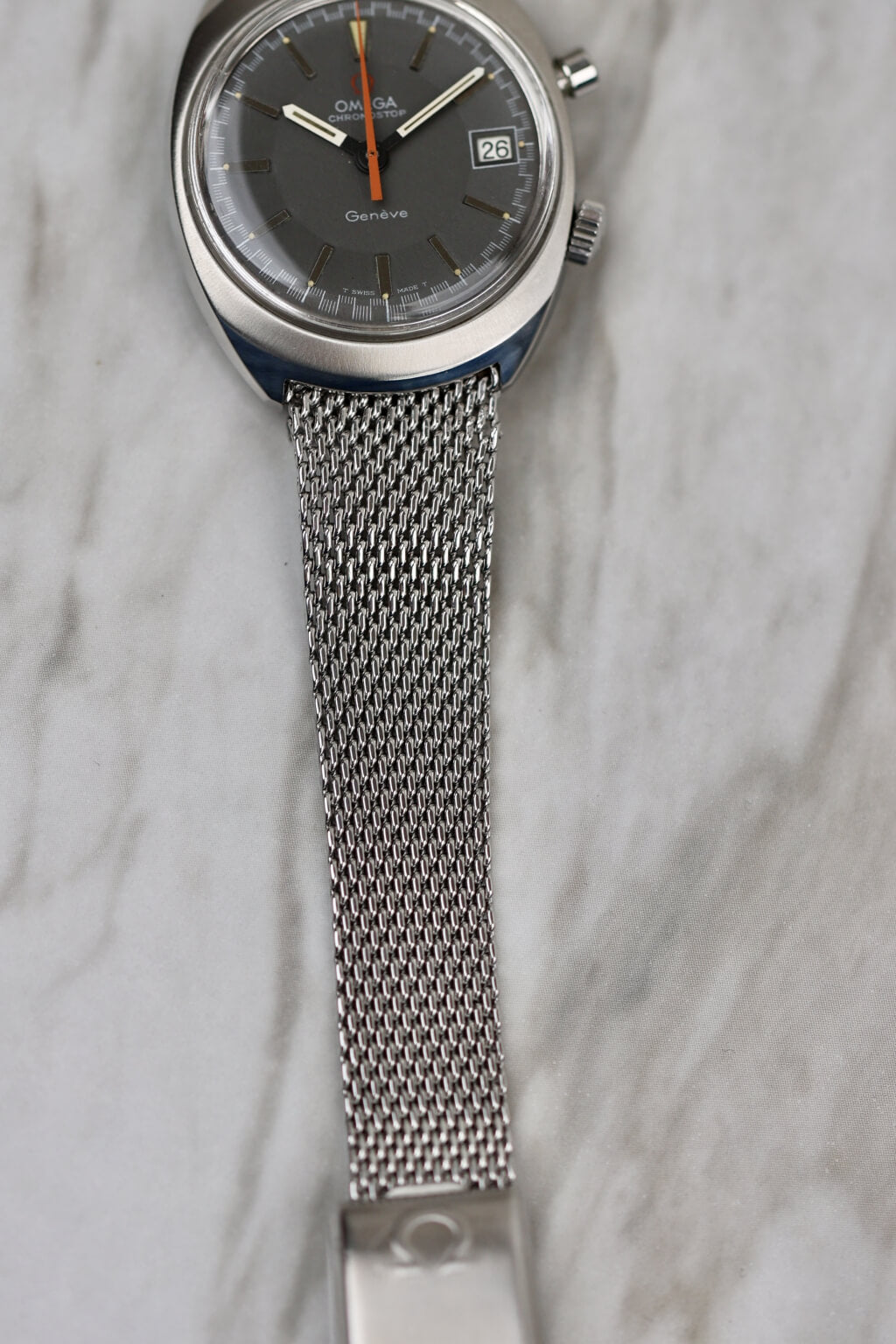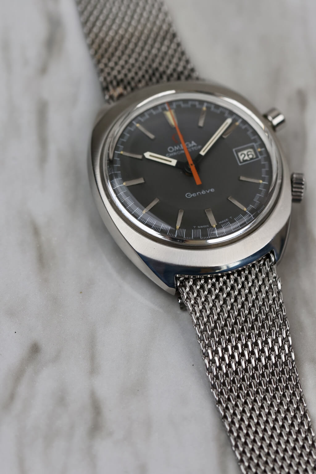 Die Omega Chronostop Ref. 146.009 ist ein markantes Modell aus den späten 1960er Jahren und verkörpert den Experimentiergeist, der Omega in dieser Zeit auszeichnete. Sie verfügt über einen einzigartigen Ein-Drücker-Chronographenmechanismus, angetrieben vom zuverlässigen Kaliber 920. Anders als herkömmliche Chronographen wird die Chronostop mit einem einzigen Drücker bedient: Einmal drücken, um die Zeitmessung zu starten, erneut drücken – und statt anzuhalten, springt sie auf Null zurück. Diese eigenwillige „stopplose“ Rückstellfunktion ist ebenso genial wie unterhaltsam und spiegelt Omegas spielerischen und zugleich technischen Ansatz der damaligen Zeit wider.