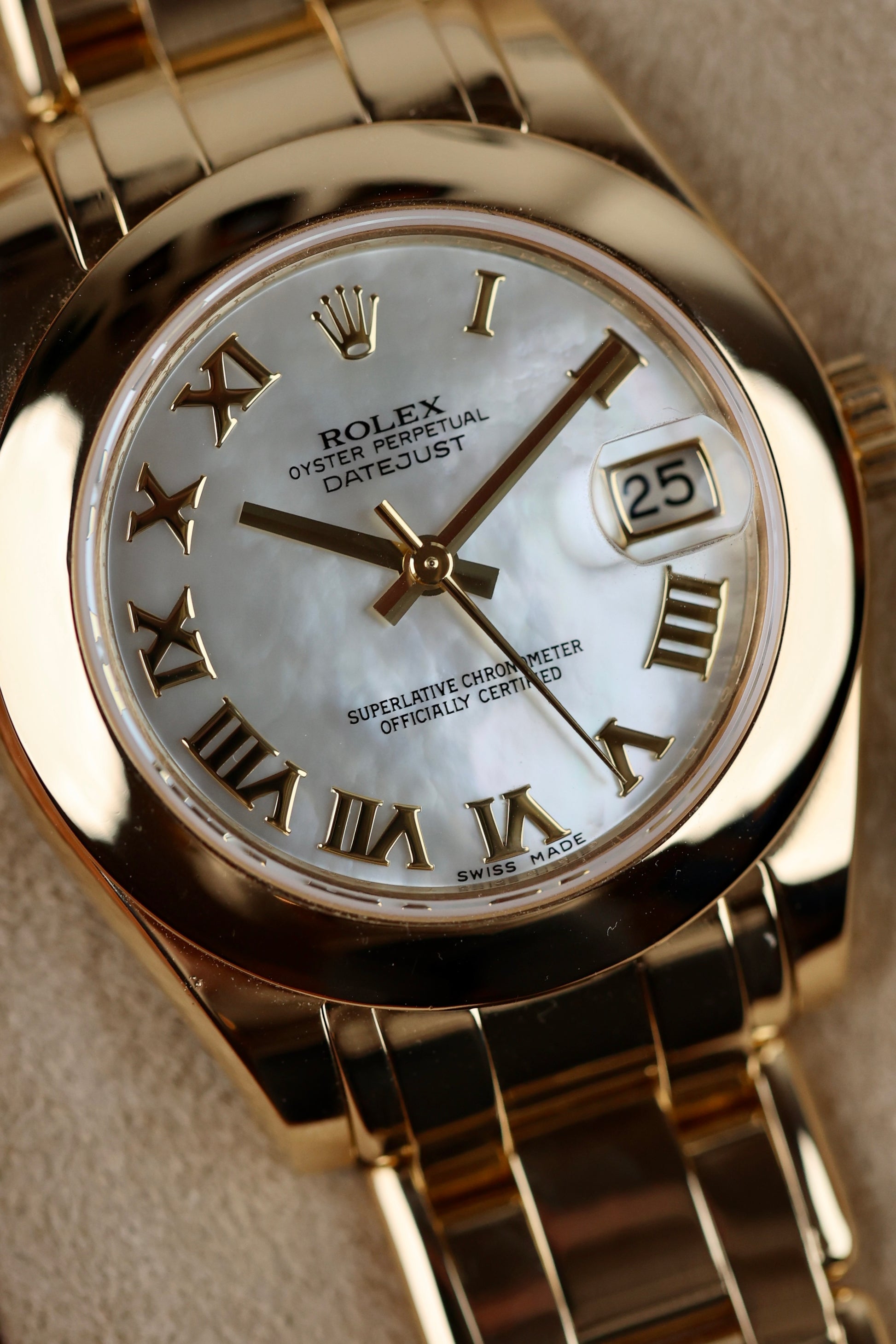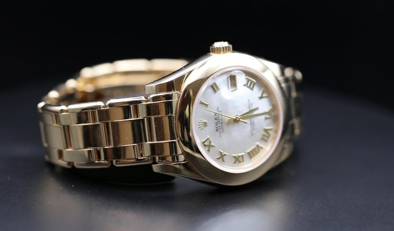 The Rolex Pearlmaster Ref. 81208 doesn’t play by the rules. It’s dressed in solid 18k yellow gold, but with a calm glow. And that Mother-of-Pearl dial? Completely unique to each watch. It shifts gently in the light, going from soft sheen to subtle shimmer, like the sky just before sunrise. No two dials are the same and that’s the charm. Sized at a sweet-spot 34mm, this Pearlmaster sits somewhere between dainty and bold. It features Roman numerals, a date window at 3 o’clock. It’s refined, sure, but built like a tank underneath all that gold.