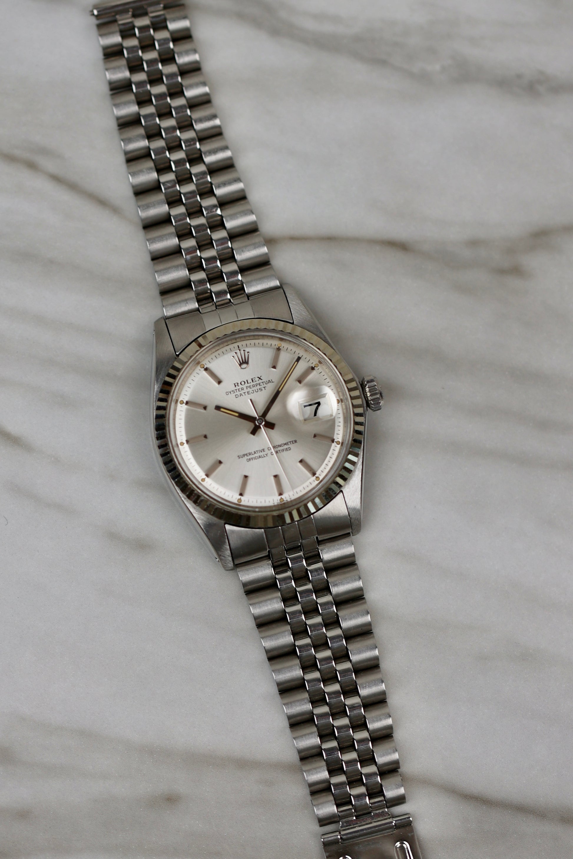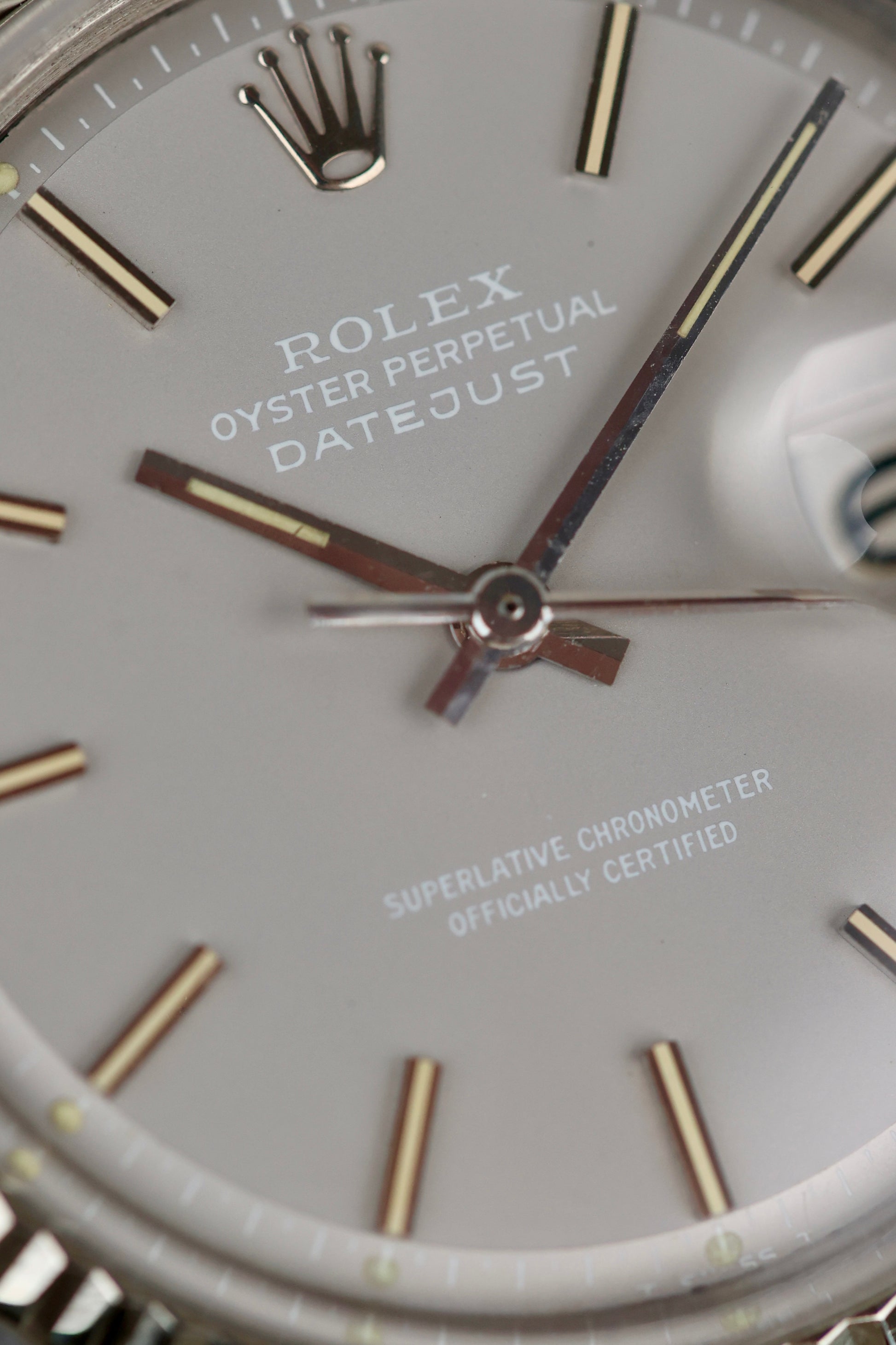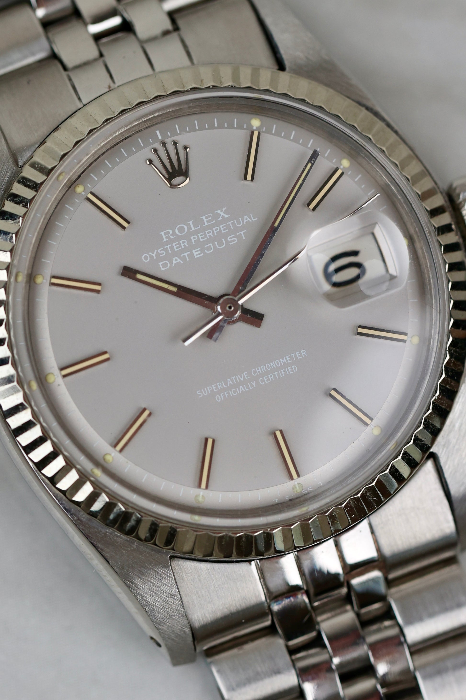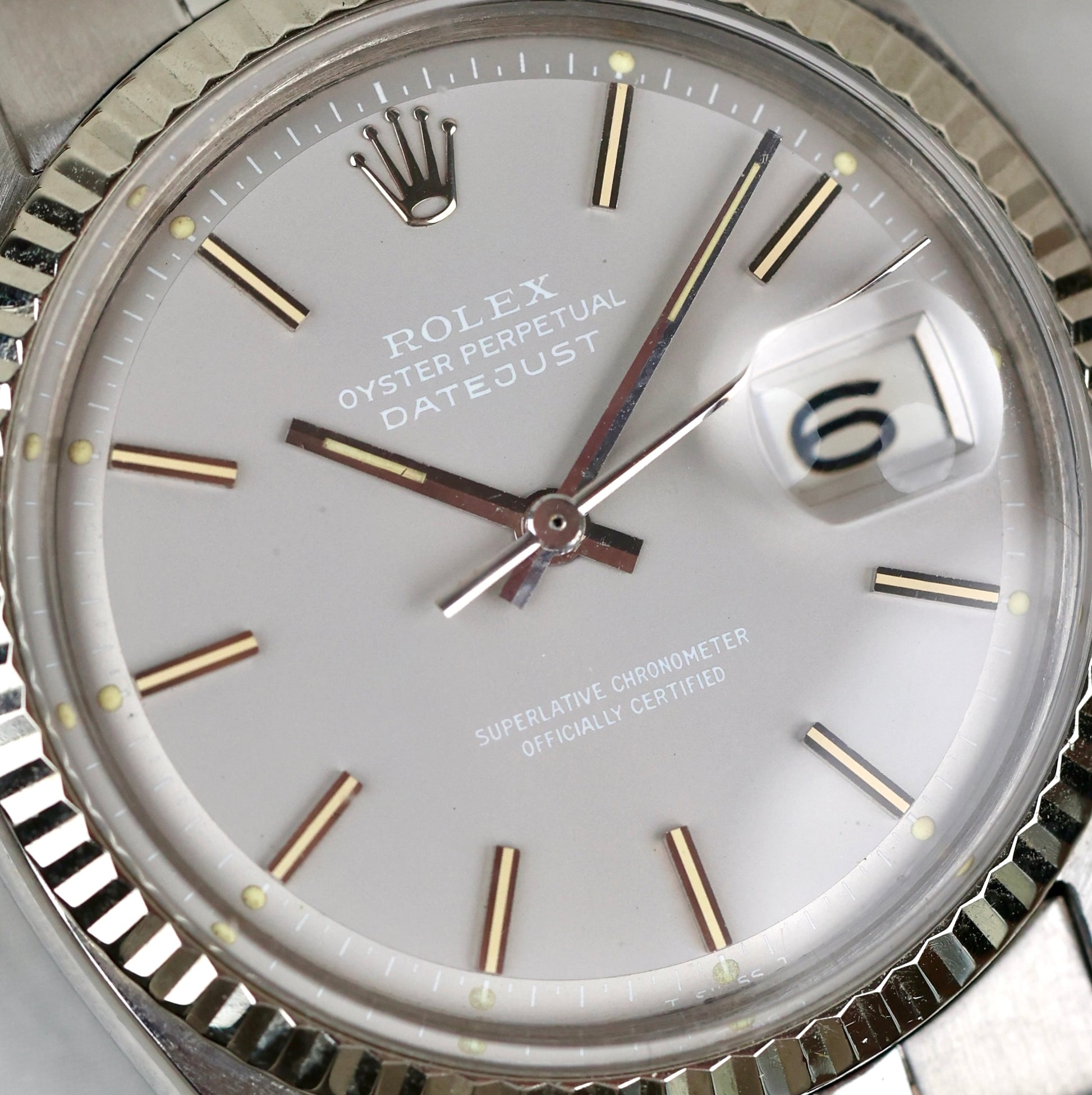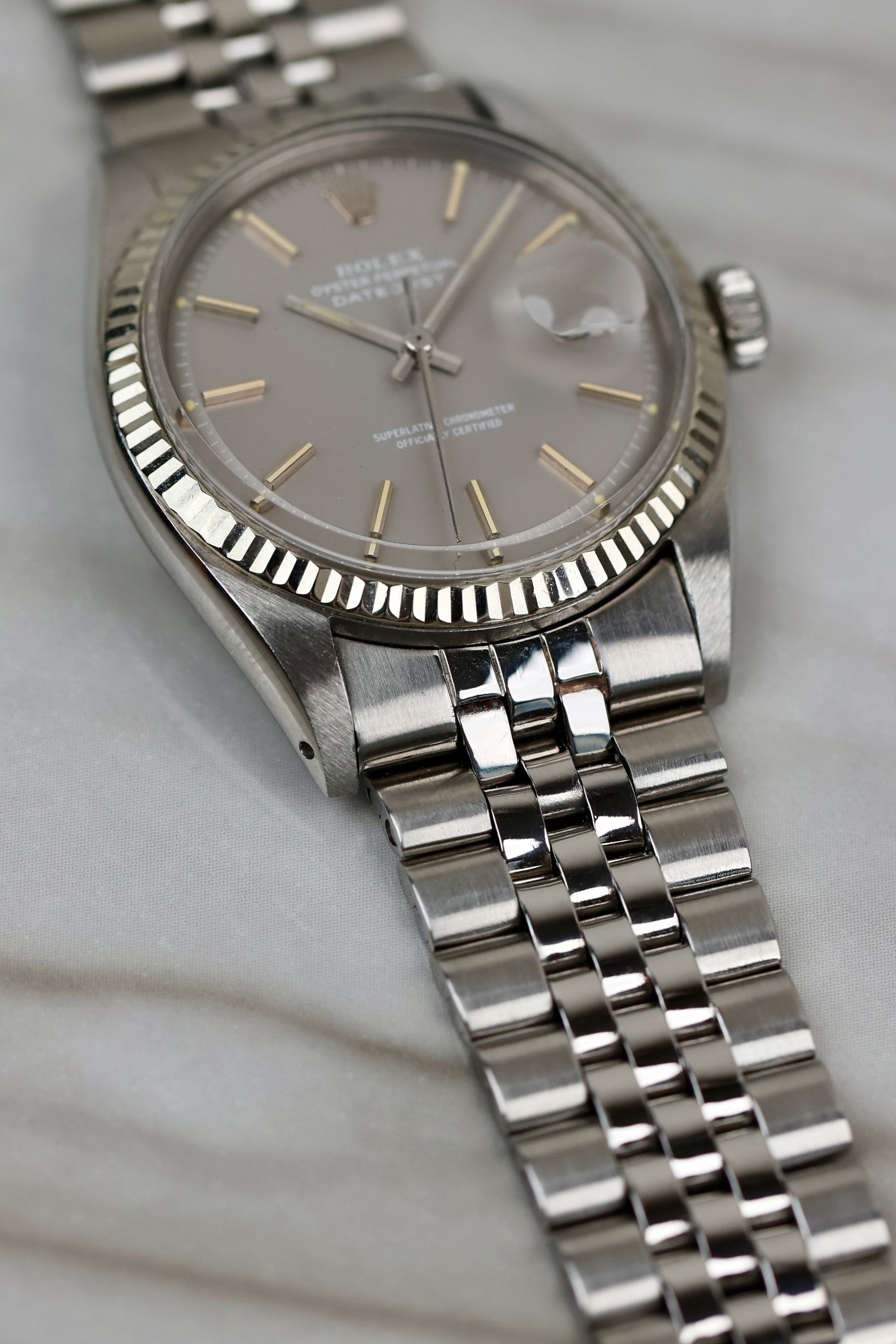 Das ist nicht einfach nur Vintage – es ist Vintage mit Charakter. Das verblasste graue Zifferblatt hat eine seidige, geisterhafte Patina entwickelt, auf der selbst der Rolex-Schriftzug in manchem Licht zu verschwinden scheint. Das klassische 36-mm-Edelstahlgehäuse mit geriffelter Lünette aus Weißgold harmoniert perfekt mit dem Jubilee-Armband und verleiht der Uhr einen zeitlosen Look. Angetrieben vom zuverlässigen Automatikwerk Kaliber 1570 (ohne Schnellverstellung), ist diese Uhr genau das Richtige für alle, die dezente Eleganz zu schätzen wissen.