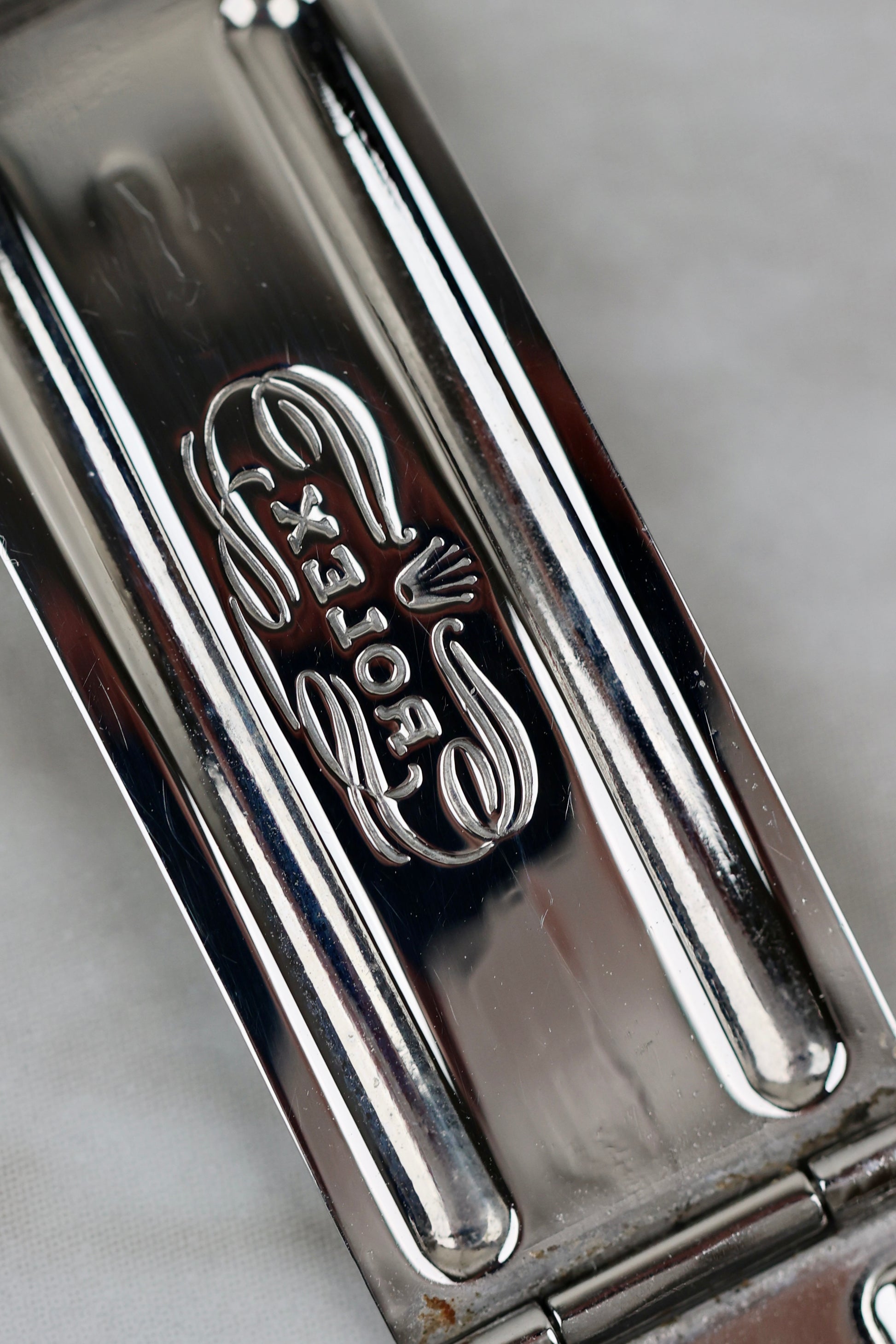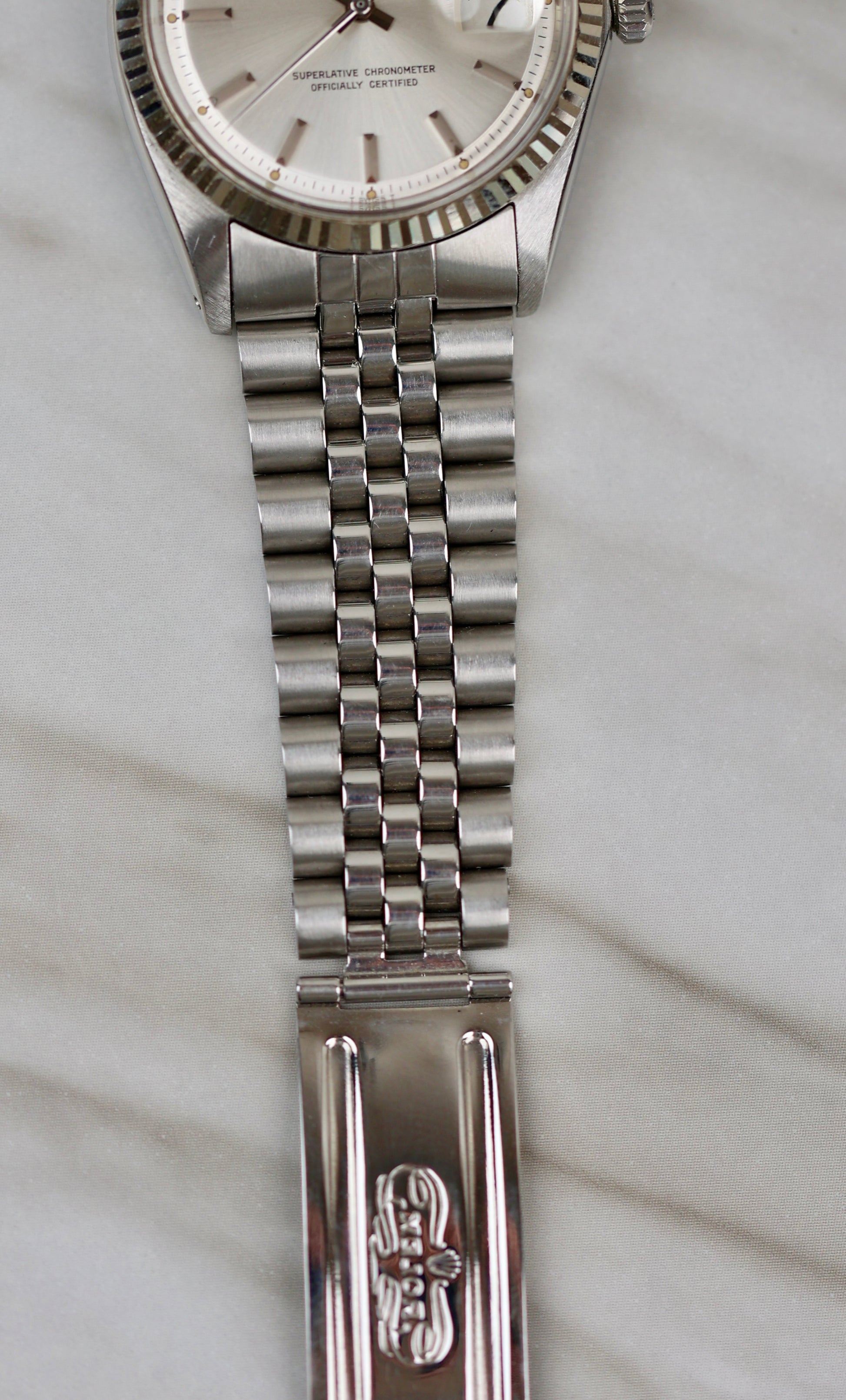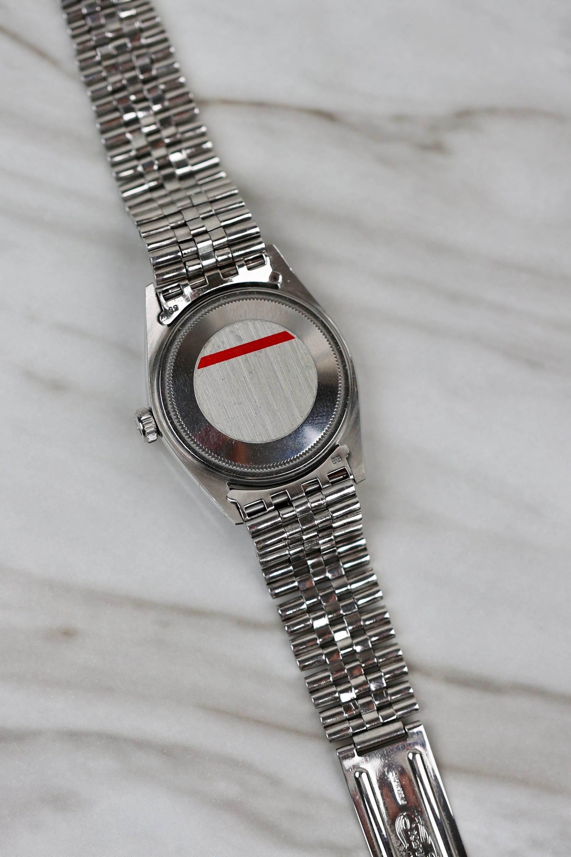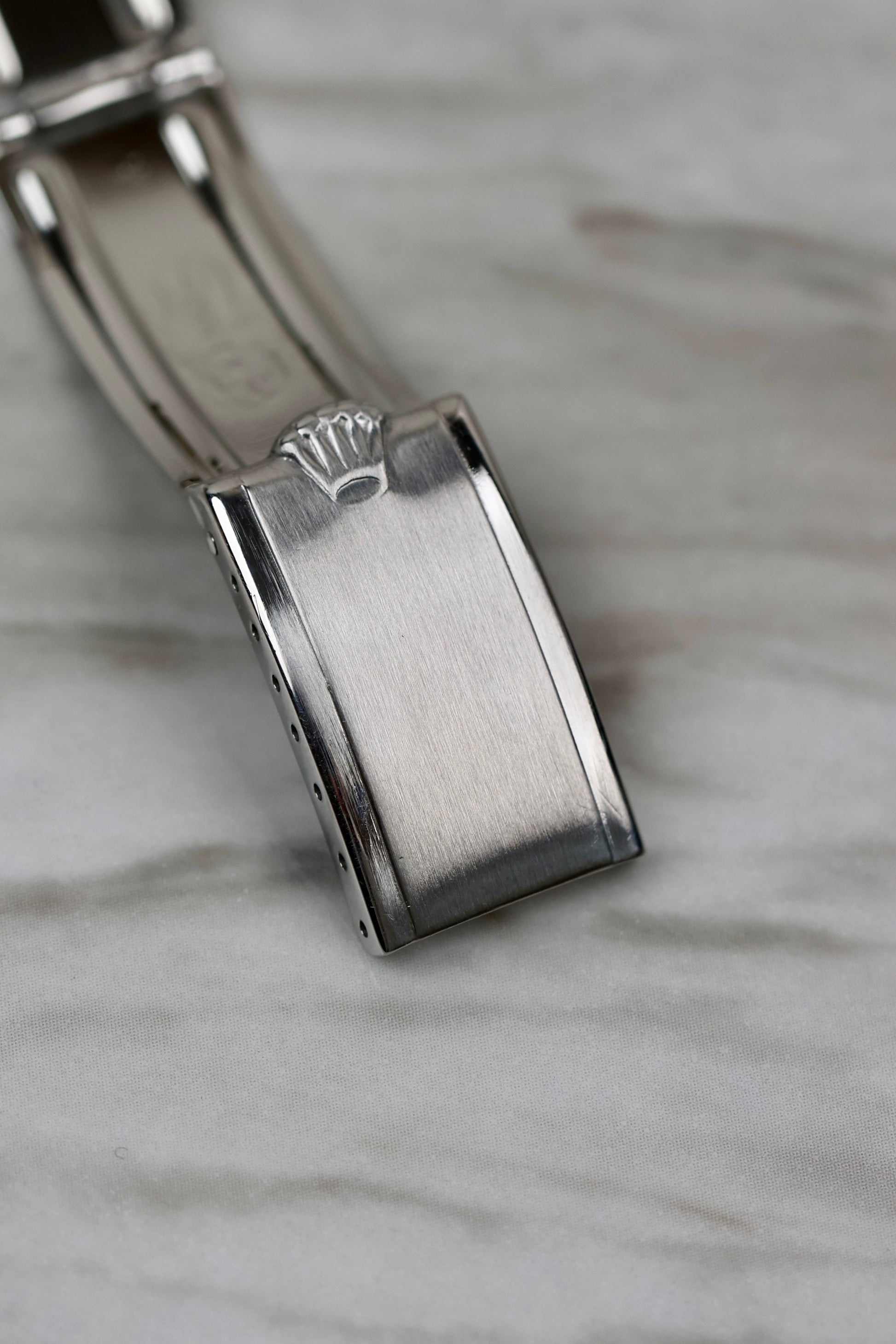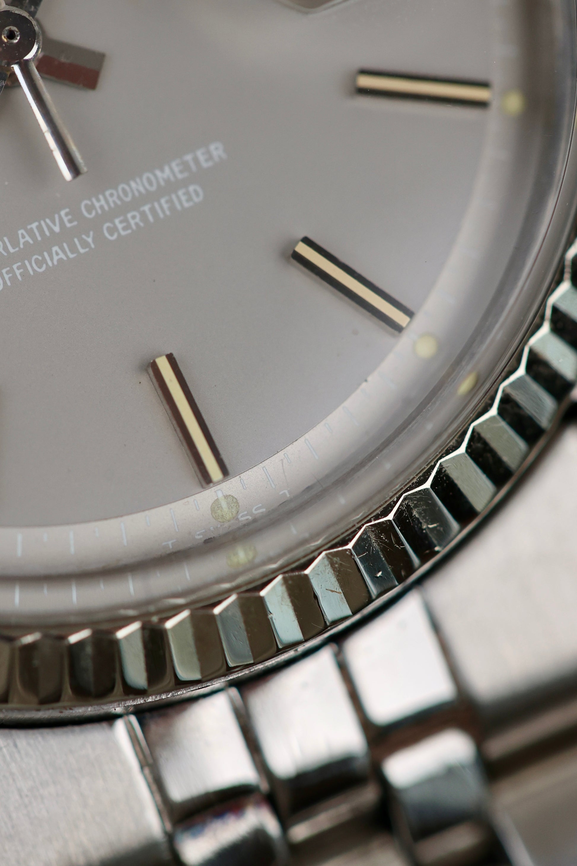 Das ist nicht einfach nur Vintage – es ist Vintage mit Charakter. Das verblasste graue Zifferblatt hat eine seidige, geisterhafte Patina entwickelt, auf der selbst der Rolex-Schriftzug in manchem Licht zu verschwinden scheint. Das klassische 36-mm-Edelstahlgehäuse mit geriffelter Lünette aus Weißgold harmoniert perfekt mit dem Jubilee-Armband und verleiht der Uhr einen zeitlosen Look. Angetrieben vom zuverlässigen Automatikwerk Kaliber 1570 (ohne Schnellverstellung), ist diese Uhr genau das Richtige für alle, die dezente Eleganz zu schätzen wissen.