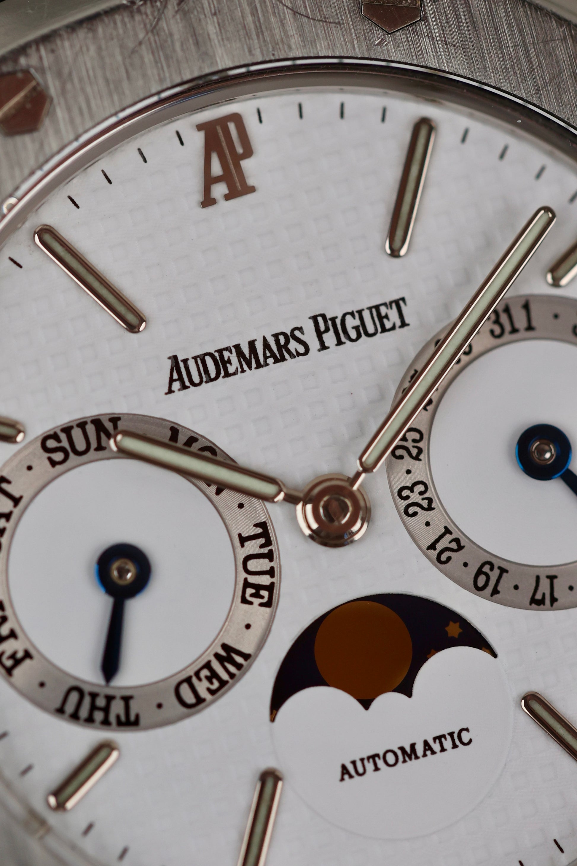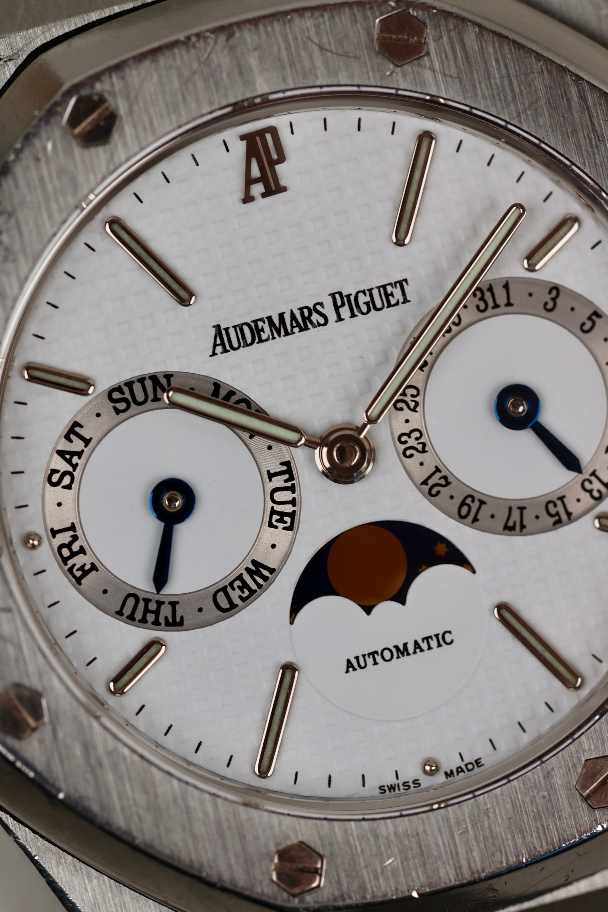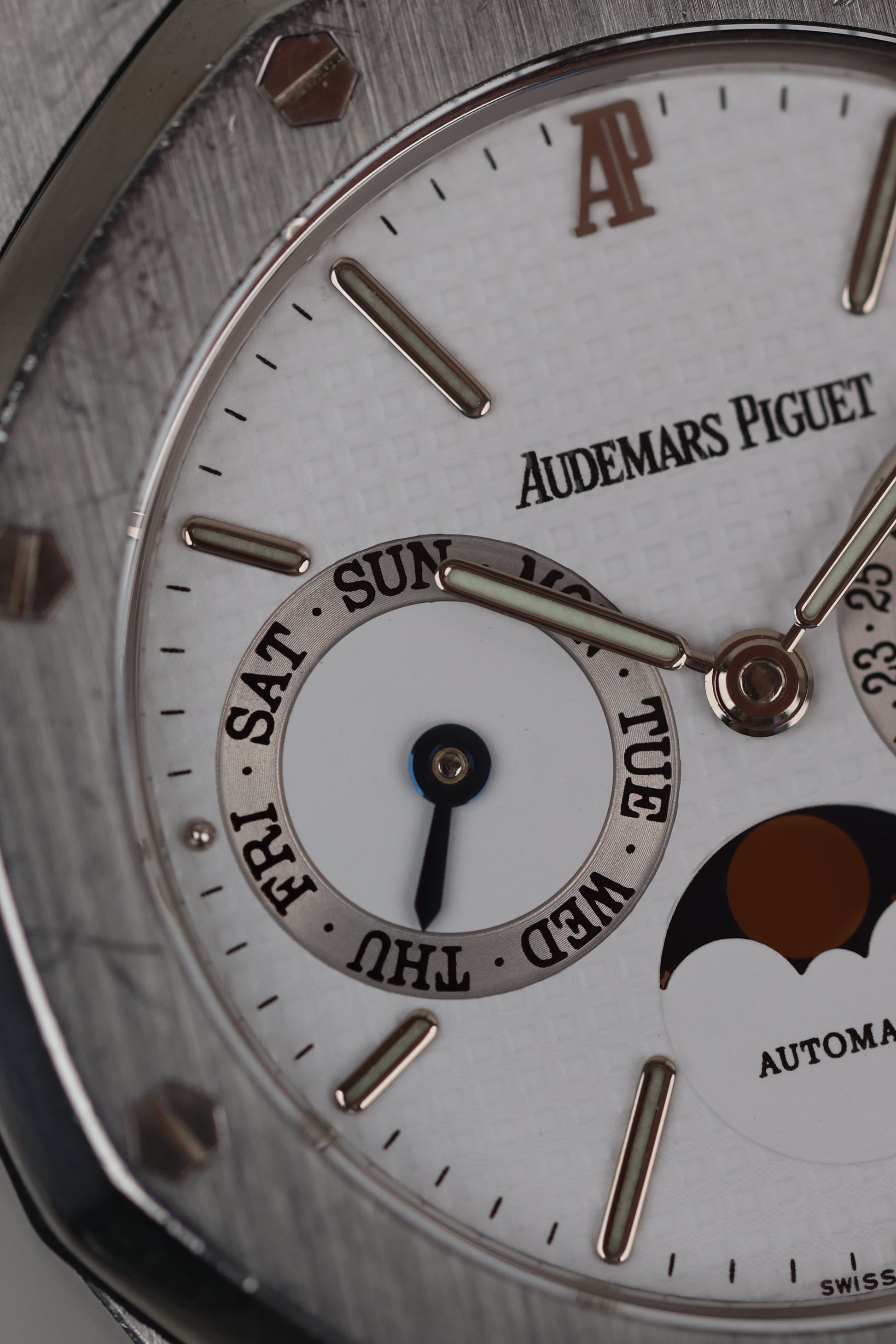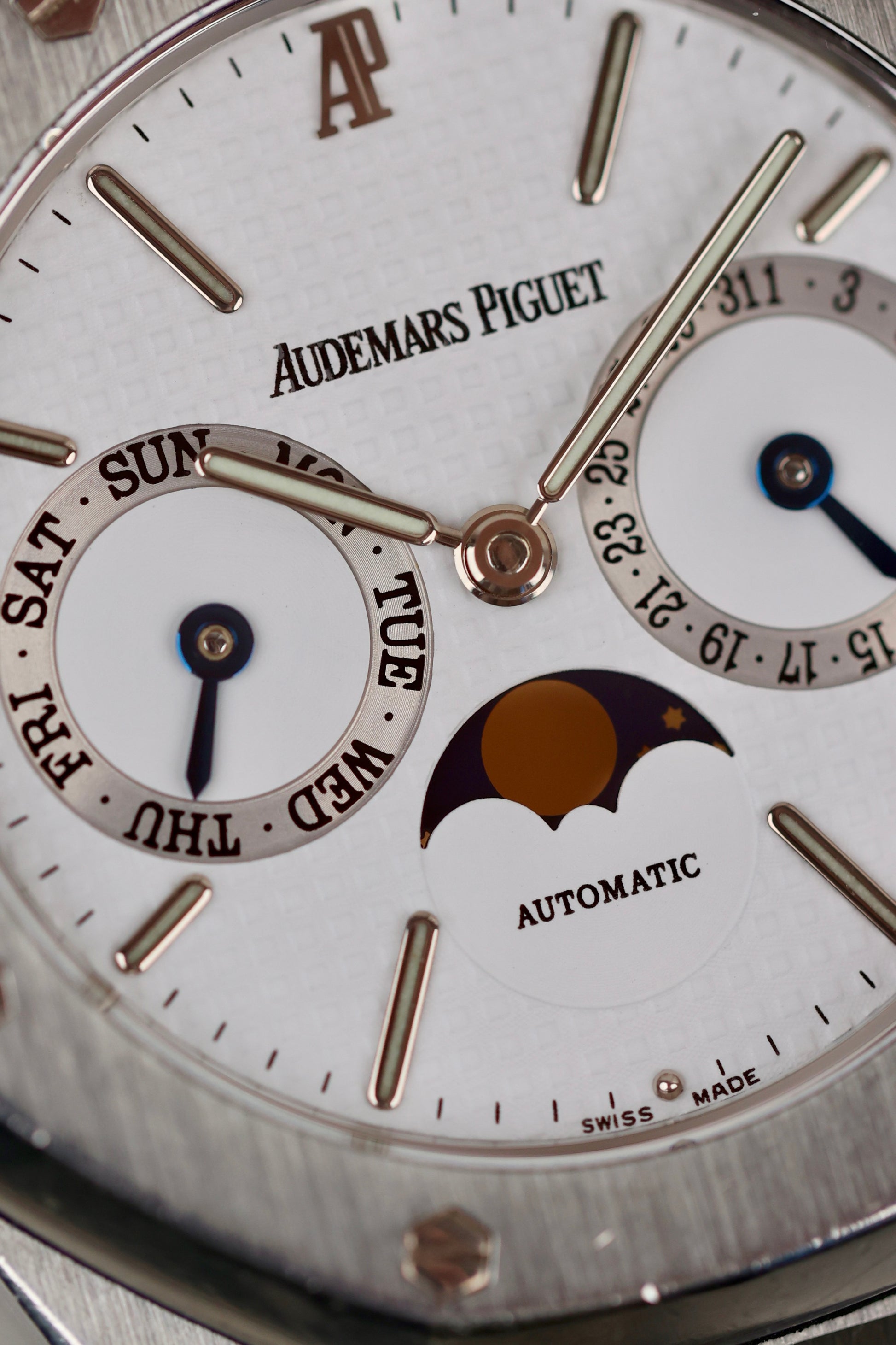 The Royal Oak reference 25594 is a direct descendant of the iconic Royal Oak Day Date 5572, which was originally introduced in 1983. Though developed simultaneously, Model 25594 was unveiled a year later with an added moon-phase aperture, enhancing its dial with exceptional aesthetic balance.The model quickly gained popularity, selling 333 units in 1984 and over 600 the following year. However, what truly sets this Royal Oak apart is its extraordinary longevity. It remained in the catalogue for more than two decades, from 1985 to 2006, making it the only Royal Oak model to achieve this milestone.Throughout a 25-year span, the catalogues featured fewer than 10 dial variations, encompassing all available materials. While the steel variants constitute more than half of the production of the Royal Oak Day Date Moon Phase 25594 model, their commercial success experienced ups and downs. After a relatively slow period of sales in the 1980s, the 1990s witnessed a more dynamic market, and it was in the 21st century that the model consistently exceeded 200 watches sold per year.