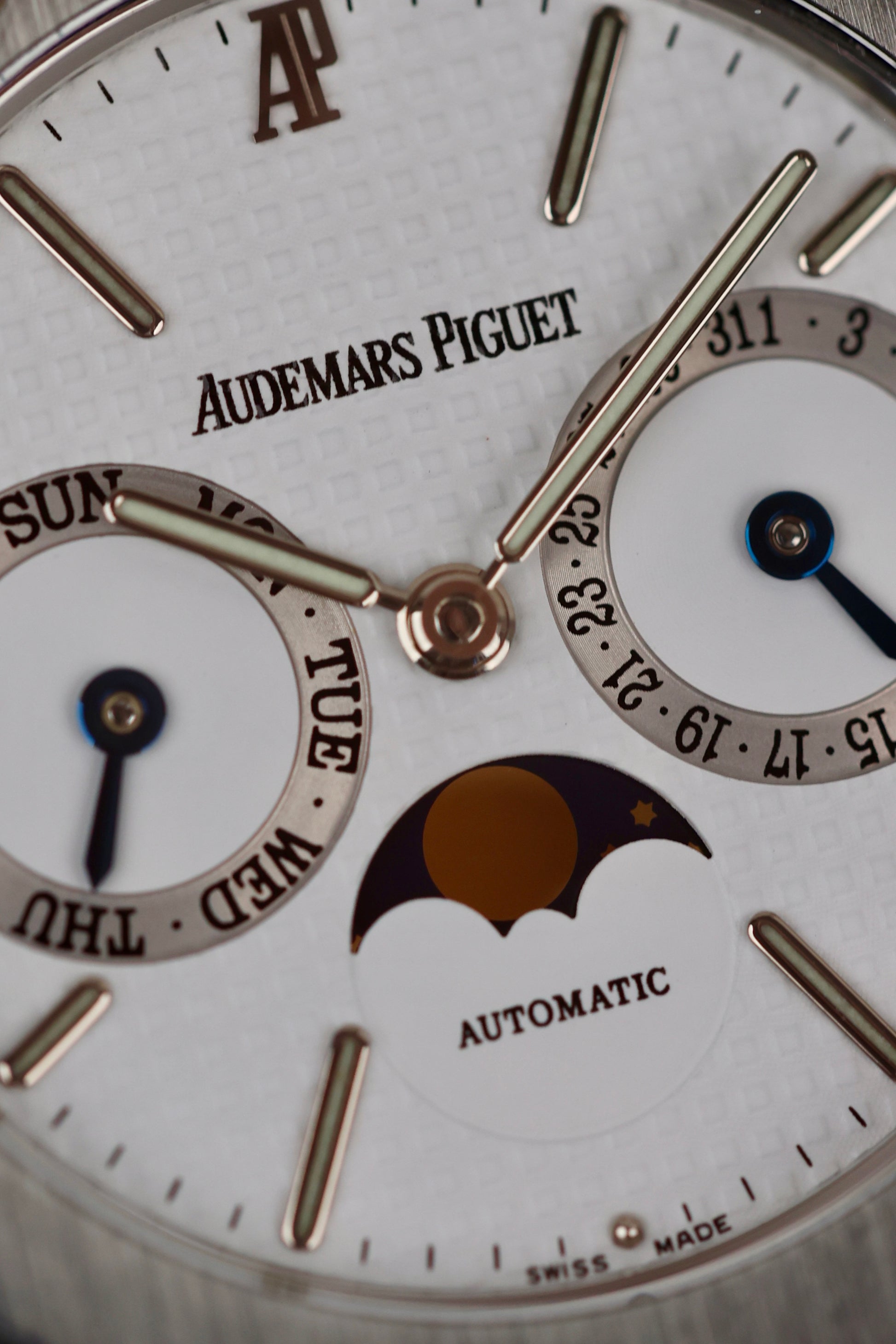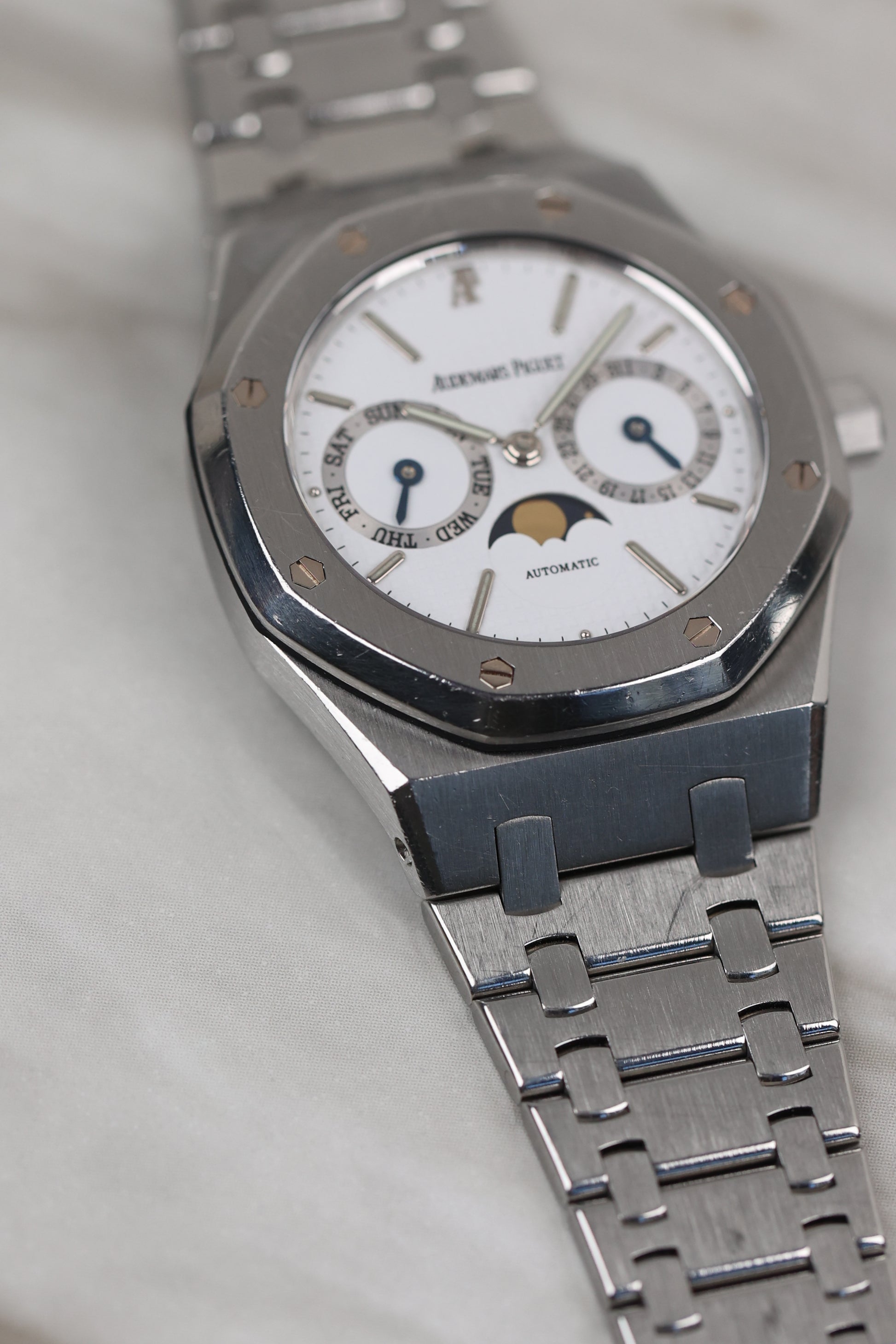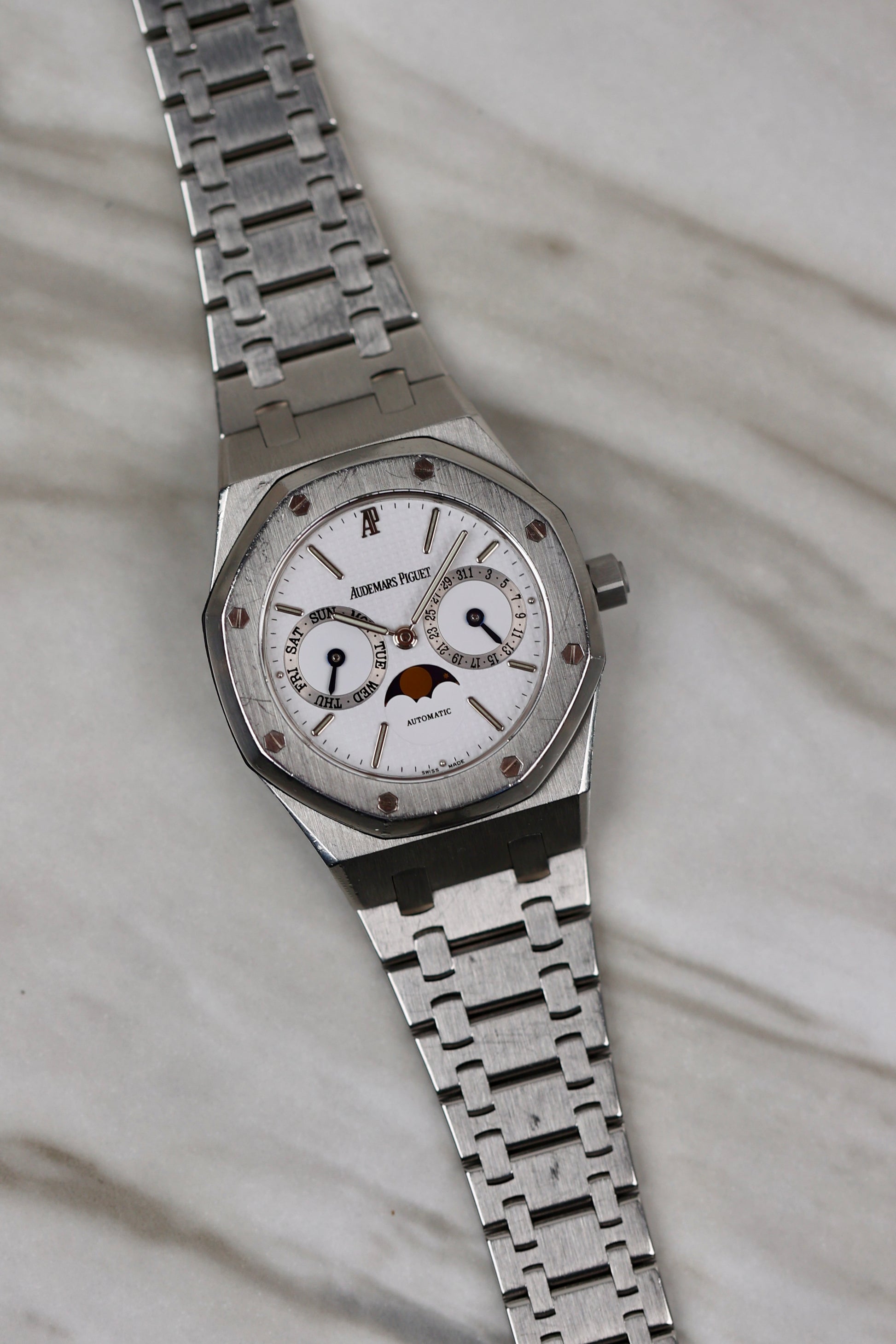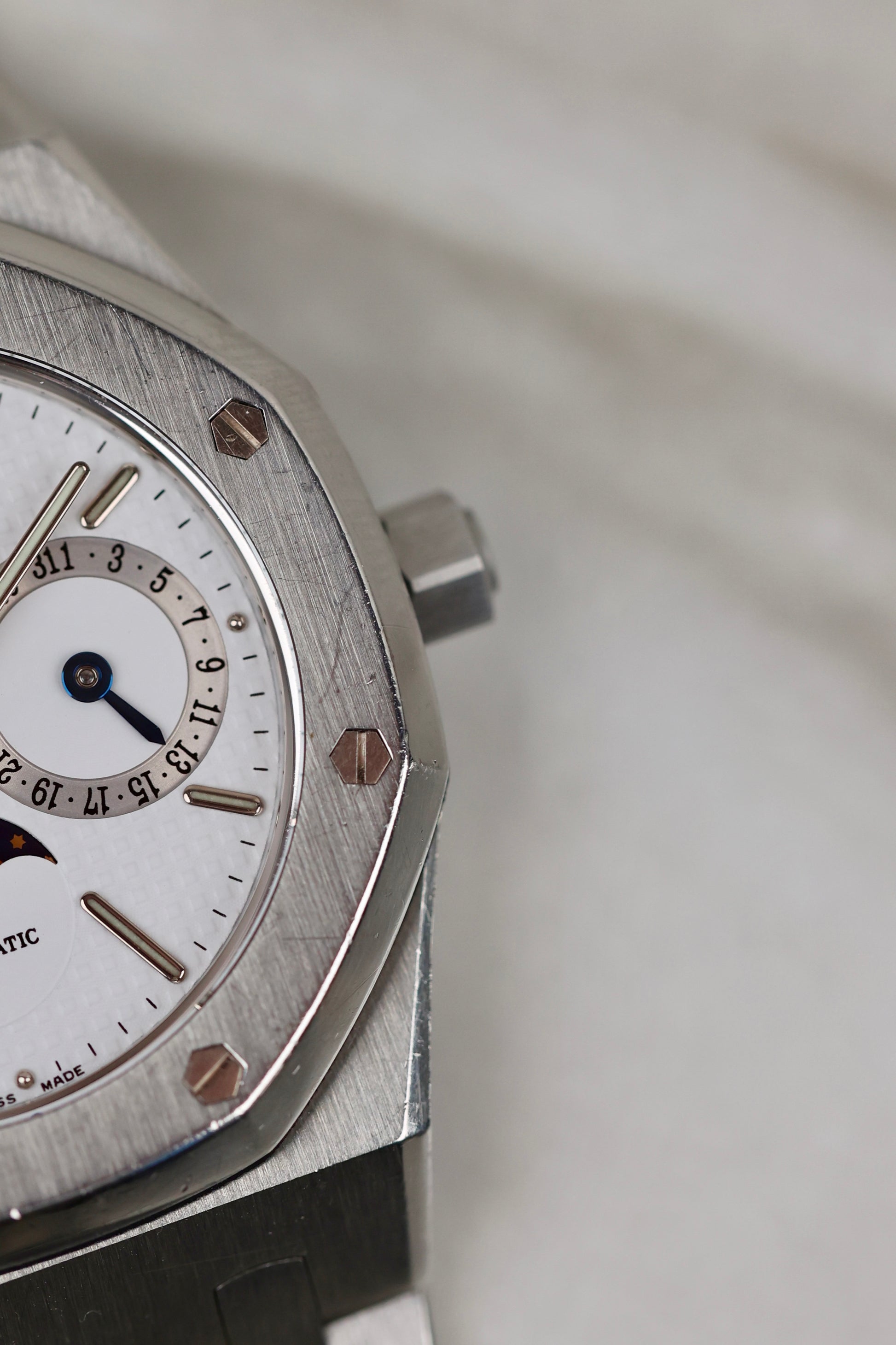 The Royal Oak reference 25594 is a direct descendant of the iconic Royal Oak Day Date 5572, which was originally introduced in 1983. Though developed simultaneously, Model 25594 was unveiled a year later with an added moon-phase aperture, enhancing its dial with exceptional aesthetic balance.The model quickly gained popularity, selling 333 units in 1984 and over 600 the following year. However, what truly sets this Royal Oak apart is its extraordinary longevity. It remained in the catalogue for more than two decades, from 1985 to 2006, making it the only Royal Oak model to achieve this milestone.Throughout a 25-year span, the catalogues featured fewer than 10 dial variations, encompassing all available materials. While the steel variants constitute more than half of the production of the Royal Oak Day Date Moon Phase 25594 model, their commercial success experienced ups and downs. After a relatively slow period of sales in the 1980s, the 1990s witnessed a more dynamic market, and it was in the 21st century that the model consistently exceeded 200 watches sold per year.