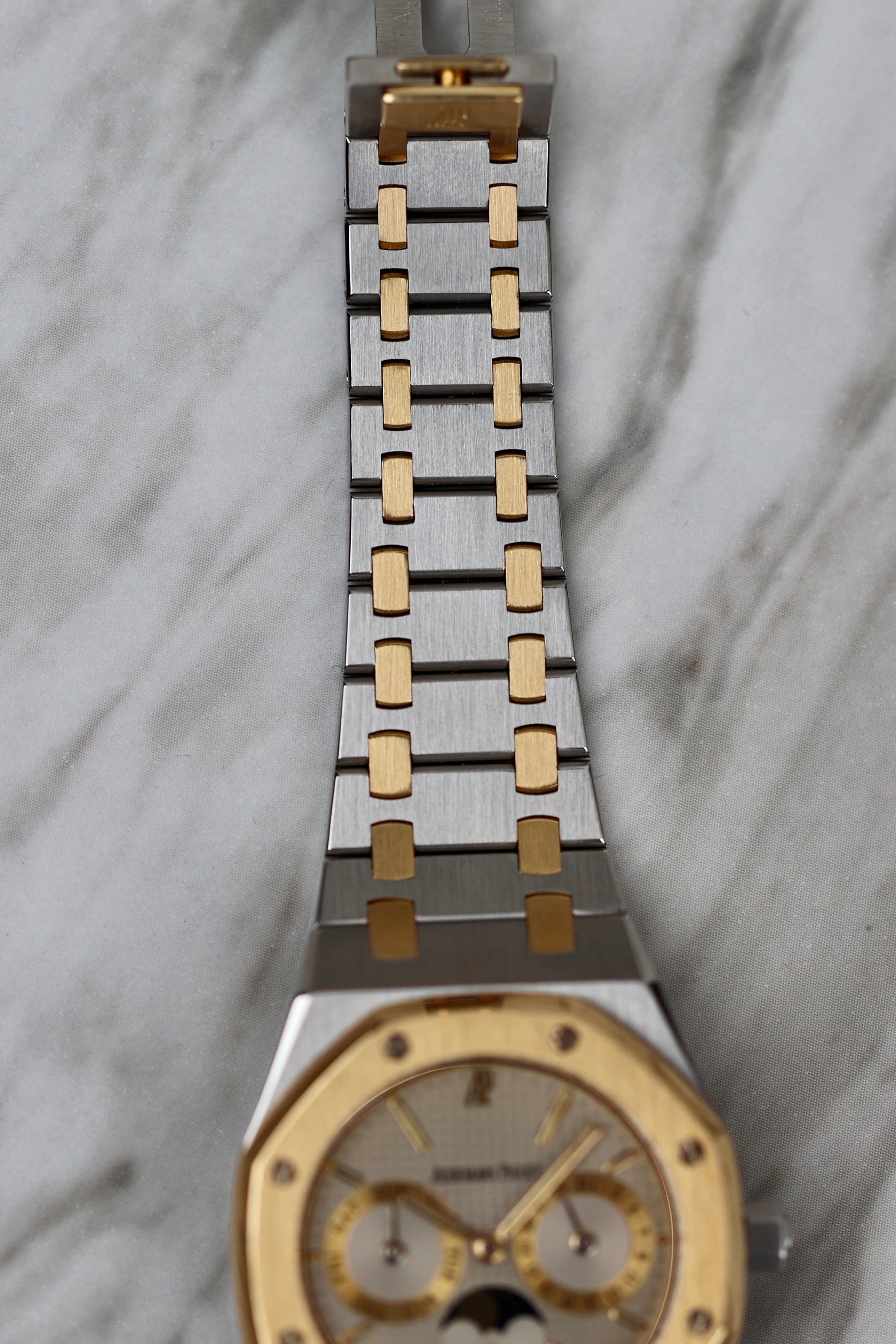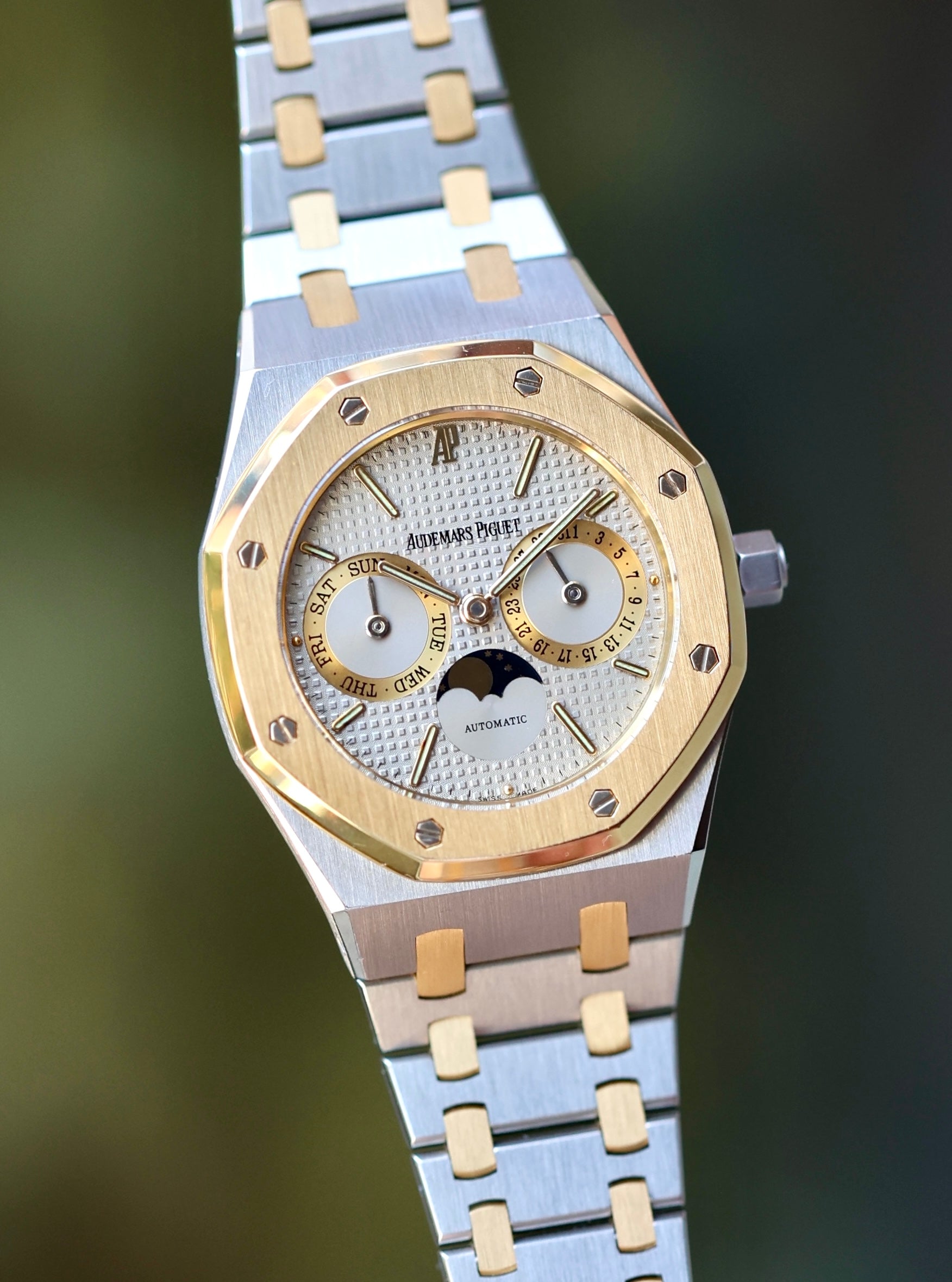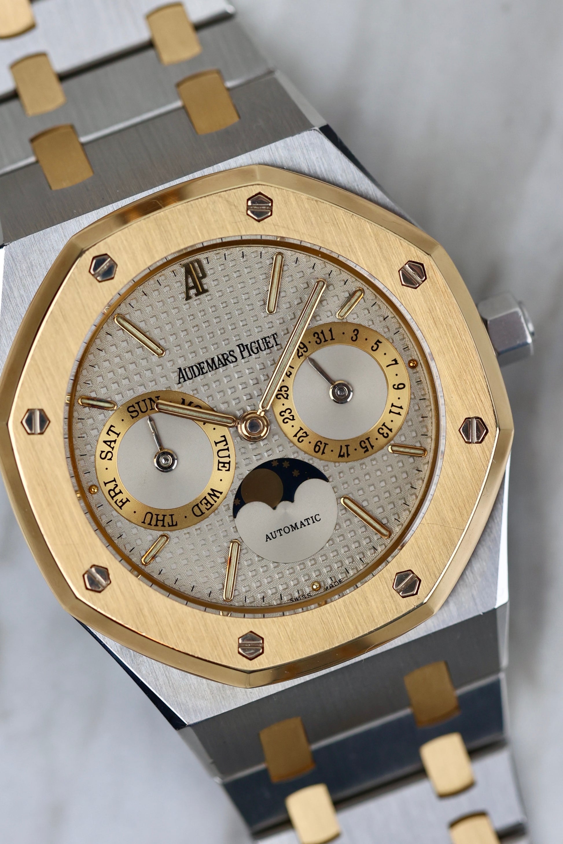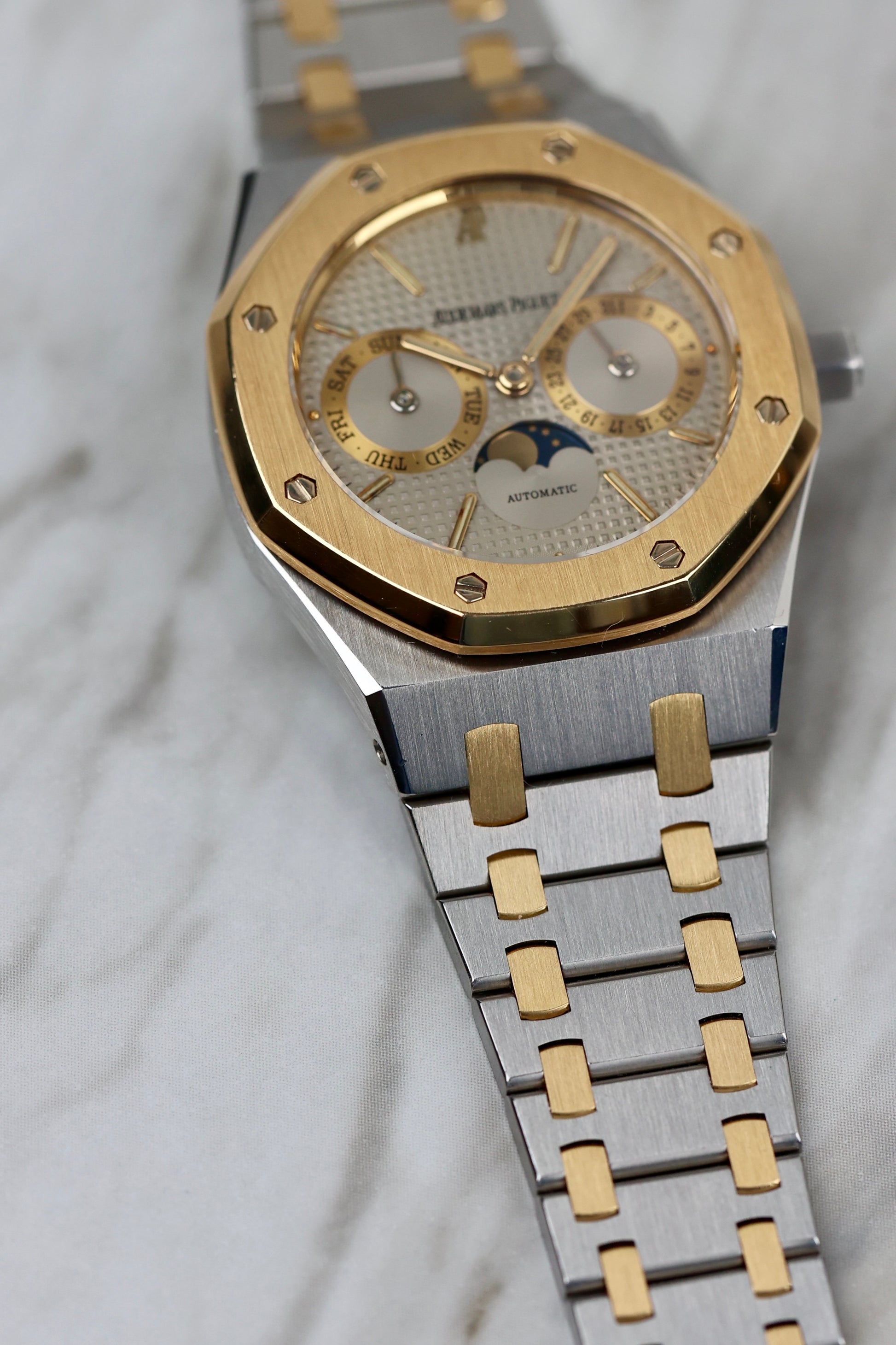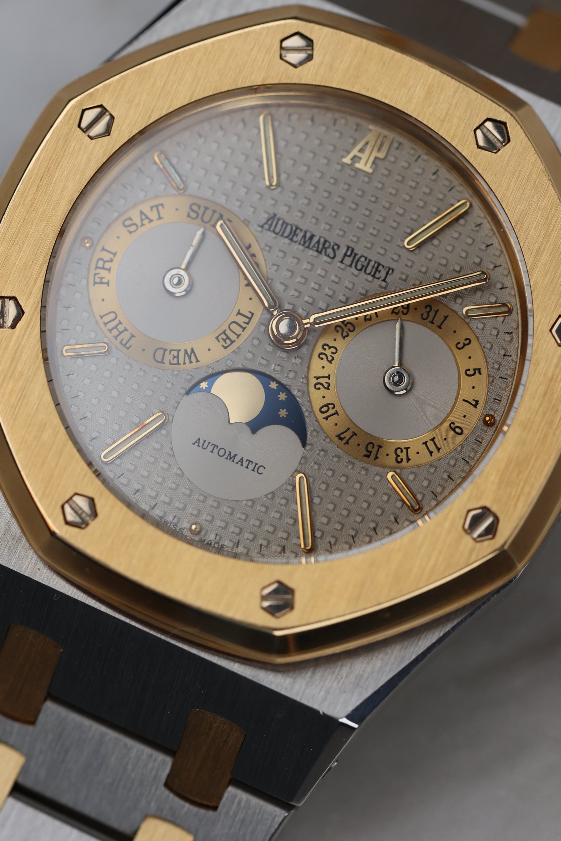 The Royal Oak reference 25594 is a direct descendant of the iconic Royal Oak Day Date 5572, which was originally introduced in 1983. Though developed simultaneously, Model 25594 was unveiled a year later with an added moon-phase aperture, enhancing its dial with exceptional aesthetic balance.The model quickly gained popularity, selling 333 units in 1984 and over 600 the following year. However, what truly sets this Royal Oak apart is its extraordinary longevity. It remained in the catalogue for more than two decades, from 1985 to 2006, making it the only Royal Oak model to achieve this milestone.Throughout a 25-year span, the catalogues featured fewer than 10 dial variations, encompassing all available materials. While the steel variants constitute more than half of the production of the Royal Oak Day Date Moon Phase 25594 model, their commercial success experienced ups and downs. After a relatively slow period of sales in the 1980s, the 1990s witnessed a more dynamic market, and it was in the 21st century that the model consistently exceeded 200 watches sold per year.