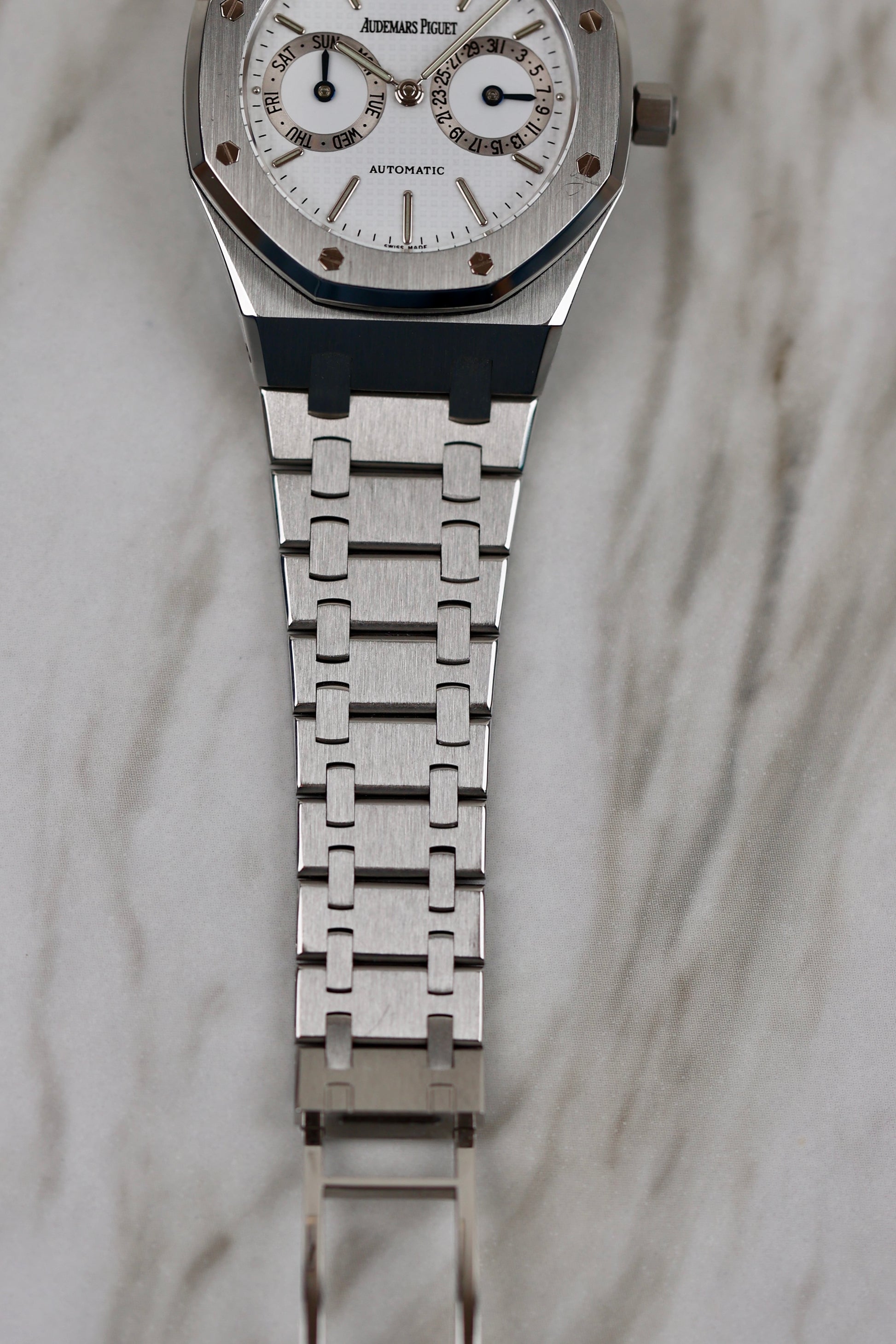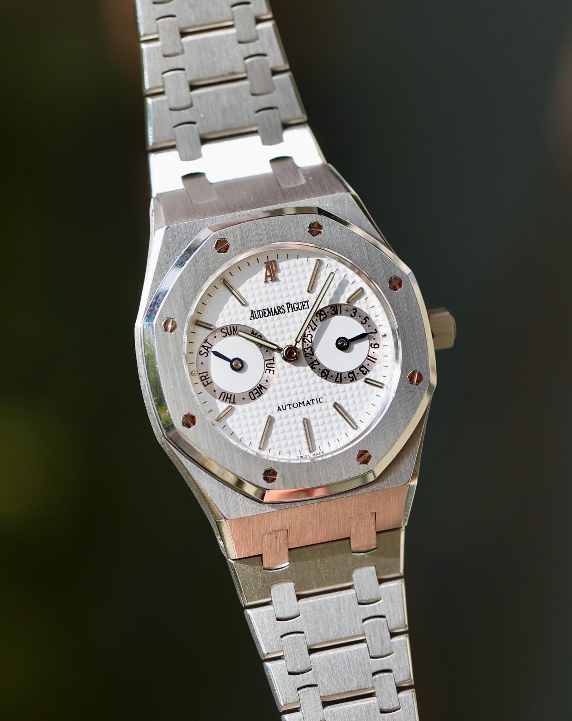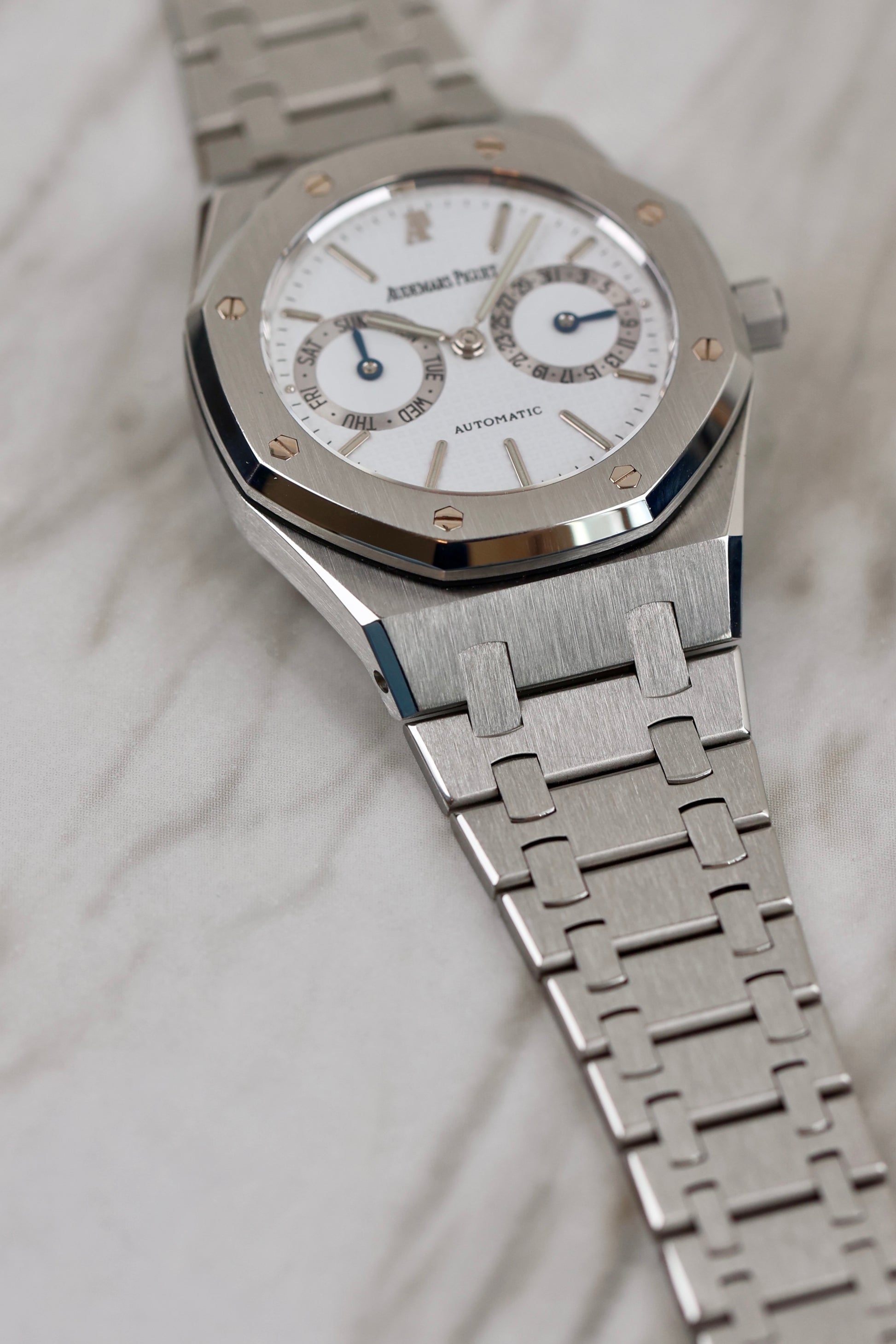The Audemars Piguet Royal Oak Ref. 25572ST, introduced in 1977, was the first model to feature a Day-Date complication in the Royal Oak collection. This 36mm stainless steel timepiece maintains the iconic octagonal bezel and integrated bracelet, signature design elements of the Royal Oak. The white dial with the "tapisserie" pattern is paired with gold hour markers, offering a refined contrast. The watch is powered by the Caliber 2121.