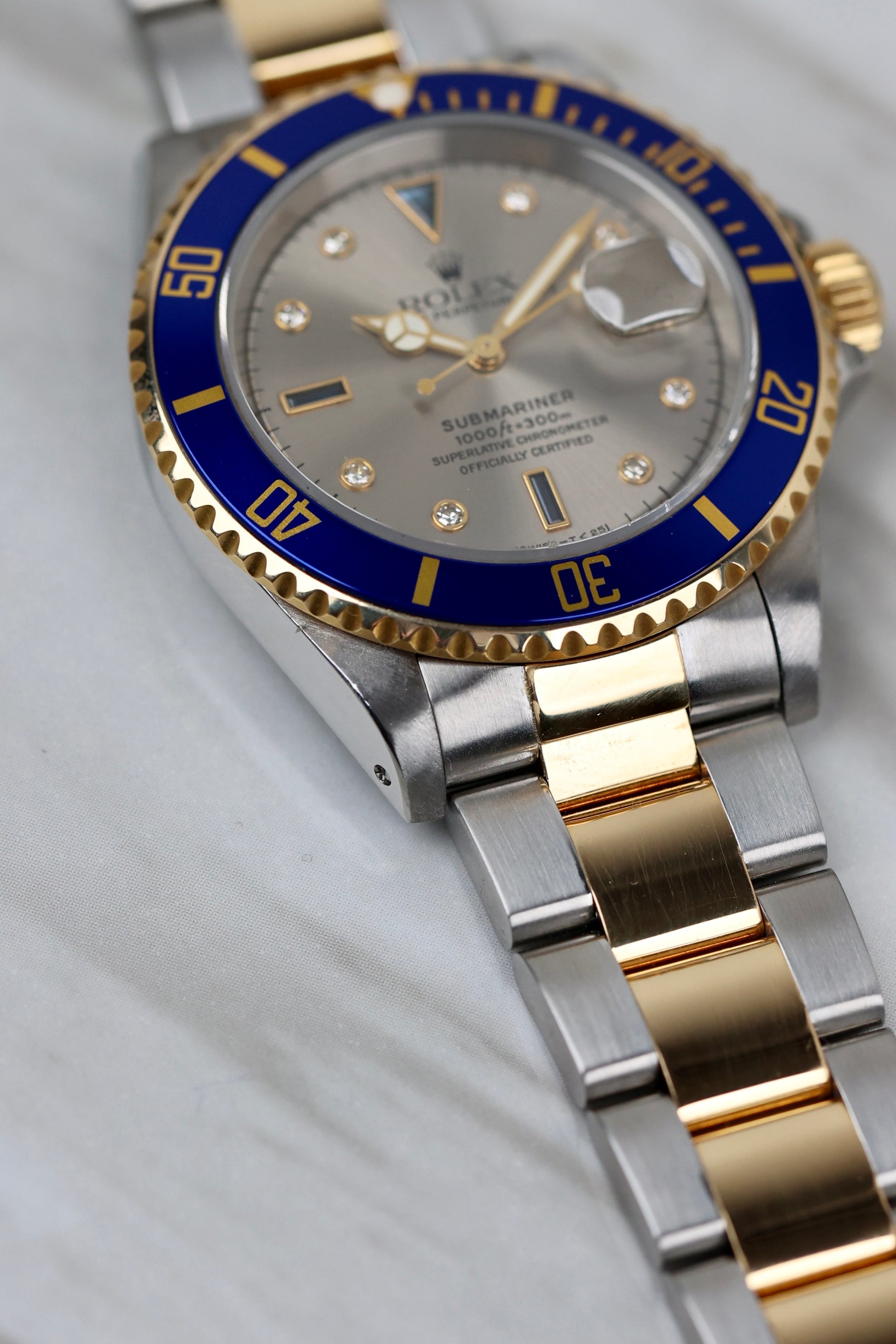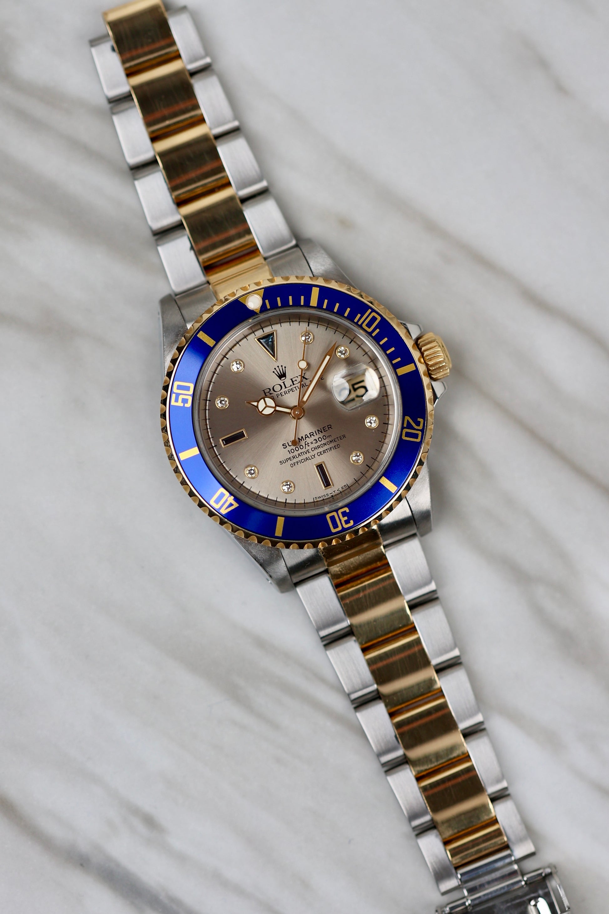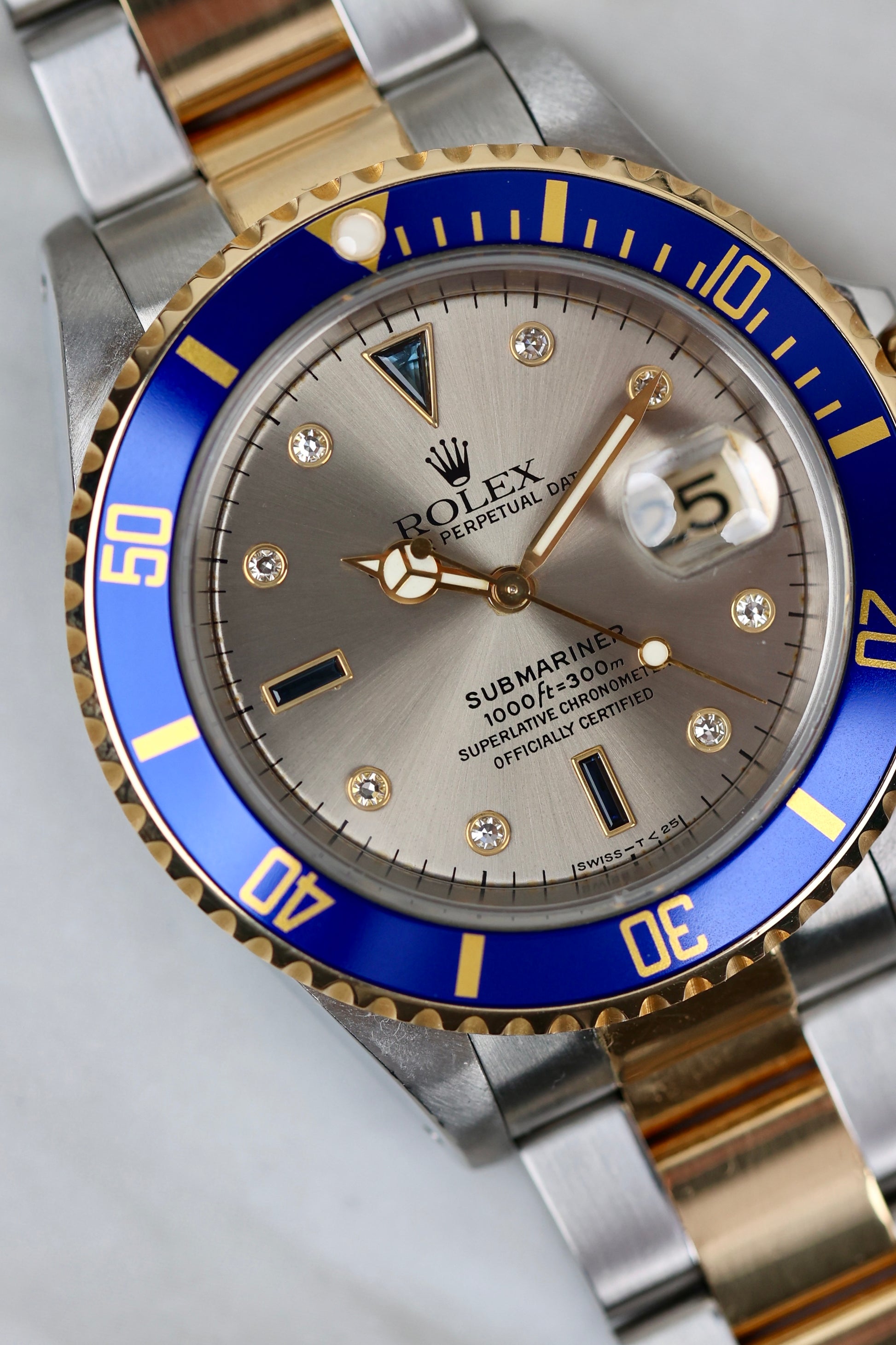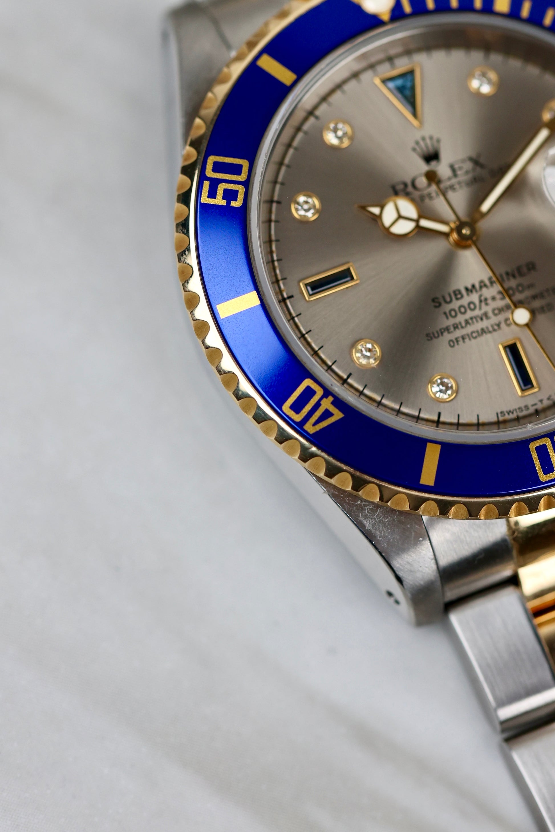 Produced from 1988 to around 2010, this two-tone Submariner stands out with its rare Serti dial, a (factory-set) configuration featuring diamond and sapphire hour markers. It’s a watch that mixes rugged dive specs with just the right amount of flash. The 16613 was also one of the last Submariners to feature the classic slimmer case and aluminum bezel, making it a fan favorite among collectors today. This example also features an extendable clasp so you can wear it comfortably over a wetsuit.