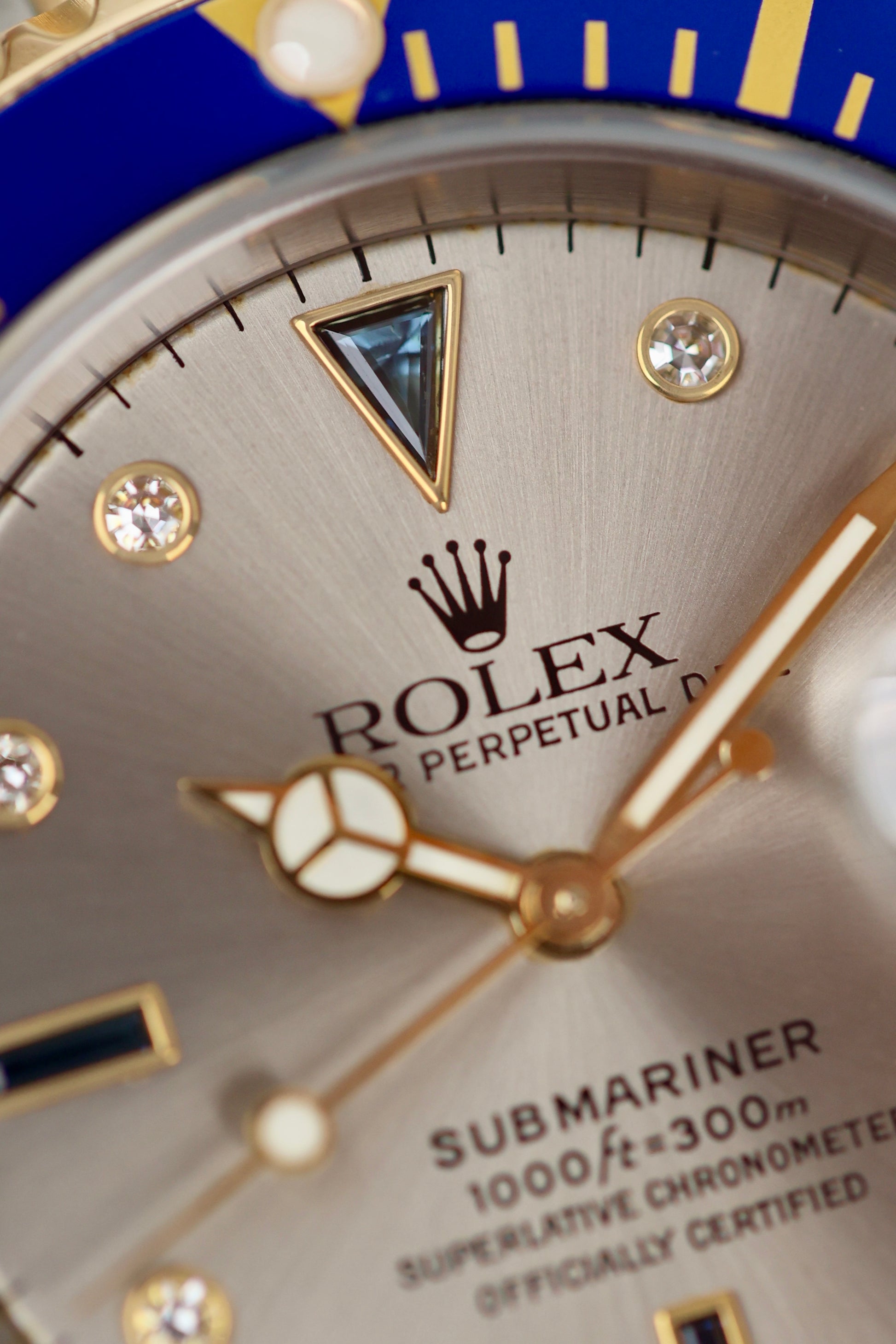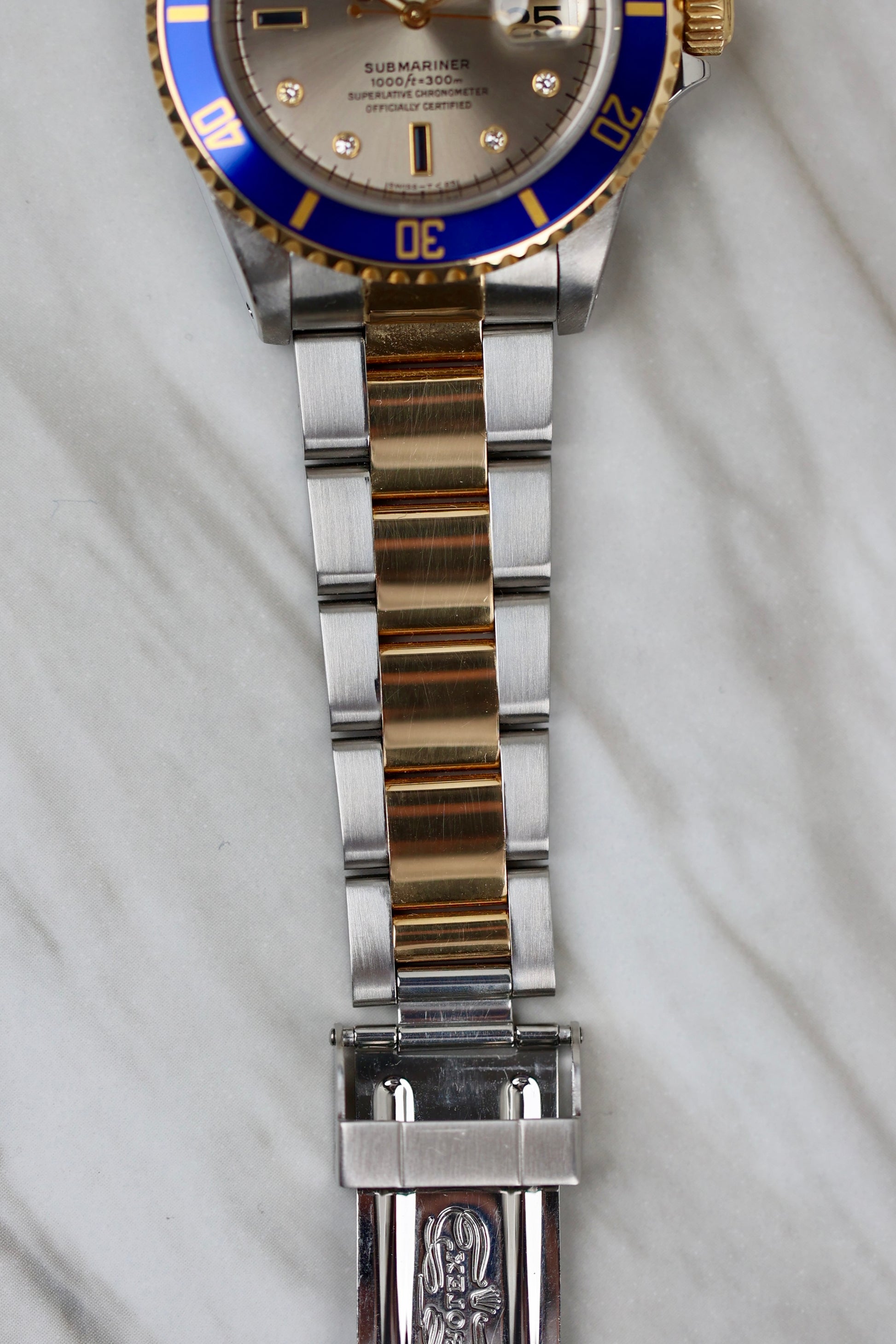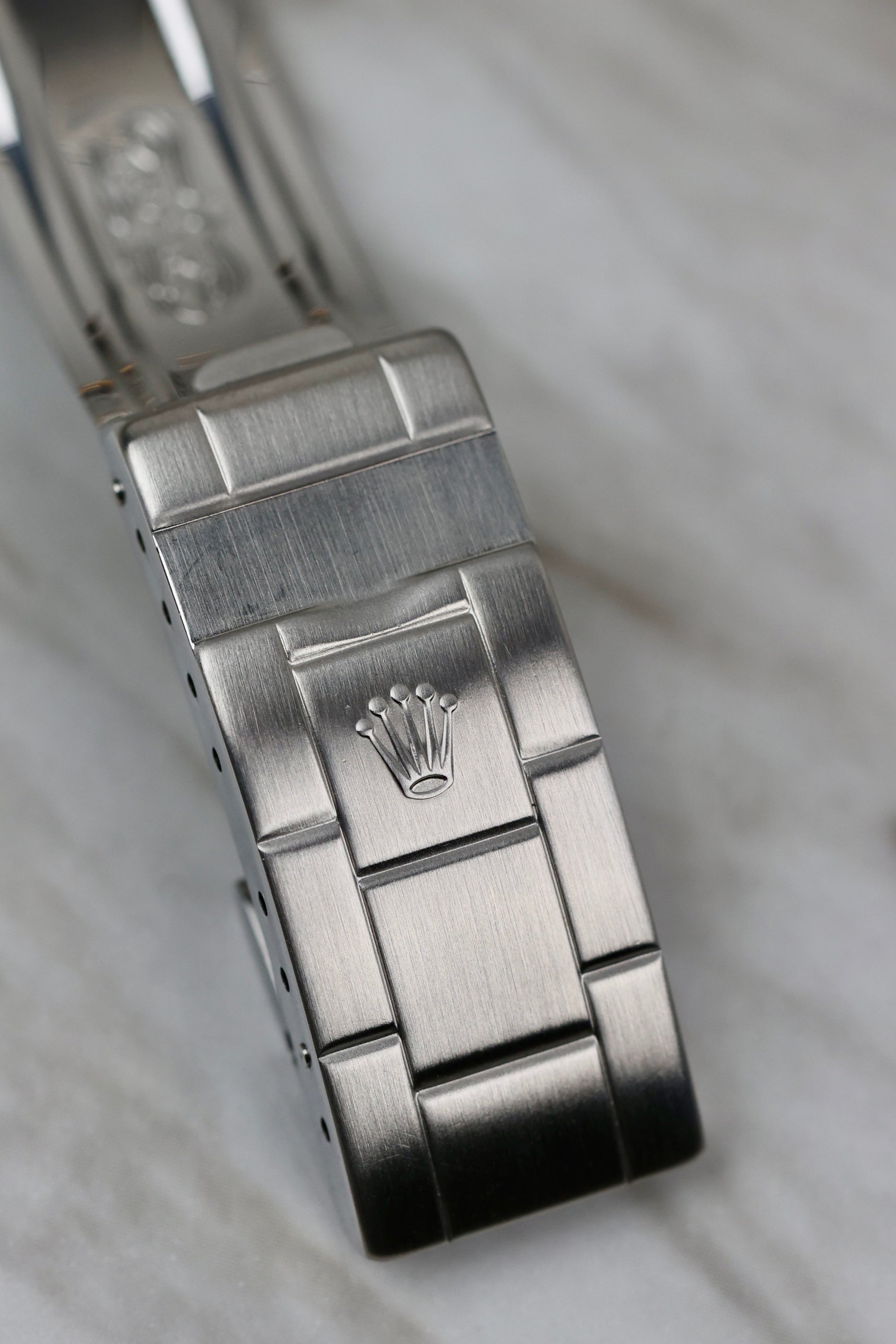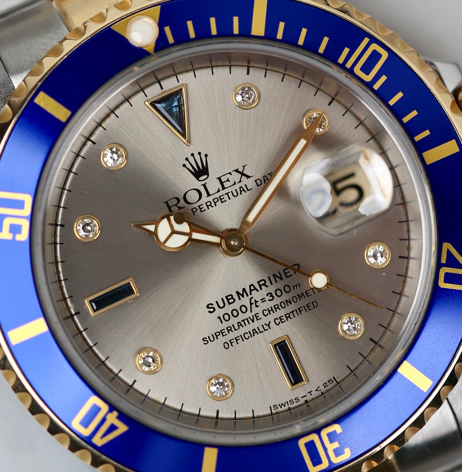 Produced from 1988 to around 2010, this two-tone Submariner stands out with its rare Serti dial, a (factory-set) configuration featuring diamond and sapphire hour markers. It’s a watch that mixes rugged dive specs with just the right amount of flash. The 16613 was also one of the last Submariners to feature the classic slimmer case and aluminum bezel, making it a fan favorite among collectors today. This example also features an extendable clasp so you can wear it comfortably over a wetsuit.