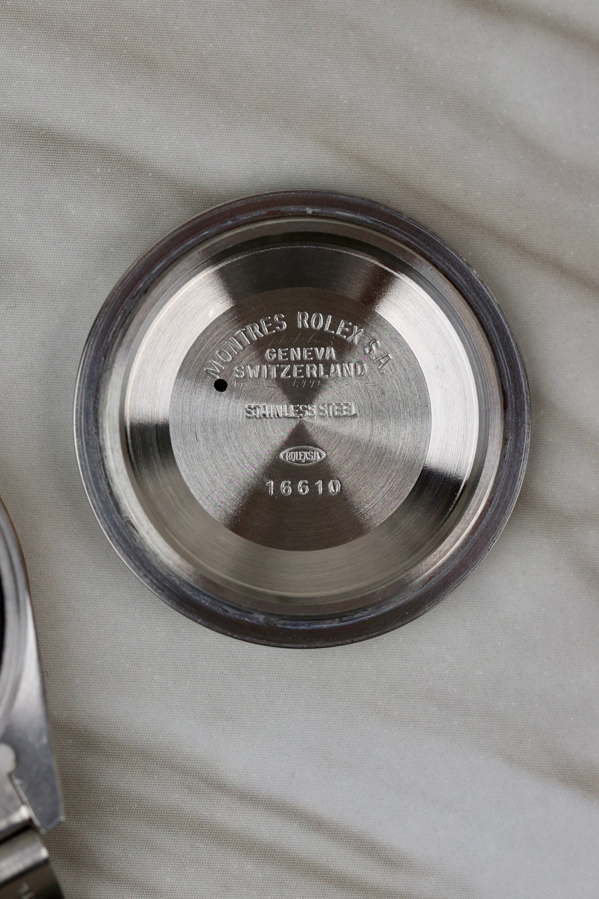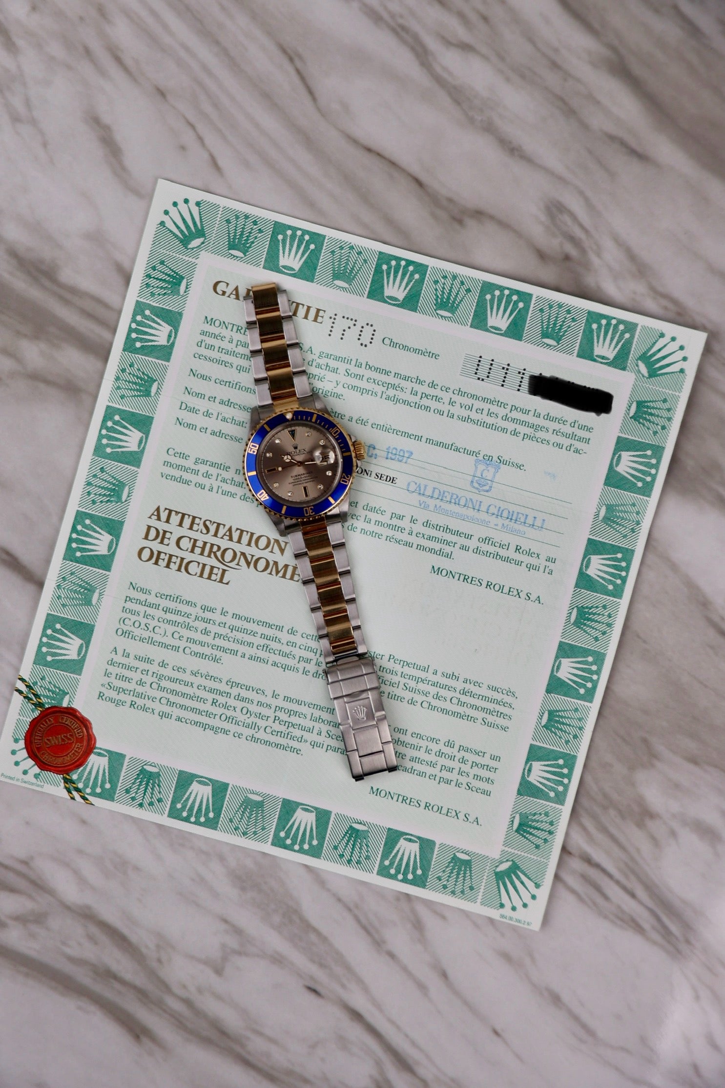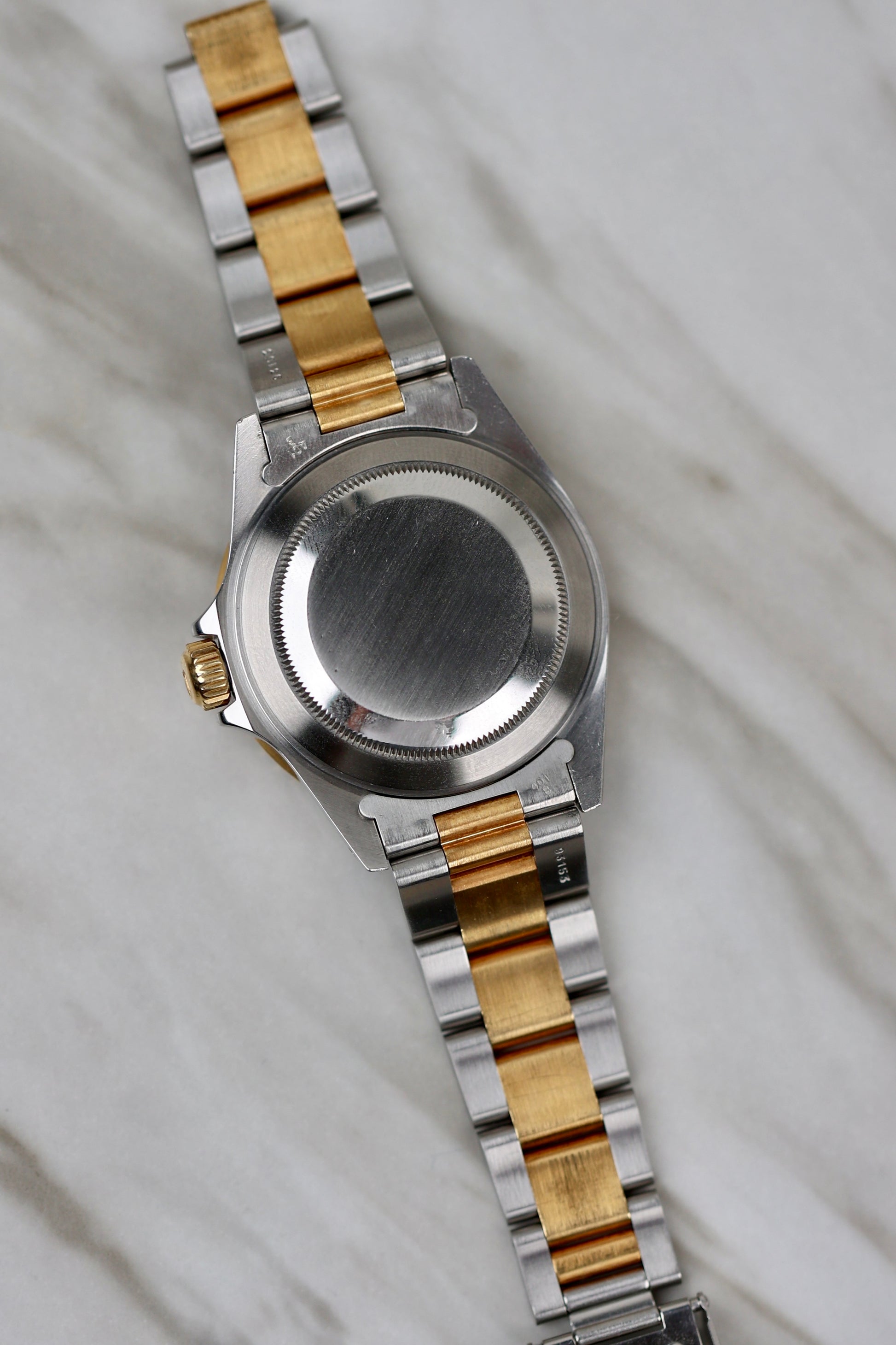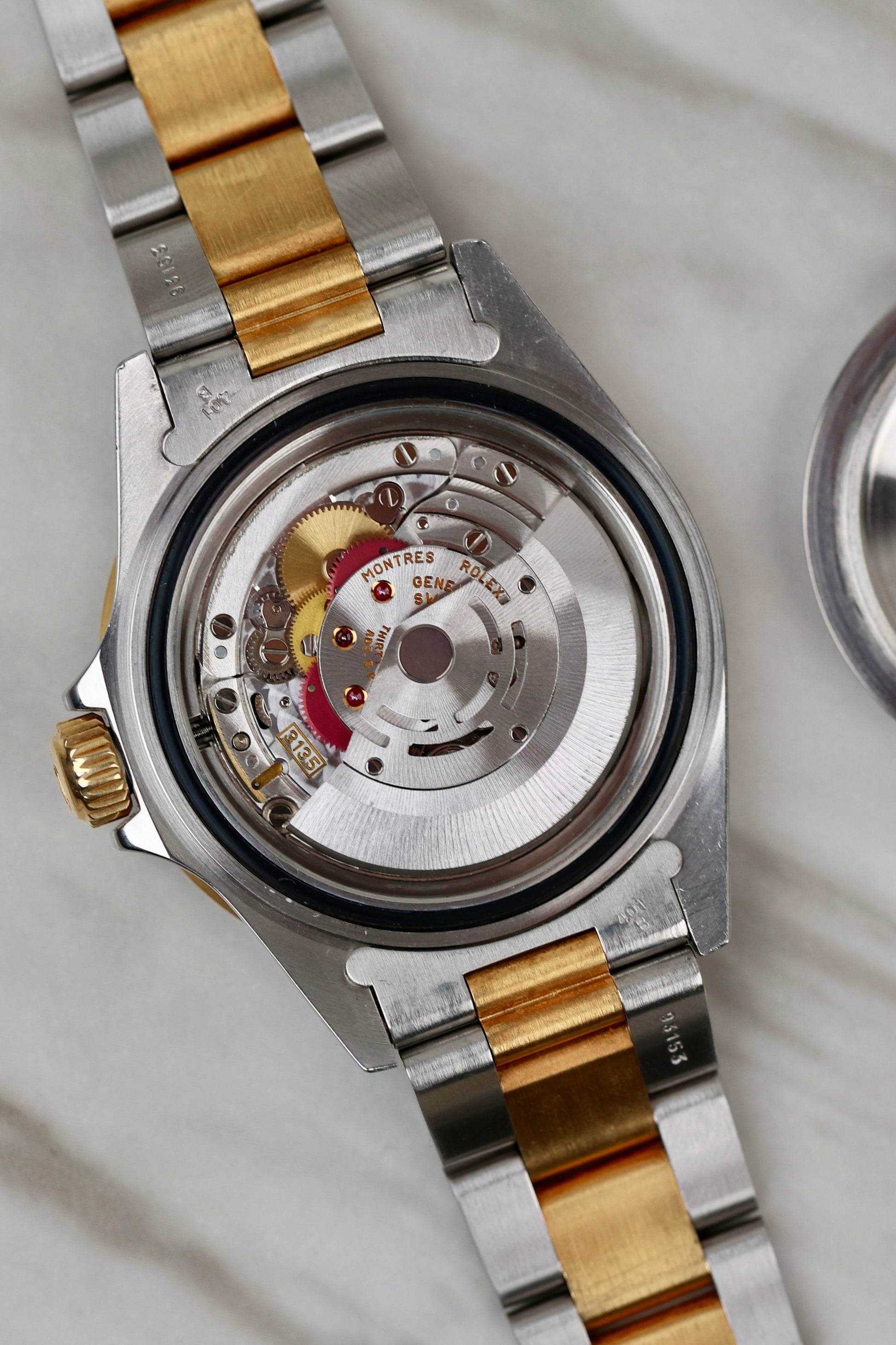 Produced from 1988 to around 2010, this two-tone Submariner stands out with its rare Serti dial, a (factory-set) configuration featuring diamond and sapphire hour markers. It’s a watch that mixes rugged dive specs with just the right amount of flash. The 16613 was also one of the last Submariners to feature the classic slimmer case and aluminum bezel, making it a fan favorite among collectors today. This example also features an extendable clasp so you can wear it comfortably over a wetsuit.