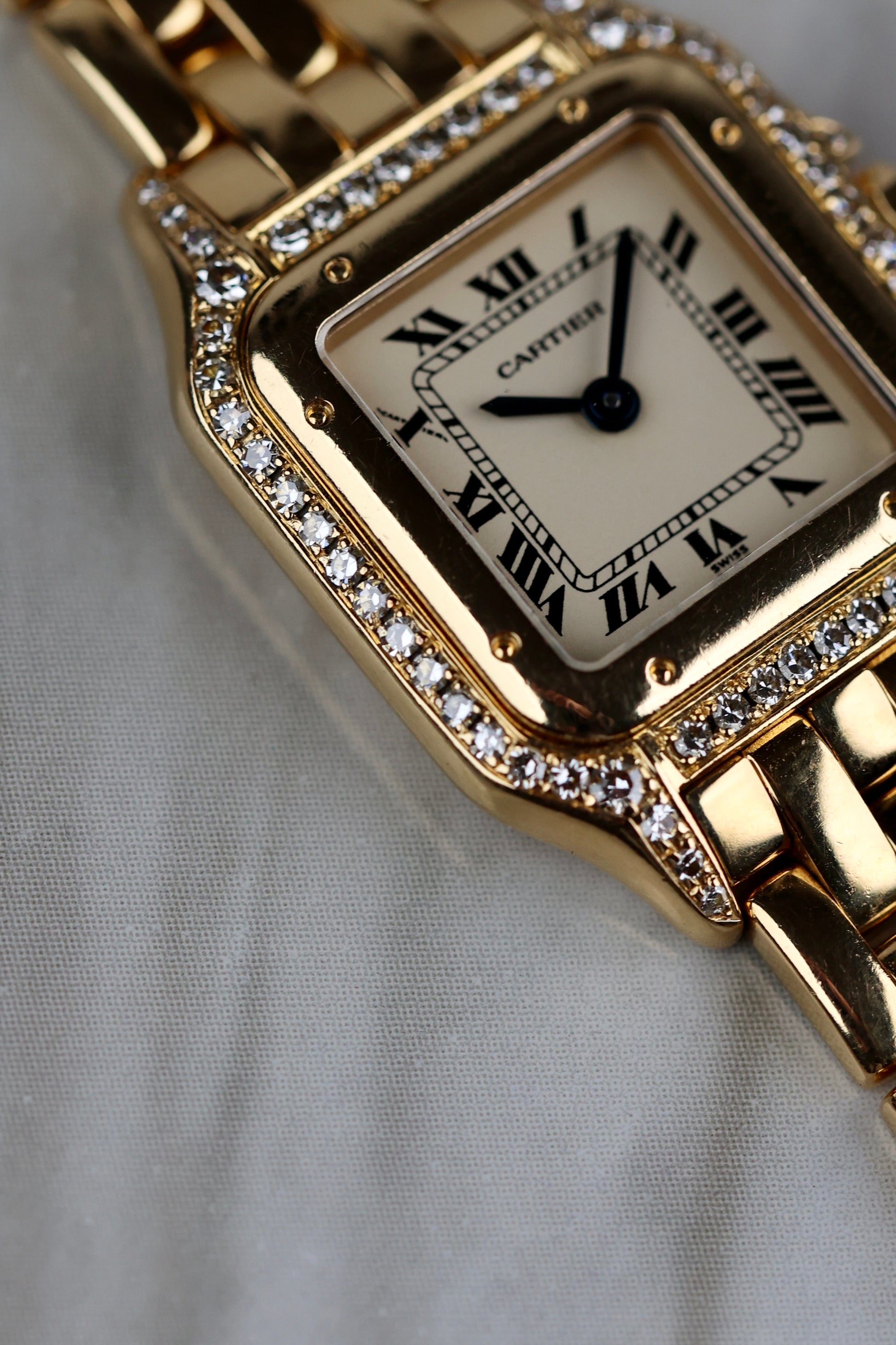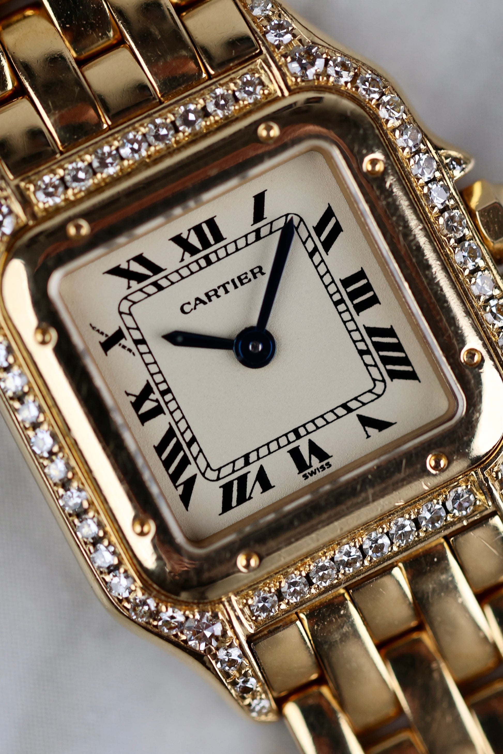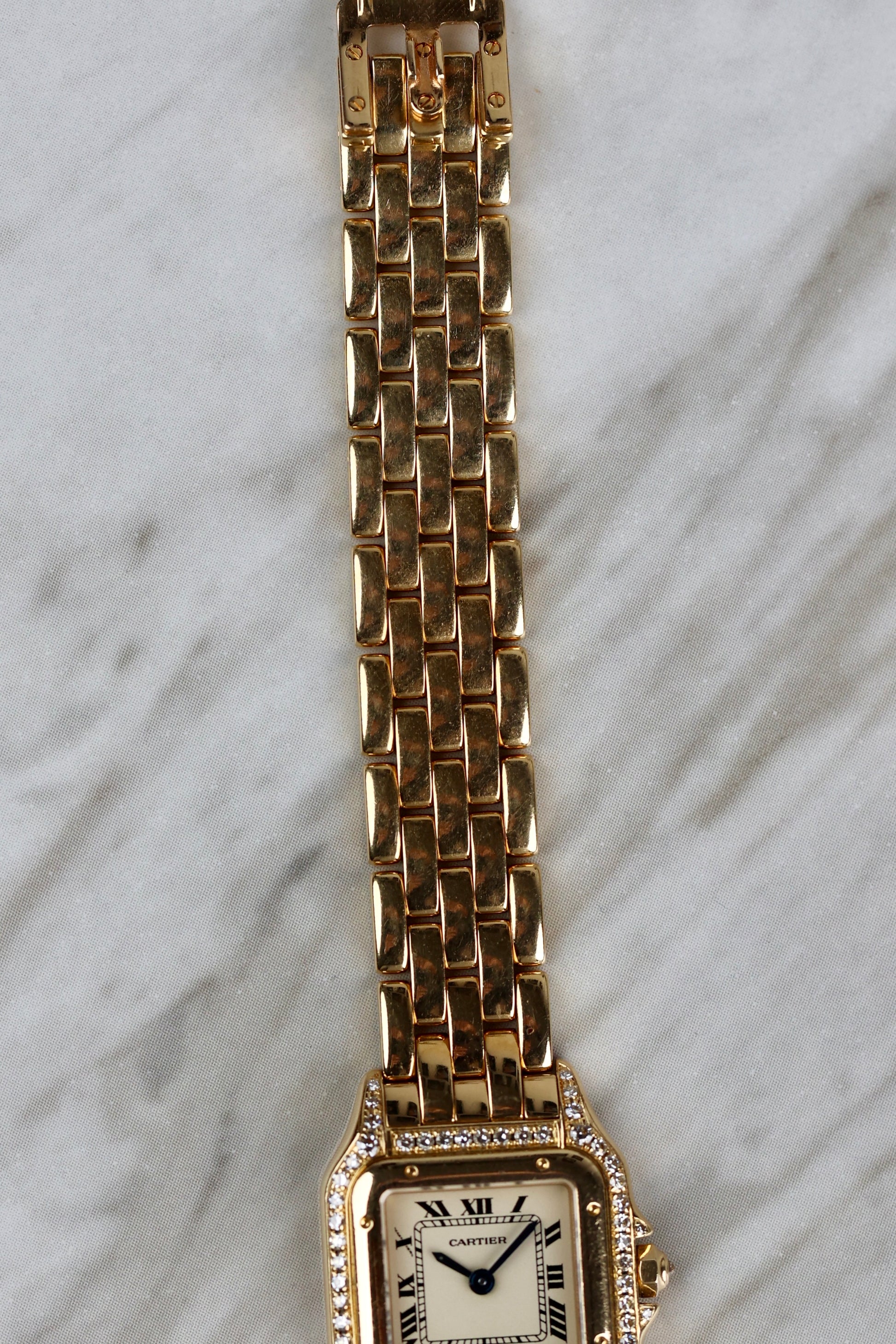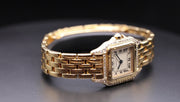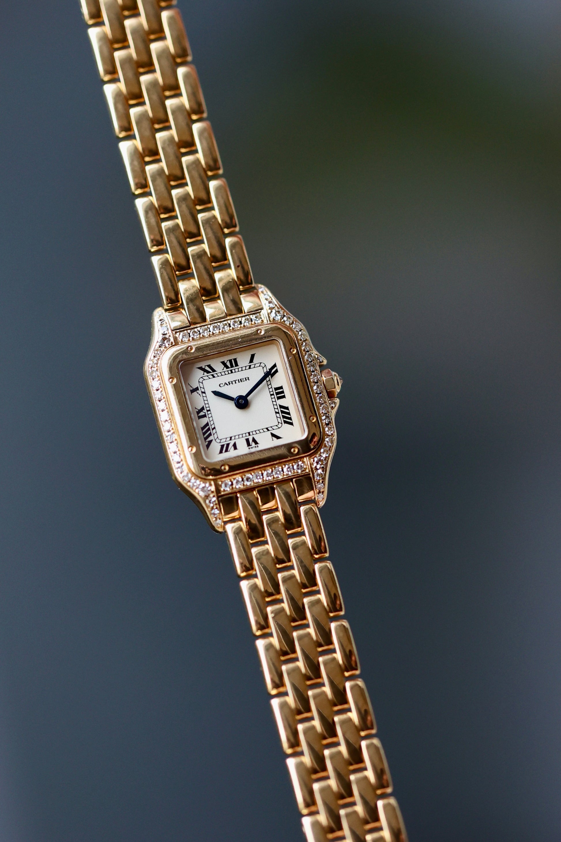Cartier Panthère in solid 18k yellow gold, a classic that defined luxury in the 1980s and still turns heads today. This model captures the spirit of an era when watches were as much about style as timekeeping. With its fluid five-link bracelet and elegant square case, it wears like a piece of fine jewelry.