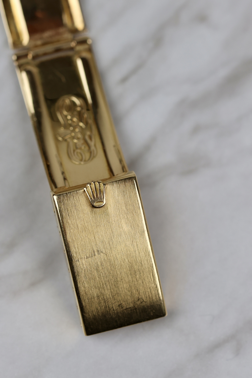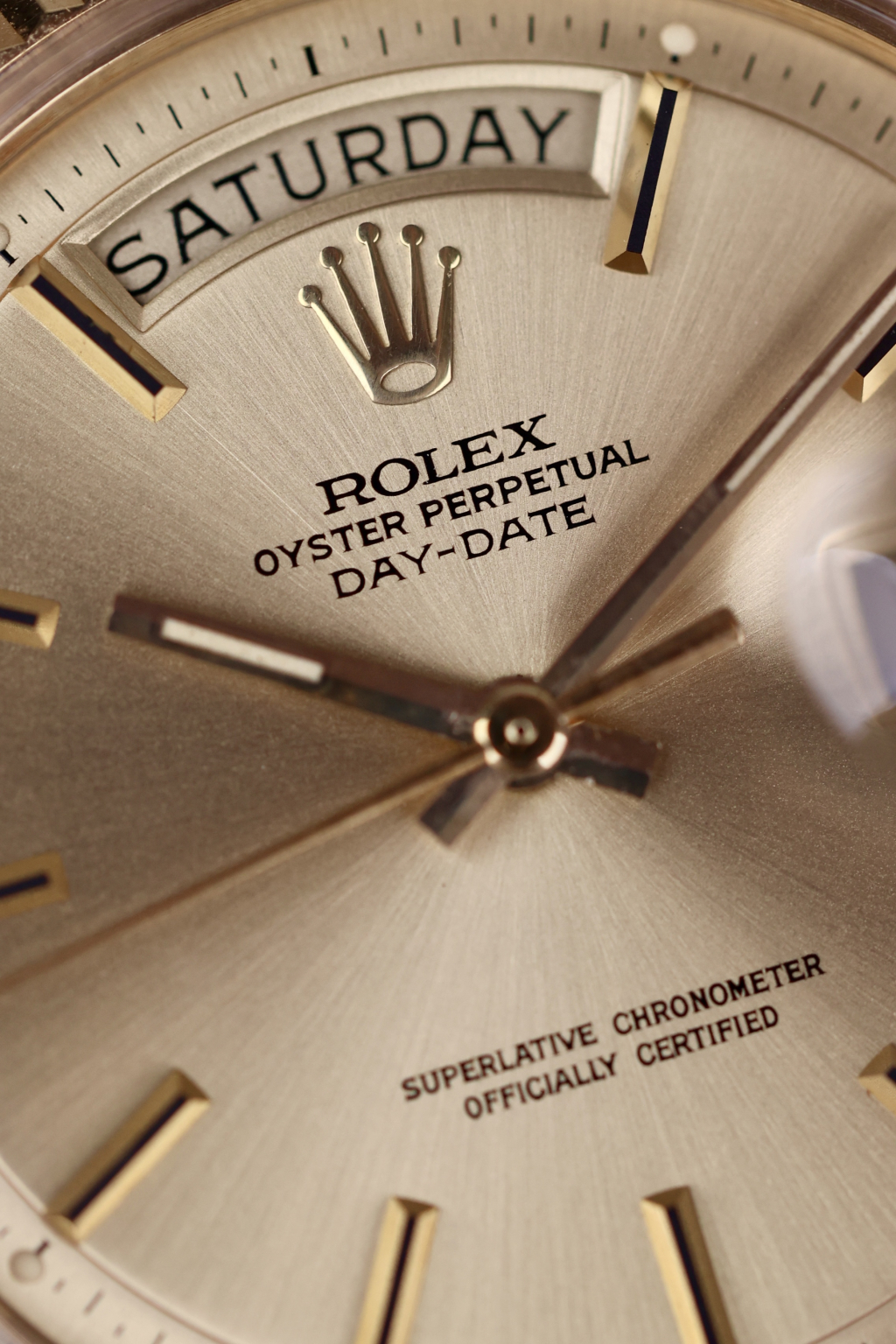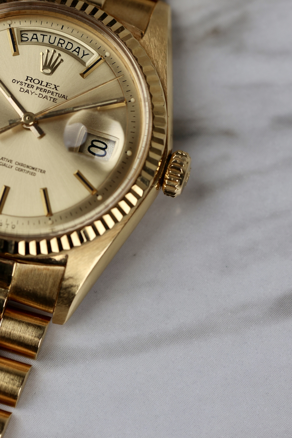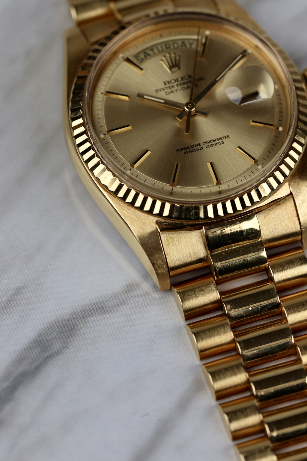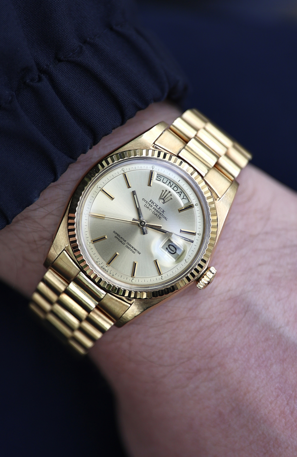 At first glance, this might look like your classic 1803—fluted bezel, sharp pie-pan dial, and that unmistakable Day-Date presence. But look closer, and you’ll spot something that makes collectors lean in: a “Made in Japan” President bracelet. Back in the day, Japan slapped heavy import taxes on fully assembled Swiss watches. Rolex, never one to lose a sale, pulled a clever move—ship the heads only, and have the bracelets made locally. The result? A small batch of Day-Dates fitted with Japanese-made President bracelets. Identical in style, but stamped with a different origin story. The rounded dial on this one keeps things soft and elegant, pairing beautifully with the warm tone of the vintage gold case. Inside ticks the trusty automatic Caliber 1556—no quickset, but all soul. This isn’t just a Day-Date. It’s a quiet piece of Rolex history disguised as a wristwatch. And unless someone knows what they’re looking at, they’ll never guess why it’s so rare.