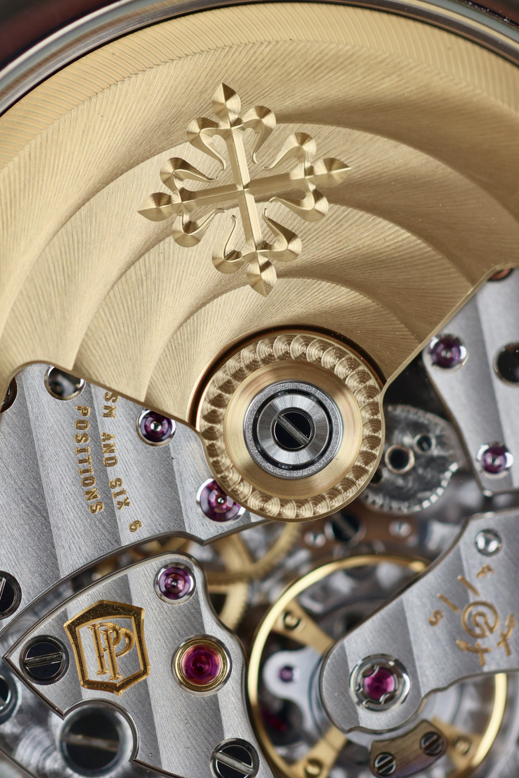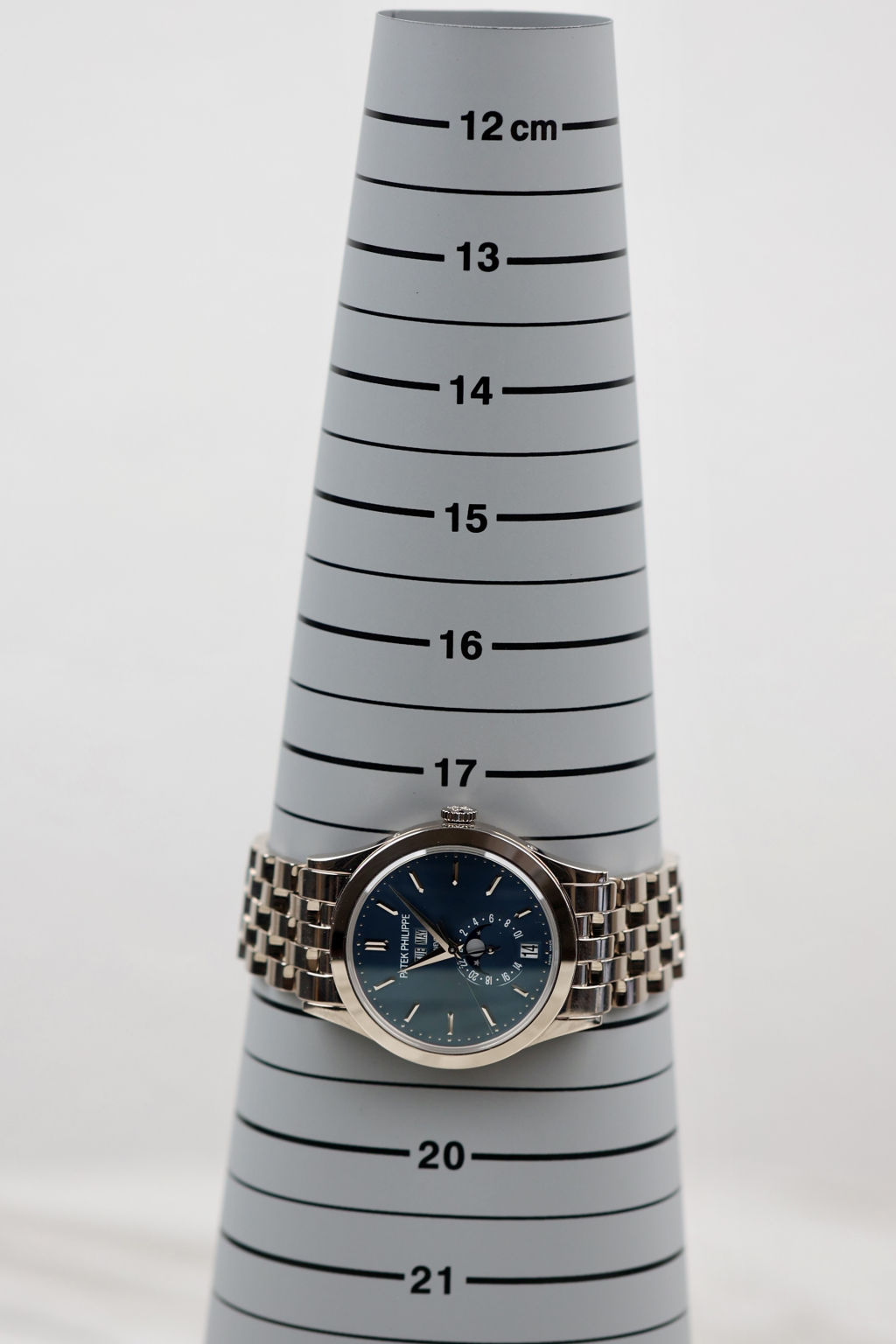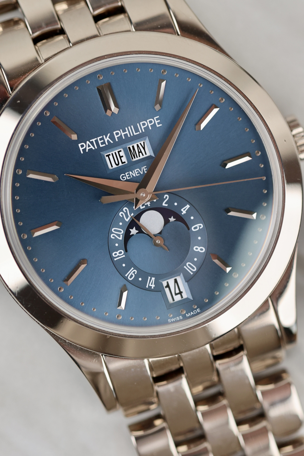 This Patek doesn’t shout—it nods. The 5396/1G-001 is dressed head-to-toe in 18k white gold, with a rich blue sunburst dial that says, “I read complicated books... and also know what day it is.” The calendar layout is perfectly balanced: day and month up top, moonphase and date below, all powered by Patek’s clever Caliber 324 that only needs correcting once a year (lazy, but in a genius kind of way).