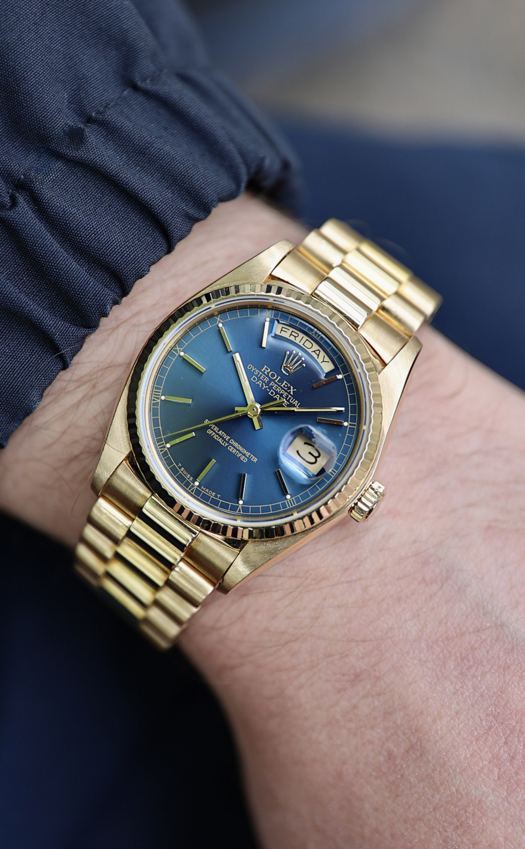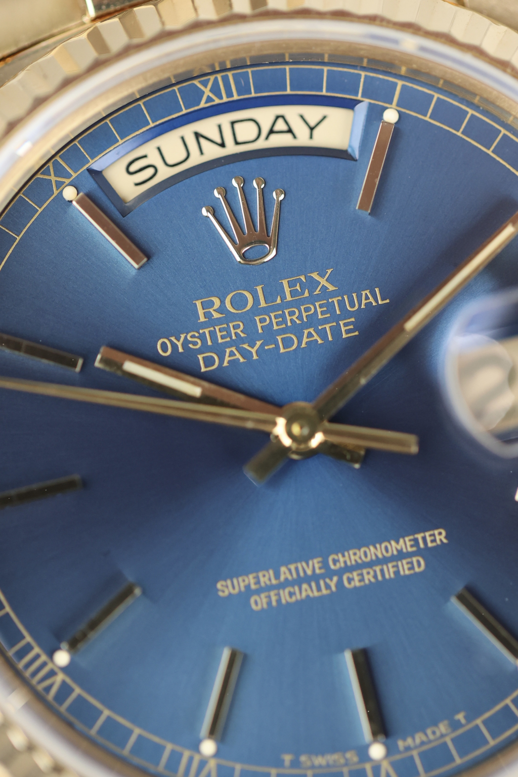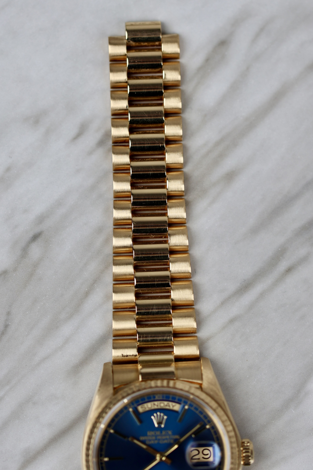 This one’s got the kind of blue that stops traffic. The 18038 Day-Date is no stranger to yellow gold and big boss energy, but toss in this rare deep blue dial, and suddenly it’s not just presidential, it’s borderline royal. Produced in 1981, this piece comes from a time when Rolex didn’t hand out colored dials like candy. Housed in an 18k yellow gold case with a fluted bezel that catches light like it’s trying to make a point. The automatic Caliber 3055 ticks away inside. The bracelet? Solid President. The vibe? Quiet luxury, but louder than it looks. These blue dials barely pop up, and when they do, collectors usually don’t blink. A sharp case, rare dial, and just enough patina to prove it's lived.