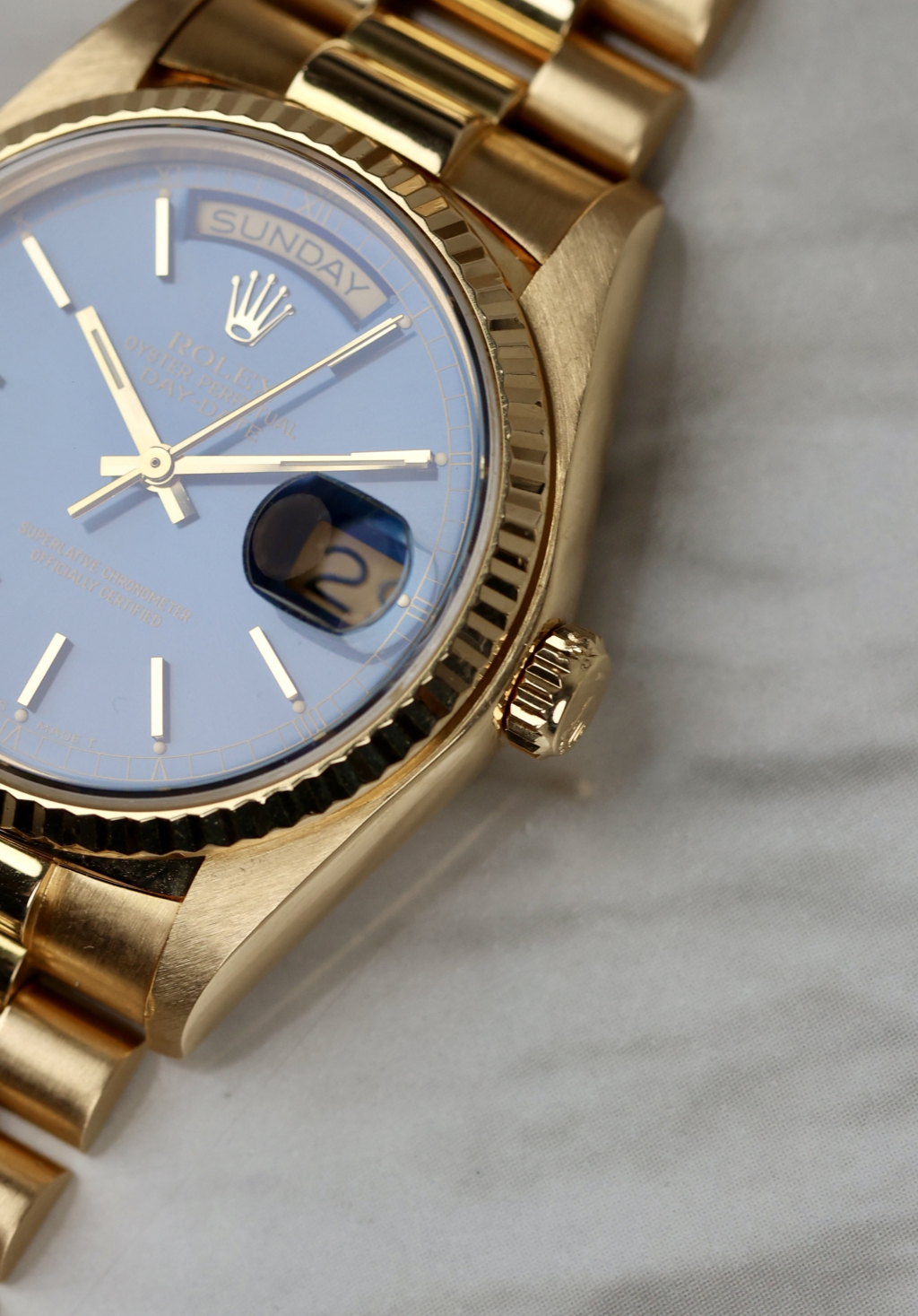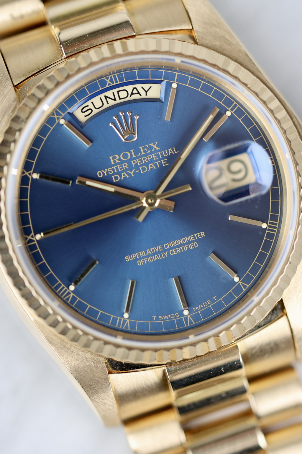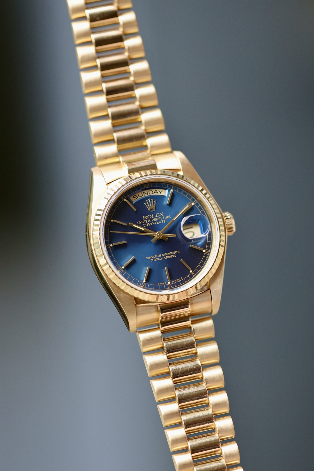 This one’s got the kind of blue that stops traffic. The 18038 Day-Date is no stranger to yellow gold and big boss energy, but toss in this rare deep blue dial, and suddenly it’s not just presidential, it’s borderline royal. Produced in 1981, this piece comes from a time when Rolex didn’t hand out colored dials like candy. Housed in an 18k yellow gold case with a fluted bezel that catches light like it’s trying to make a point. The automatic Caliber 3055 ticks away inside. The bracelet? Solid President. The vibe? Quiet luxury, but louder than it looks. These blue dials barely pop up, and when they do, collectors usually don’t blink. A sharp case, rare dial, and just enough patina to prove it's lived.